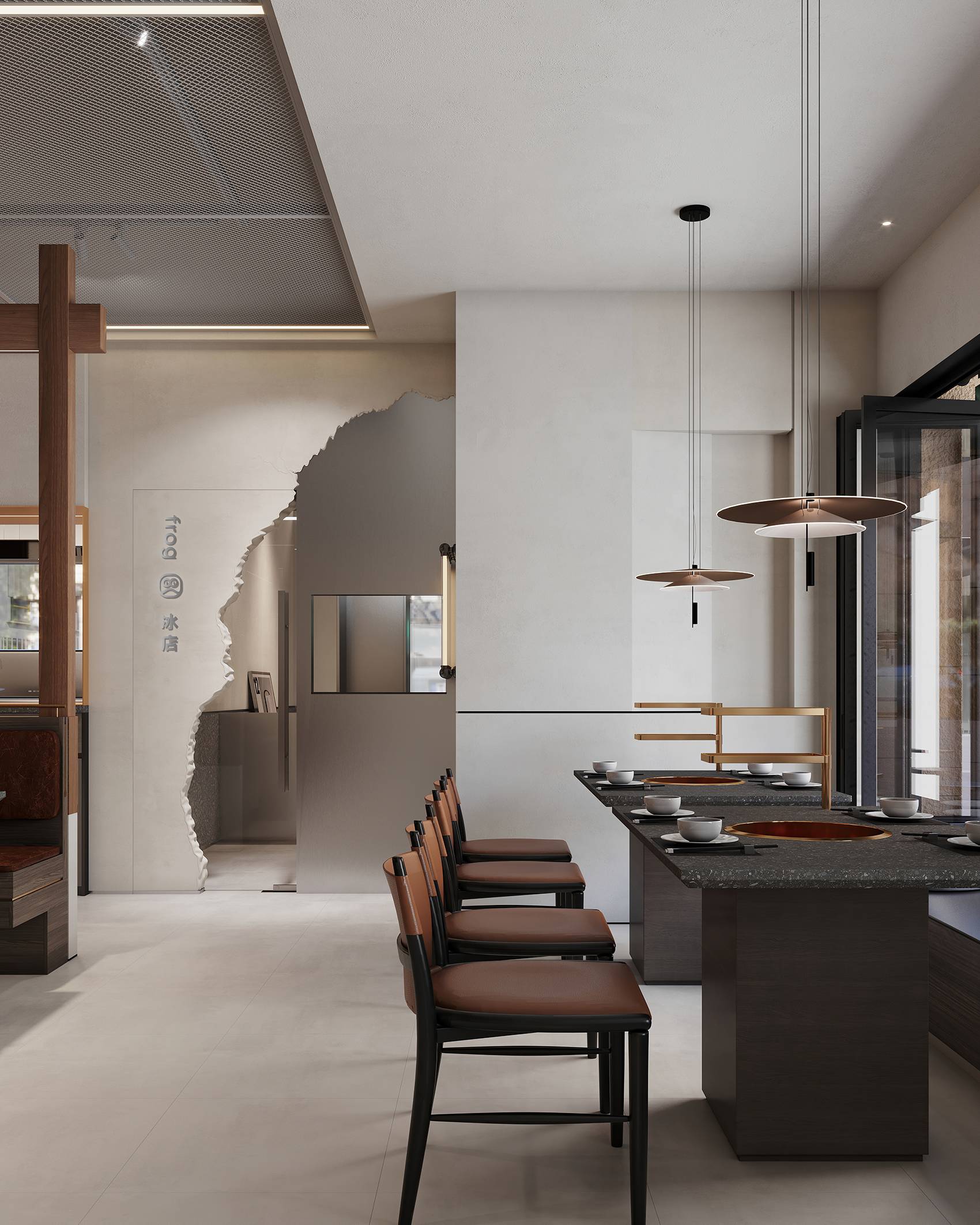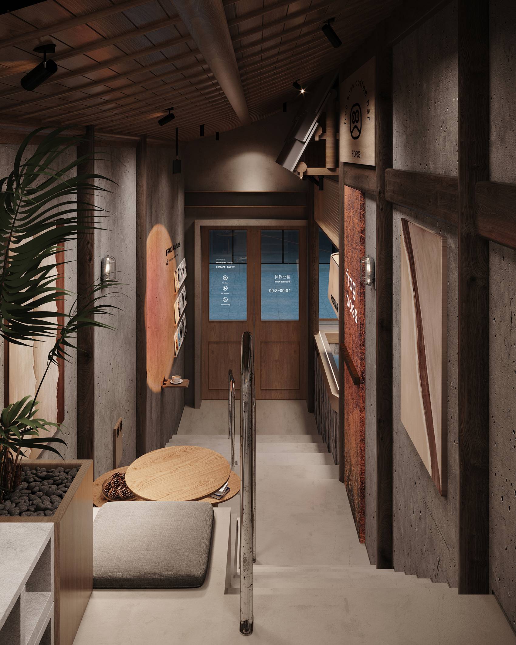在内部另设门头,将等候区与用餐区分隔开来,打造“店中店”的奇妙体验。全木质的设计,是温暖小资的氛围感,一侧是残破的墙垣,两者冲突碰撞,形成了独特感官体验。进入用餐区,延续着等候区的风格化设计,金属、木质、水泥等多种材质的融合,传达出舒适的工业感,点缀清新自然绿植,营造自由随意的氛围。