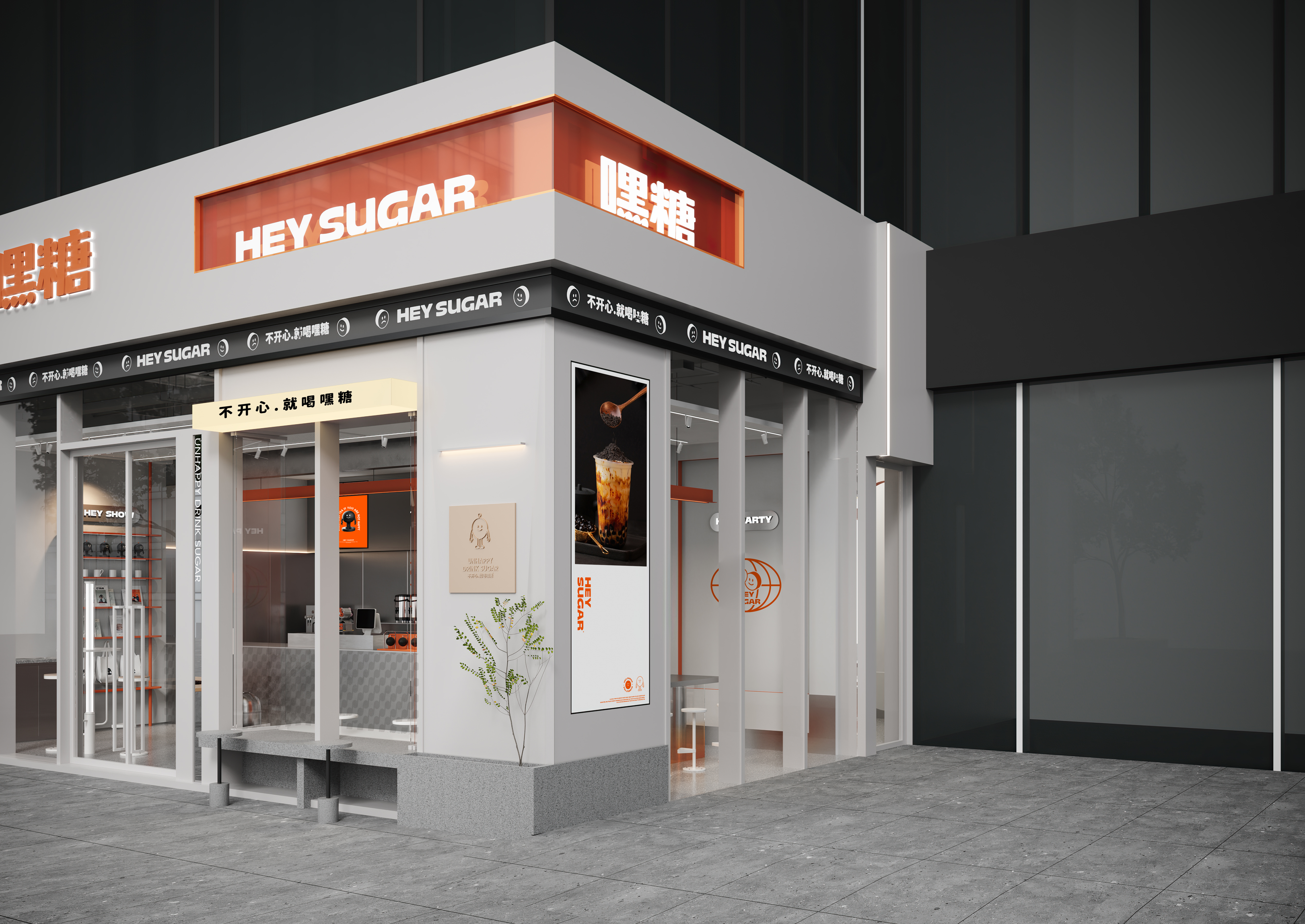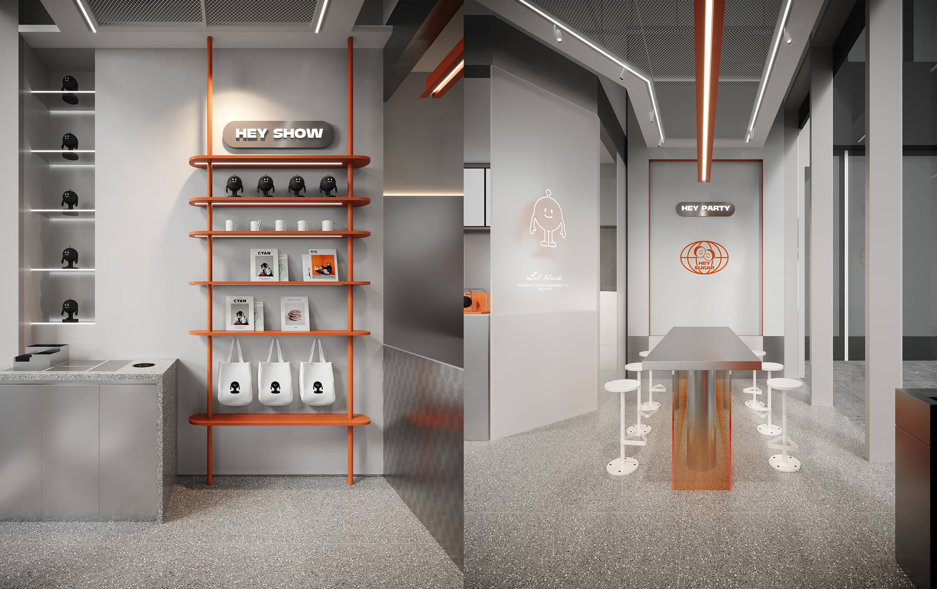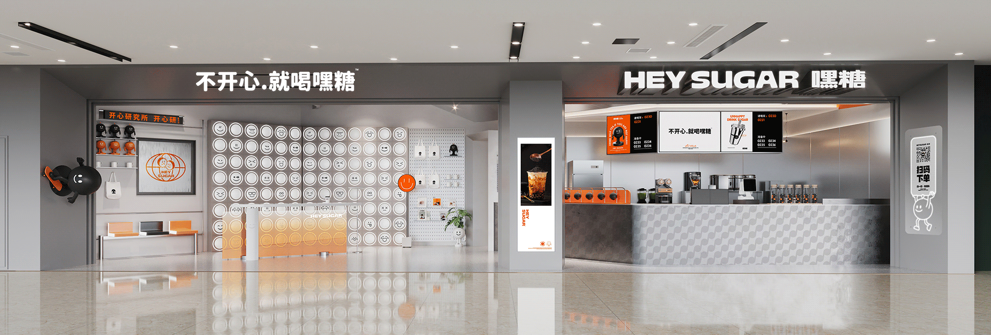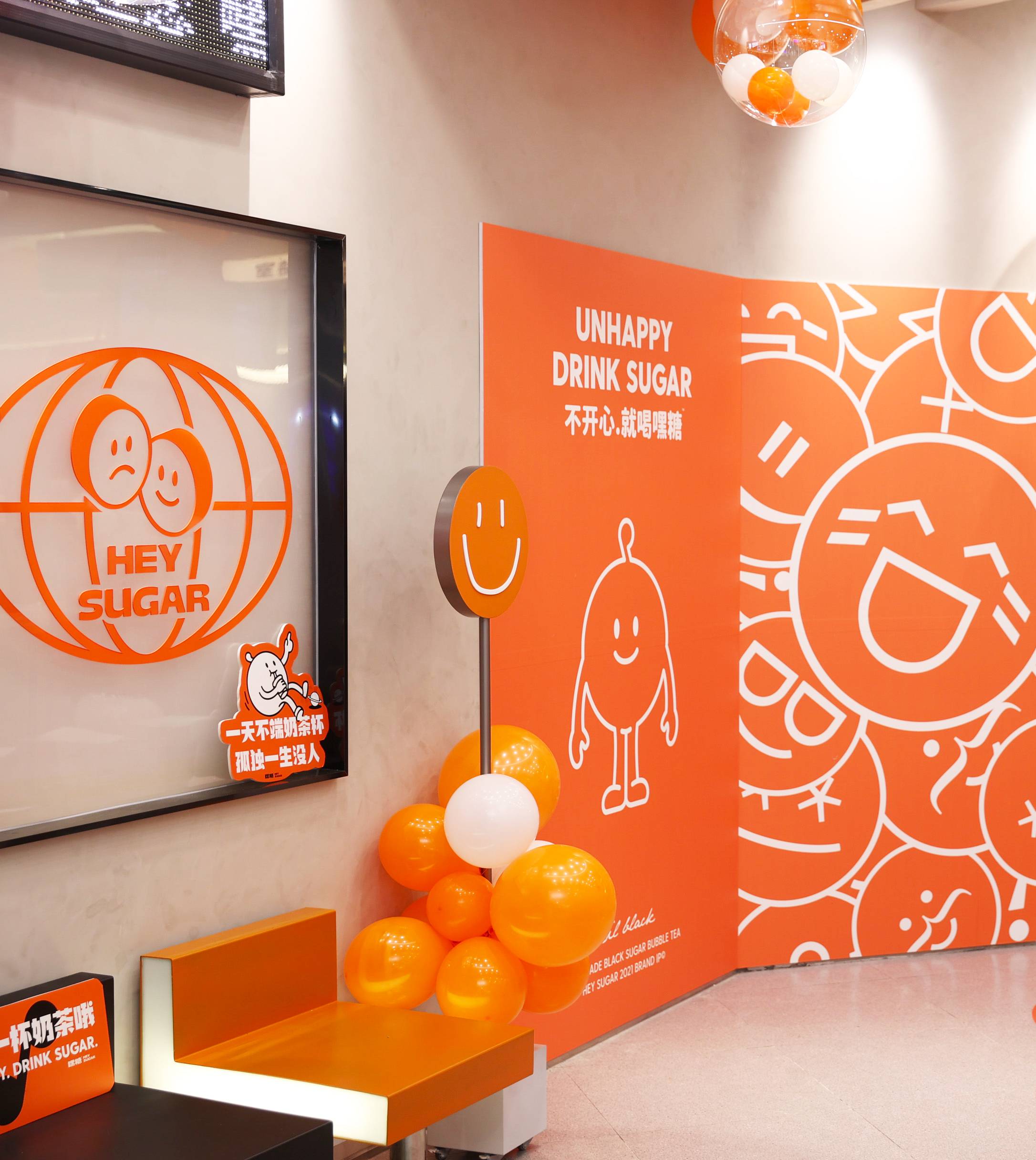 银色,利落而又充满了质感,与稳重的纯灰色搭配,两种不同灰度呈现,让空间形态充满了层次感。橙色,活泼趣味,是给人带去欢乐的颜色,白色,纯洁而又干净,与橙色搭配,给人轻松愉快的氛围,恰恰也对应了嘿糖的口号——"不开心,就喝嘿糖"。