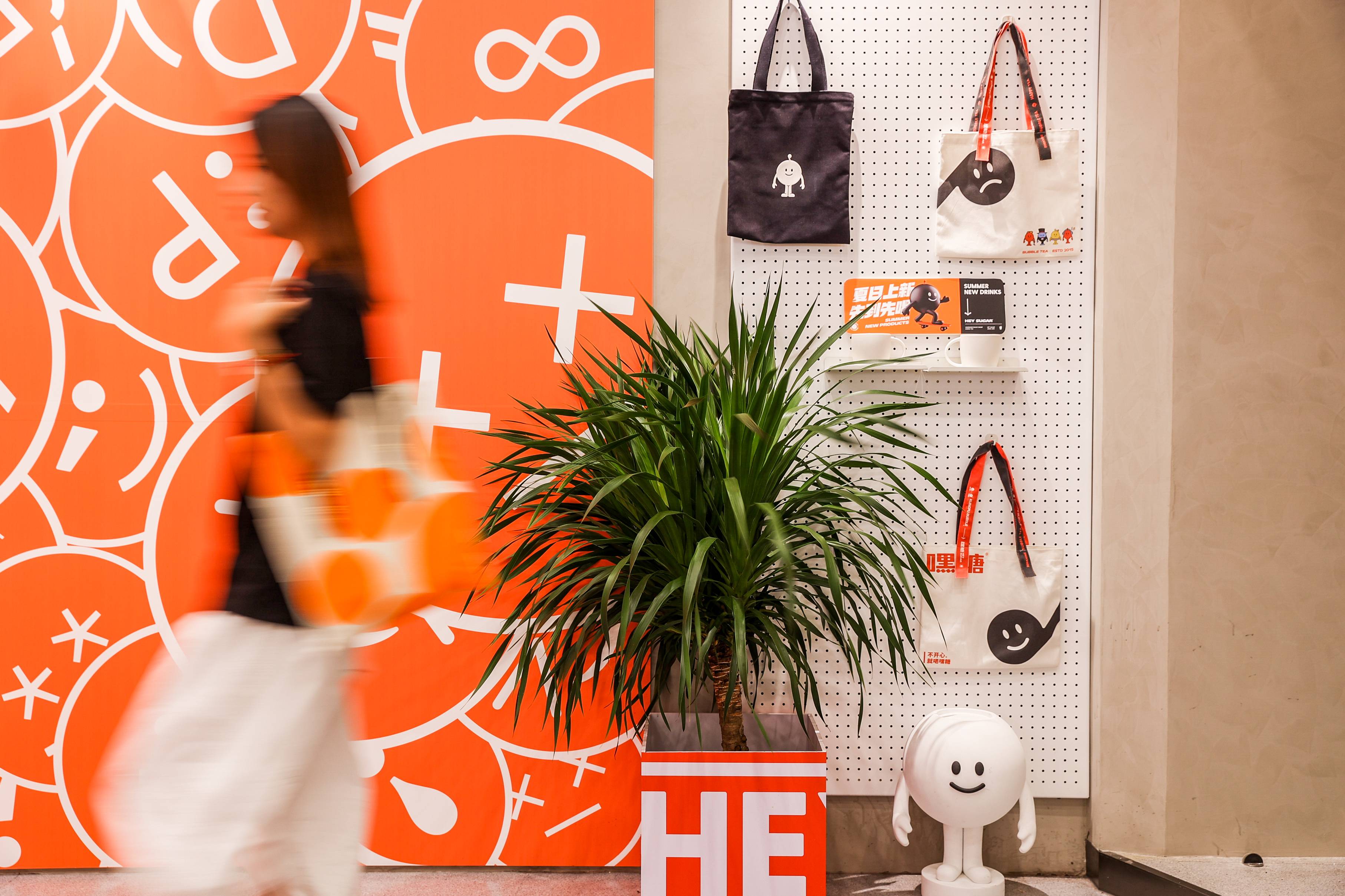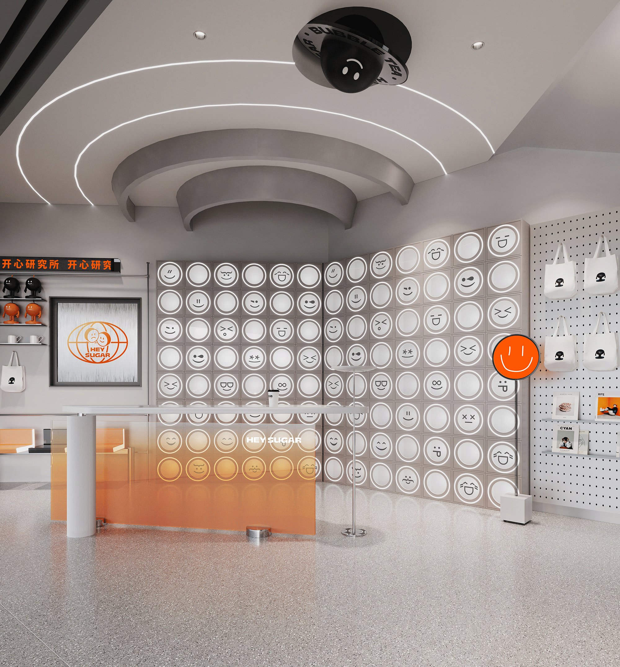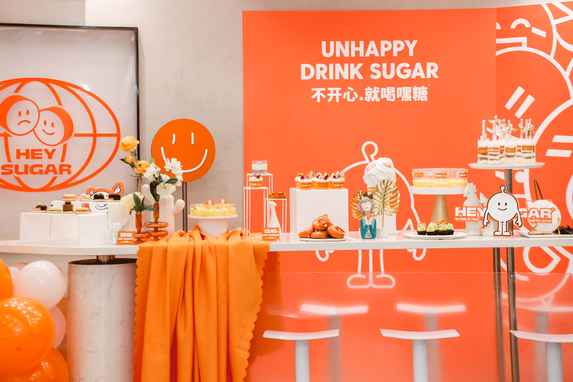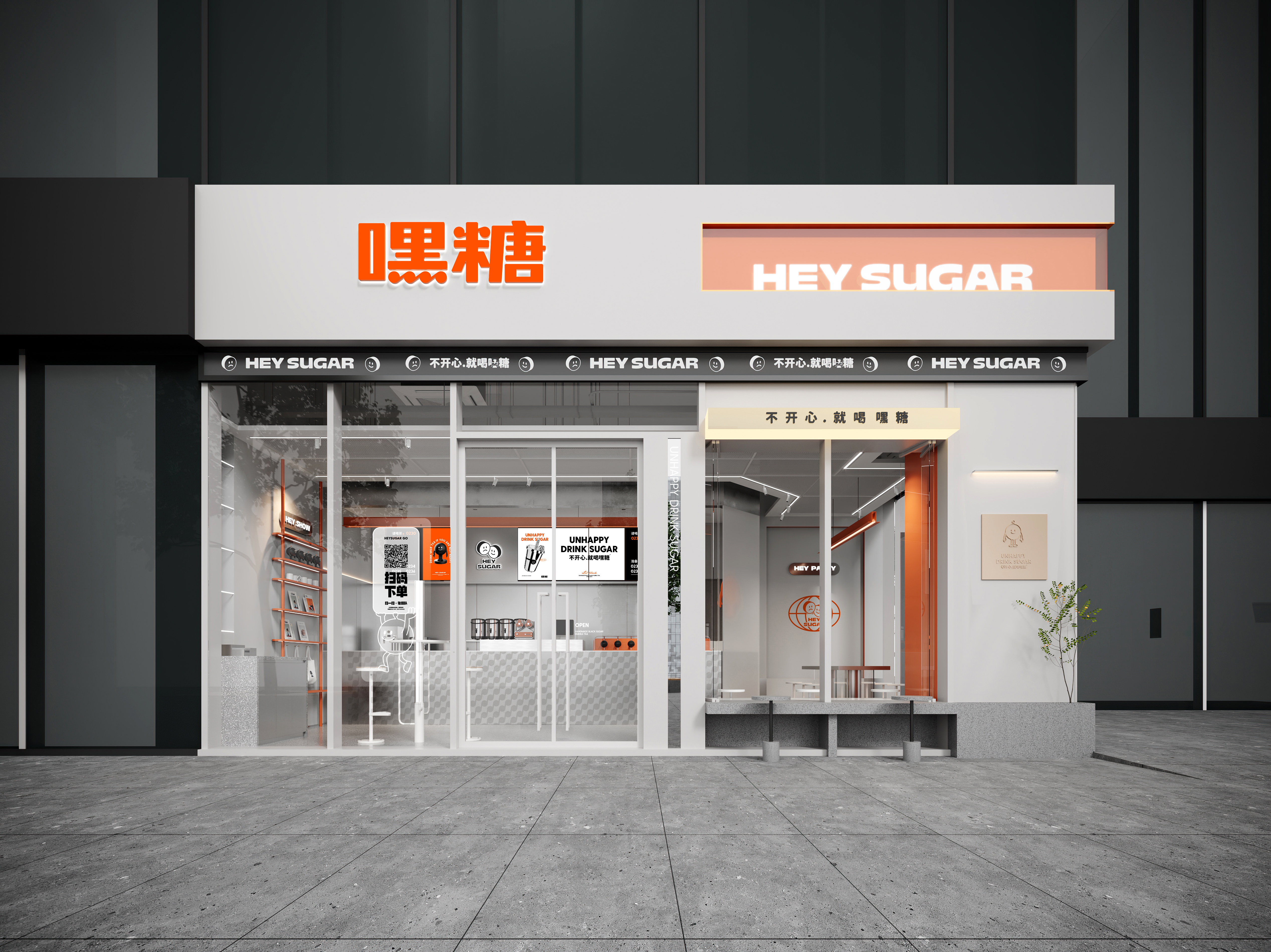 银色,利落而又充满了质感,与稳重的纯灰色搭配,两种不同灰度呈现,让空间形态充满了层次感。橙色,活泼趣味,是给人带去欢乐的颜色,白色,纯洁而又干净,与橙色搭配,给人轻松愉快的氛围,恰恰也对应了嘿糖的口号——"不开心,就喝嘿糖"。