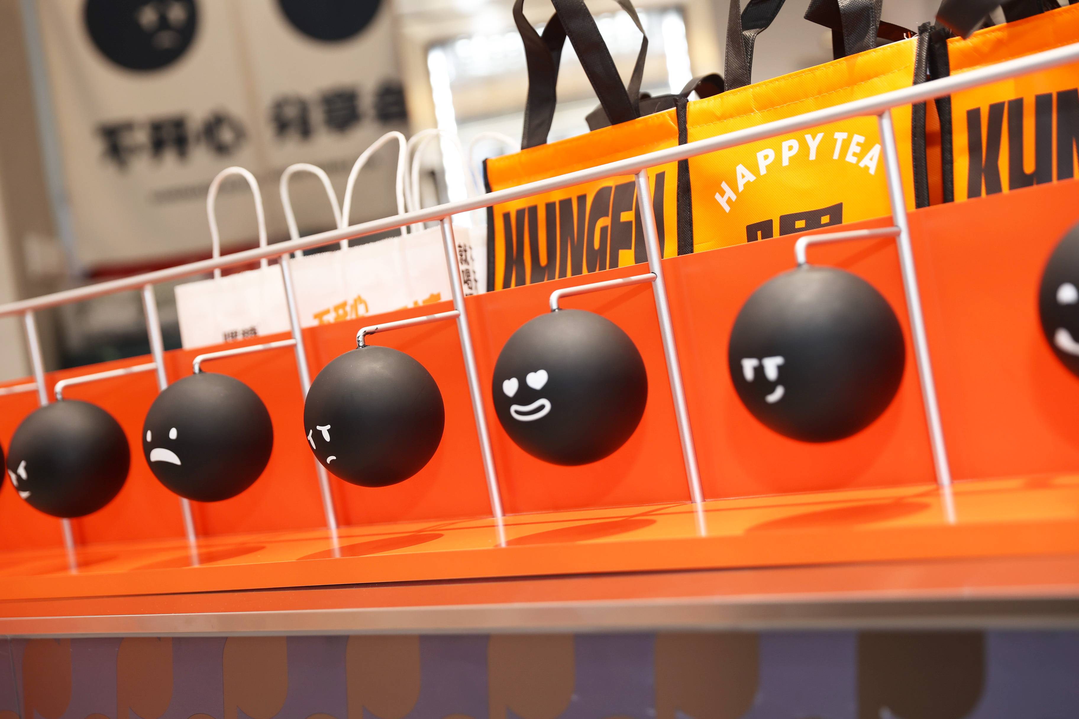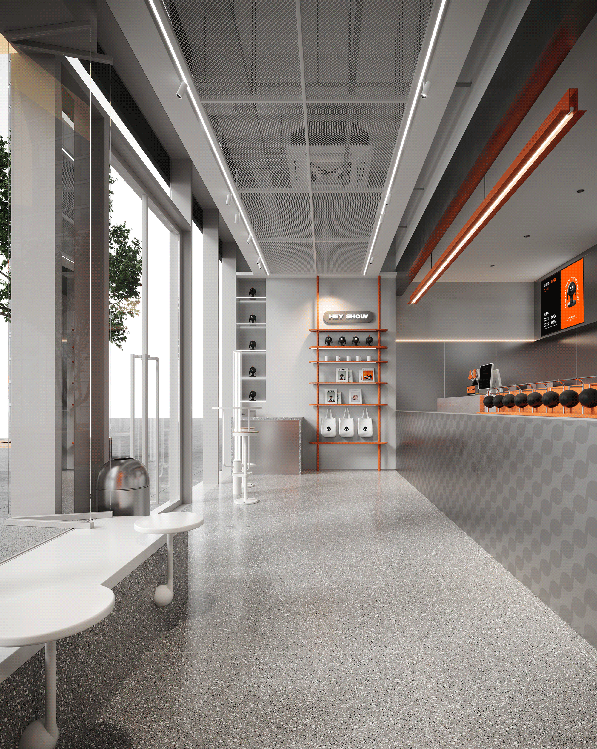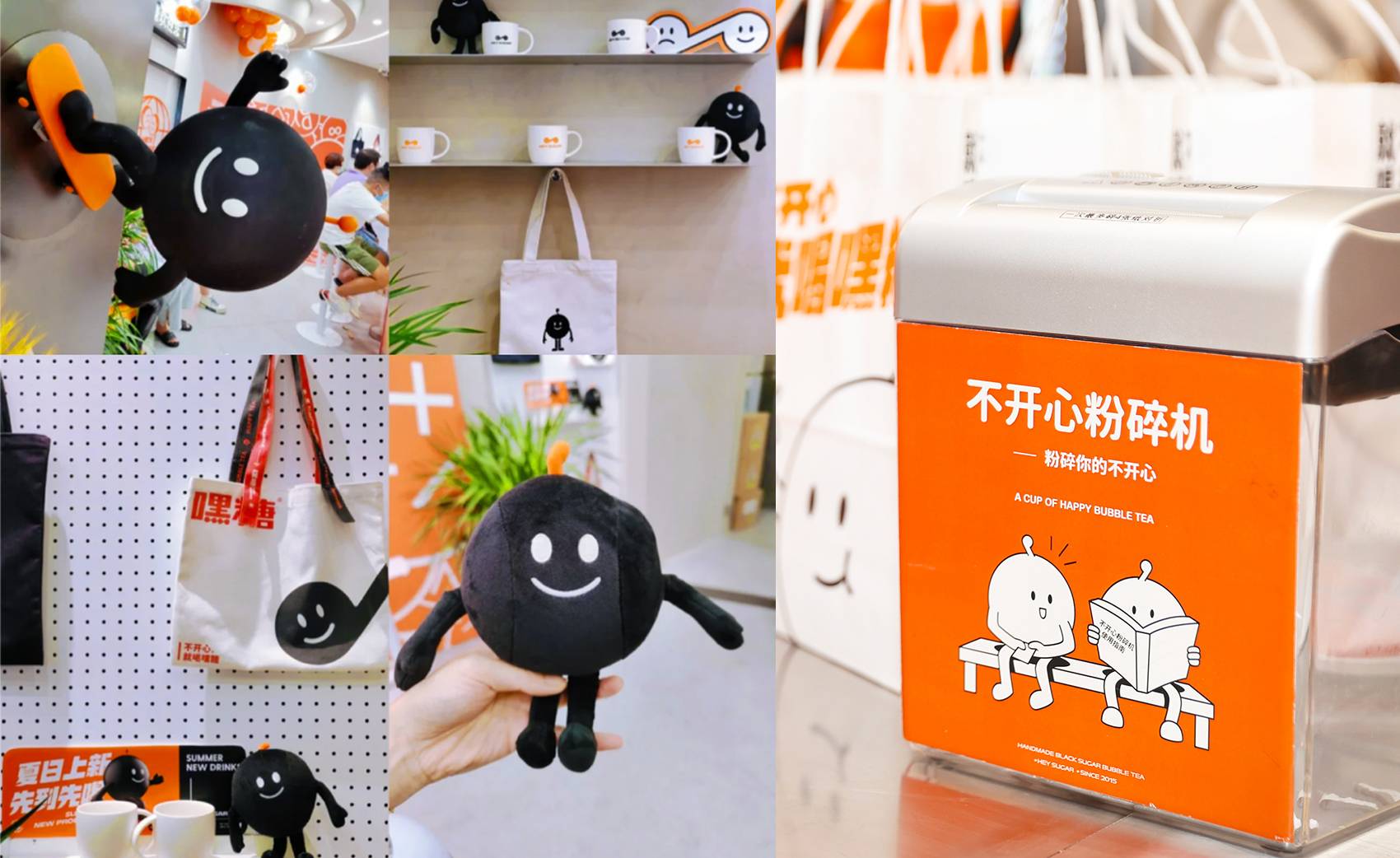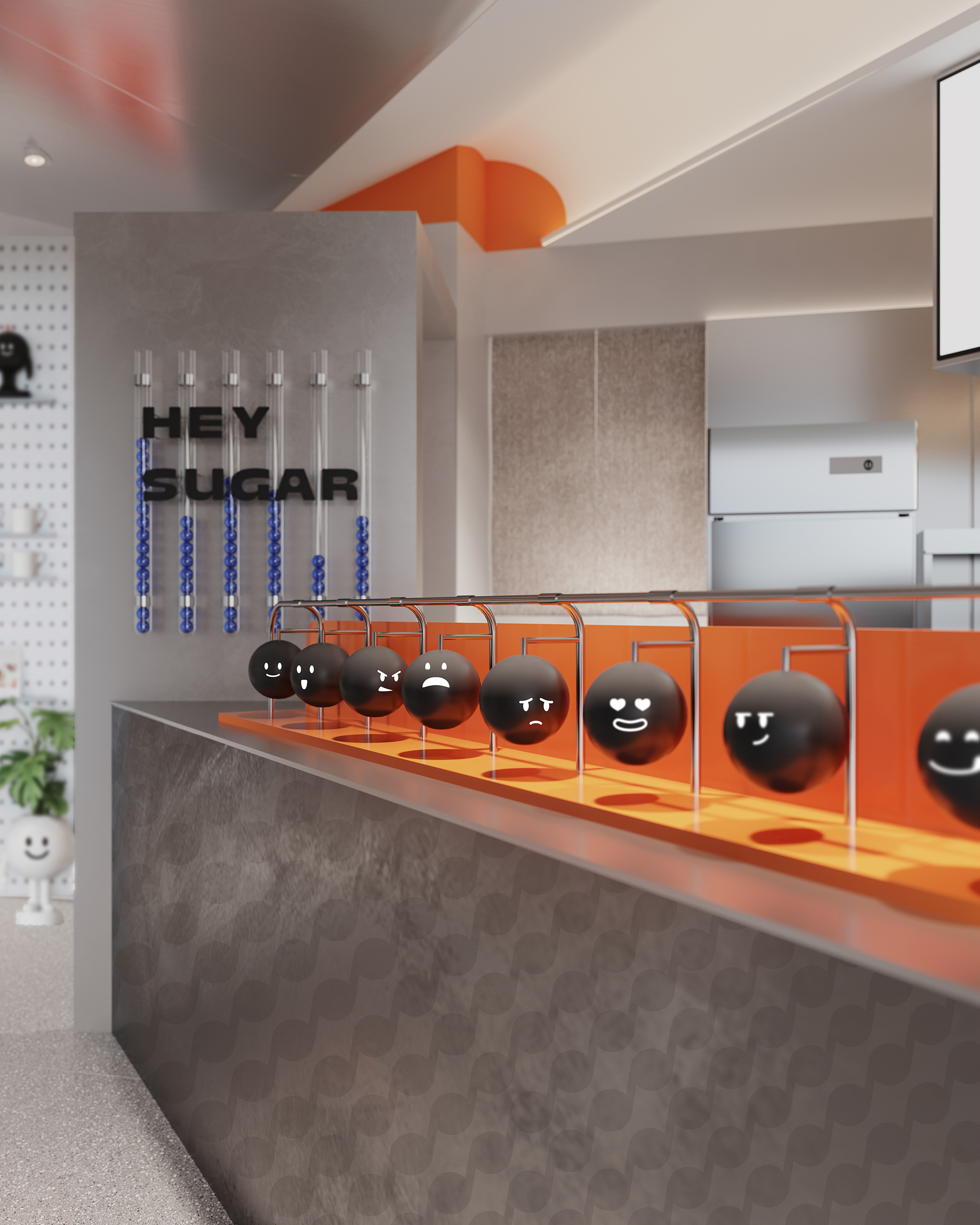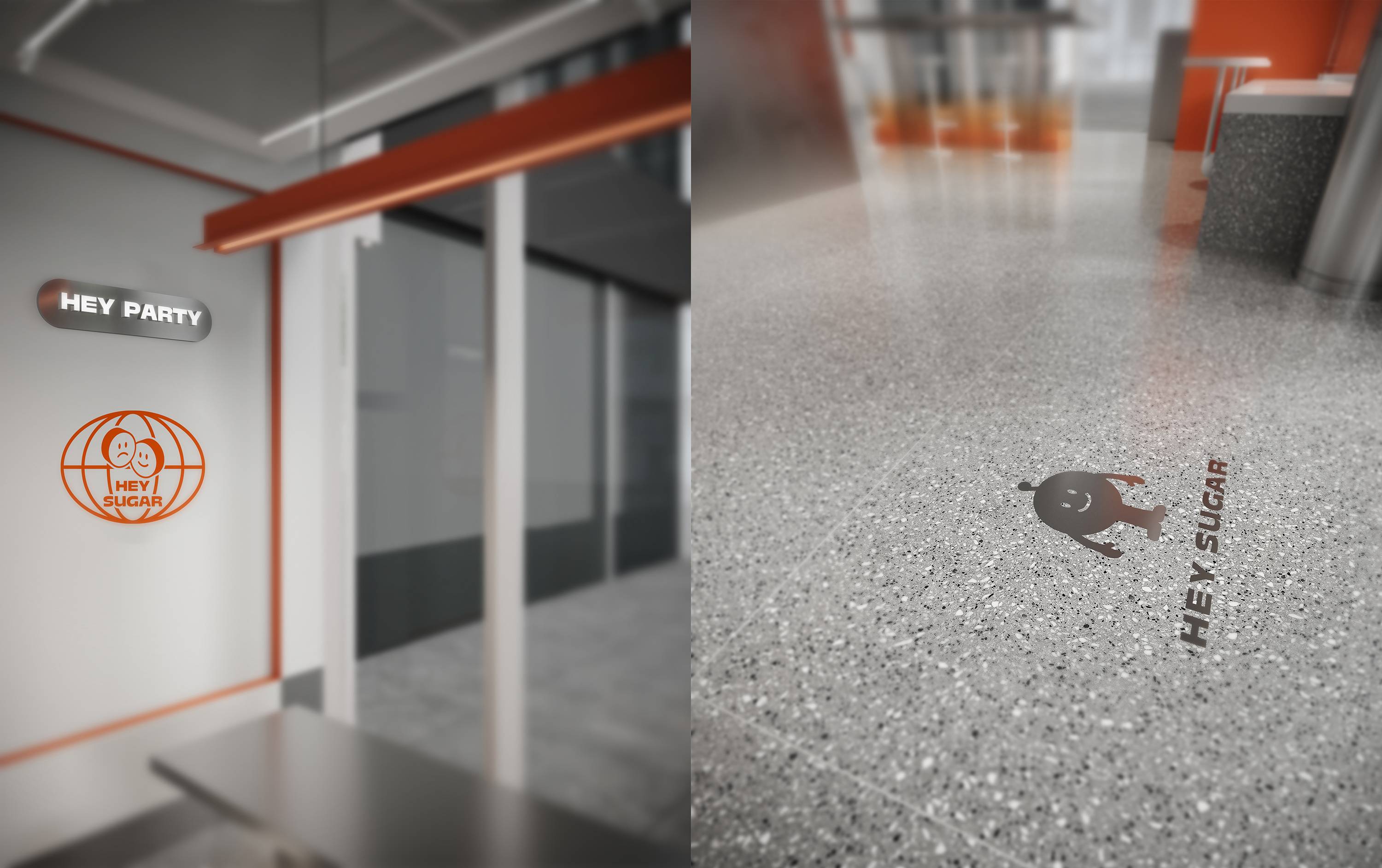银色,利落而又充满了质感,与稳重的纯灰色搭配,两种不同灰度呈现,让空间形态充满了层次感。橙色,活泼趣味,是给人带去欢乐的颜色,白色,纯洁而又干净,与橙色搭配,给人轻松愉快的氛围,恰恰也对应了嘿糖的口号——"不开心,就喝嘿糖"。
