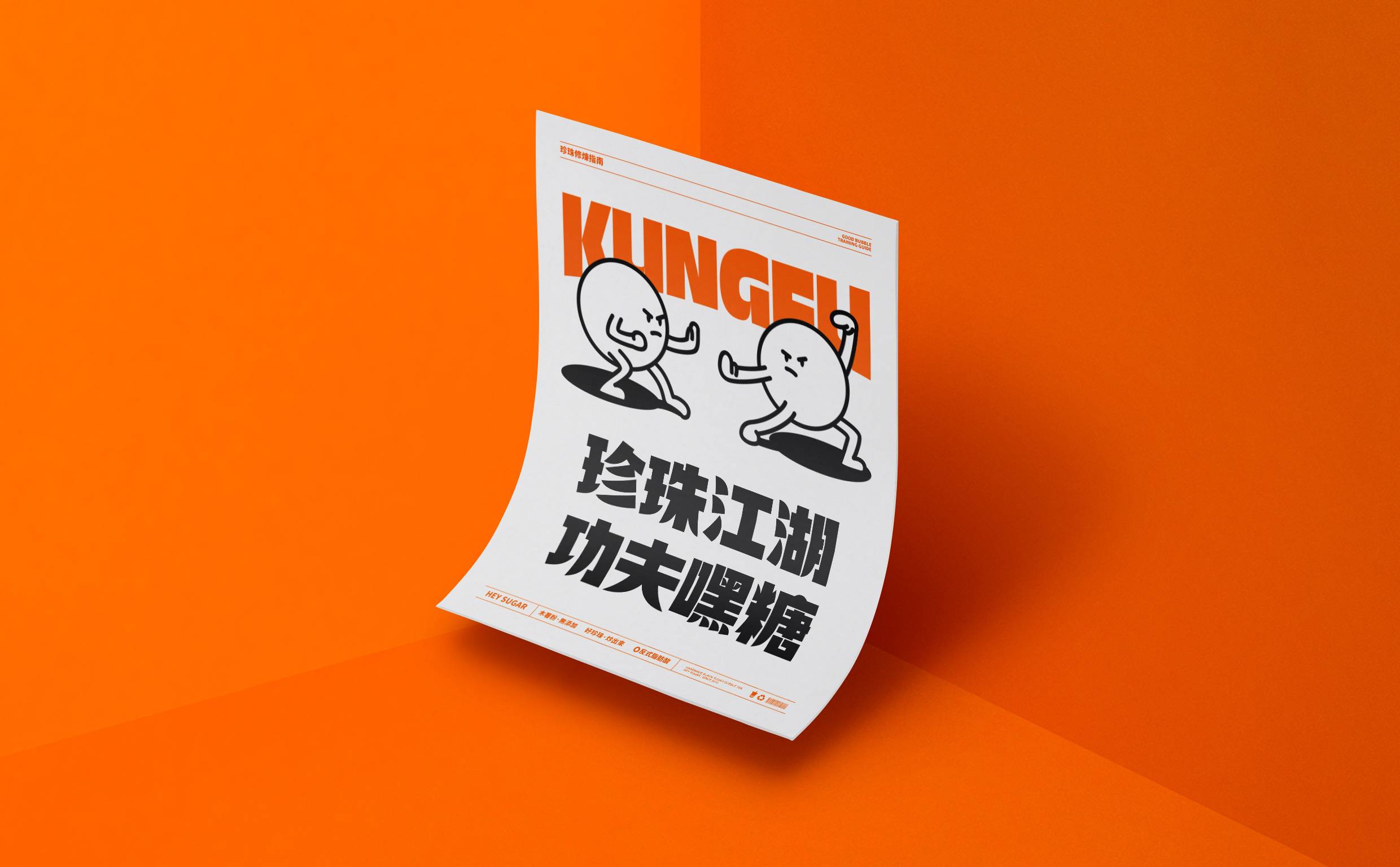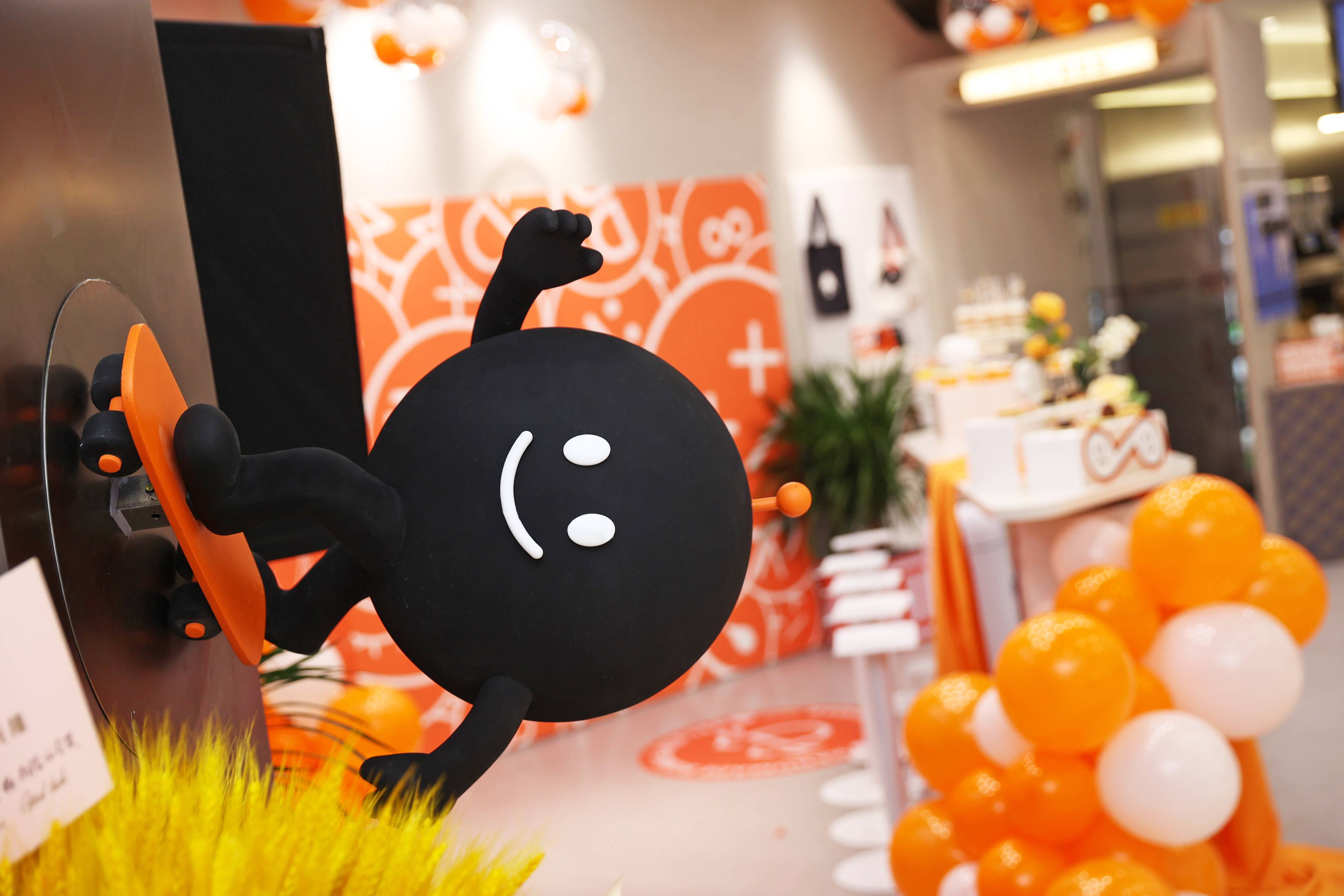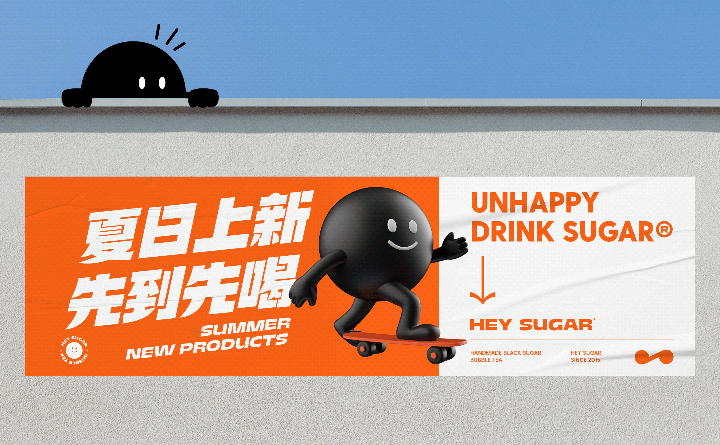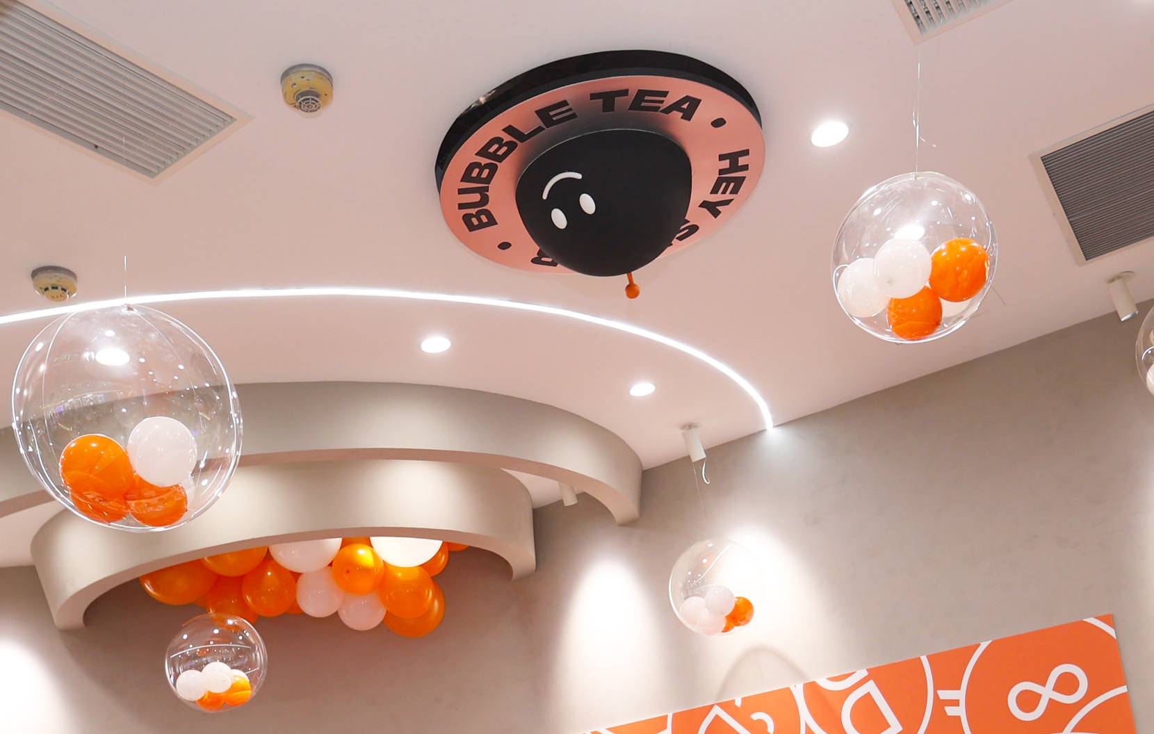 银色,利落而又充满了质感,与稳重的纯灰色搭配,两种不同灰度呈现,让空间形态充满了层次感。橙色,活泼趣味,是给人带去欢乐的颜色,白色,纯洁而又干净,与橙色搭配,给人轻松愉快的氛围,恰恰也对应了嘿糖的口号——"不开心,就喝嘿糖"。