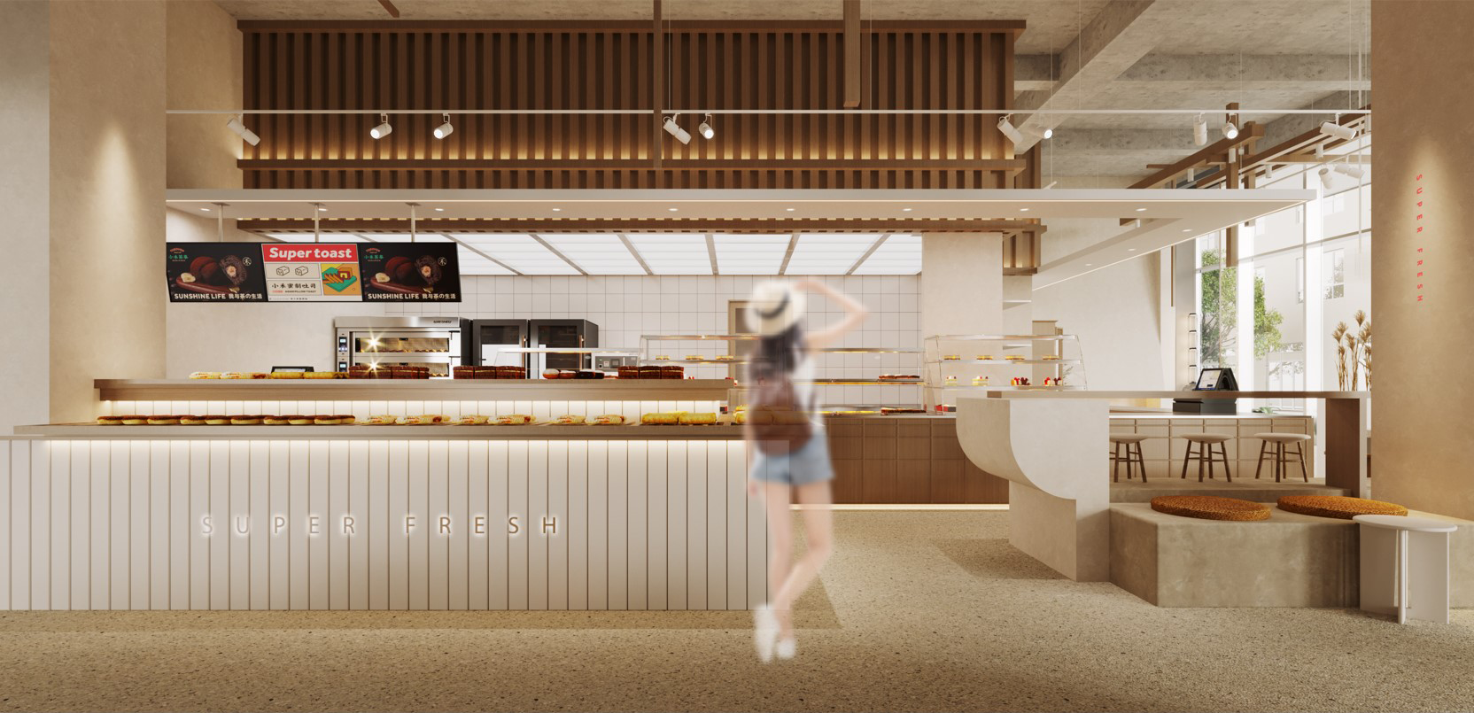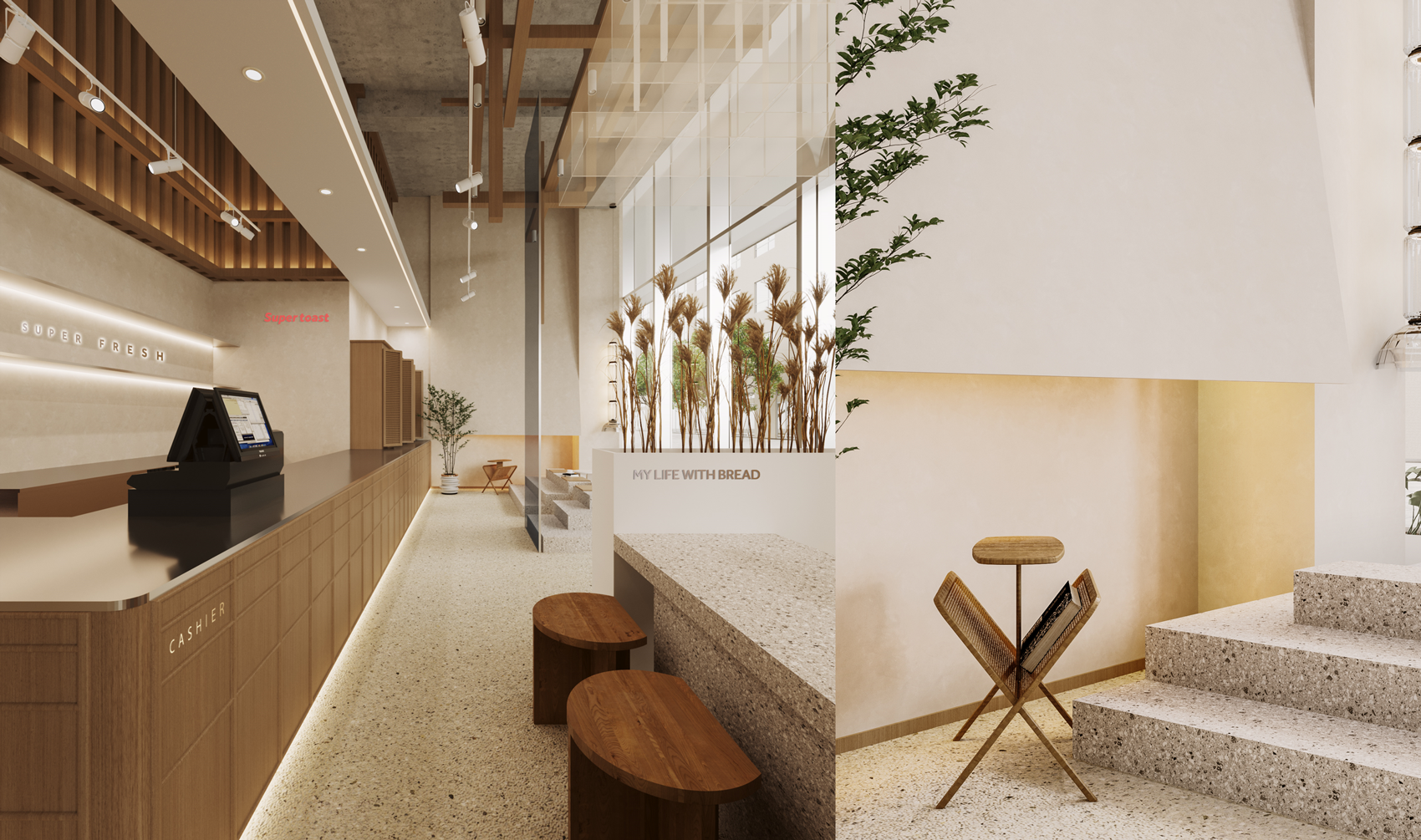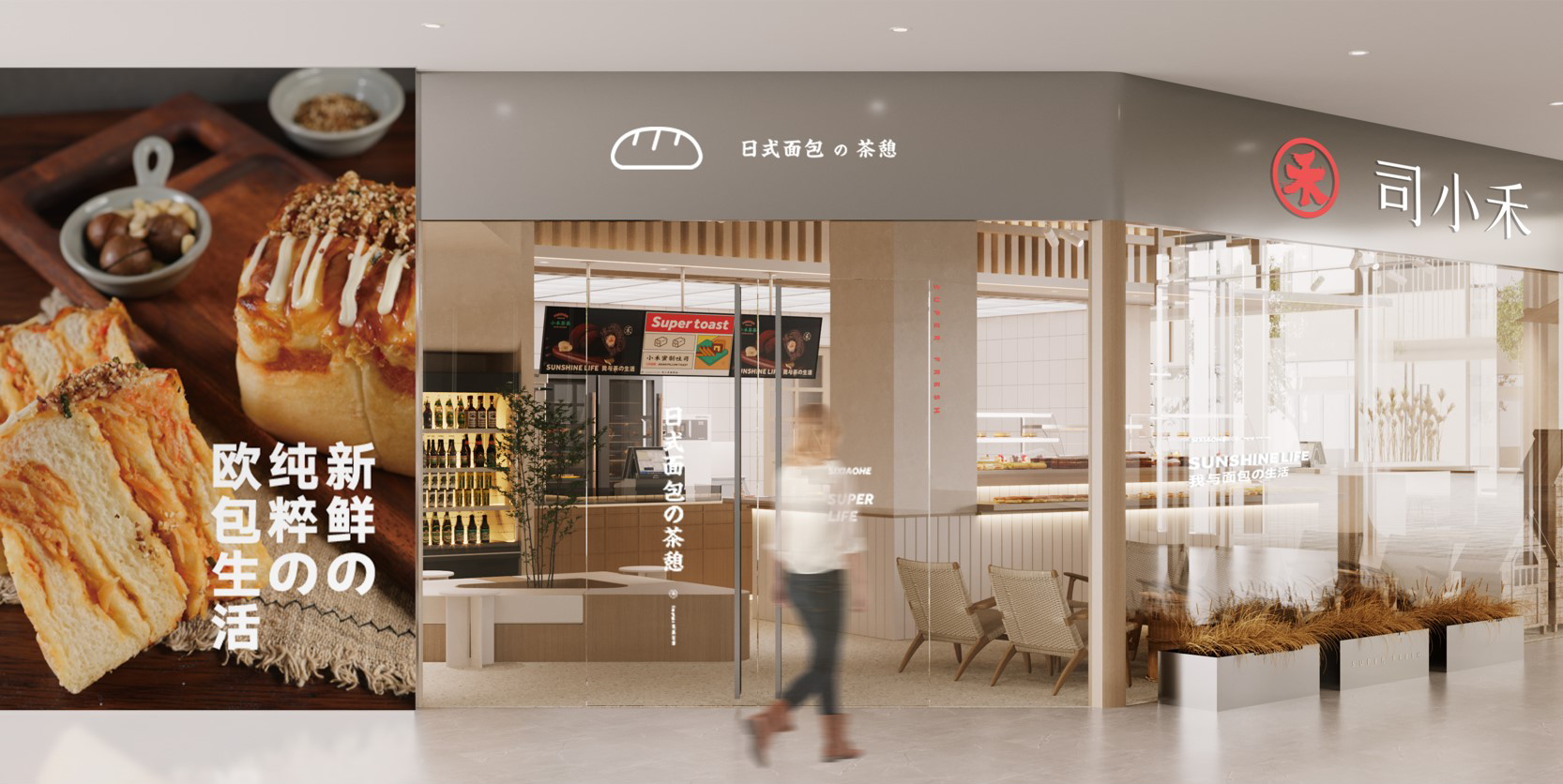 基于司小禾面包的“做有温度的面包”的概念,我们通过直观地手法,运用谷物与豆类的麦芽色调,采用木质材质,突出了空间的丰富度与温度,营造了一种置身于麦田的氛围感。