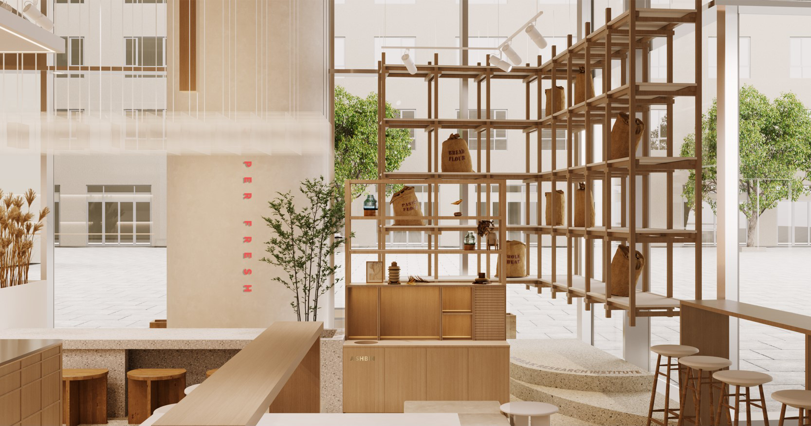 在幕墙玻璃的折角,设计师设计了悬挂面粉陈列台,进一步向大众展示司小禾优质的原料,丰富空间的同时,吸引好奇的围观者进入店内。麦穗与绿植的点缀,更是在温度中营造出司小禾舟山店独一无二的味道。