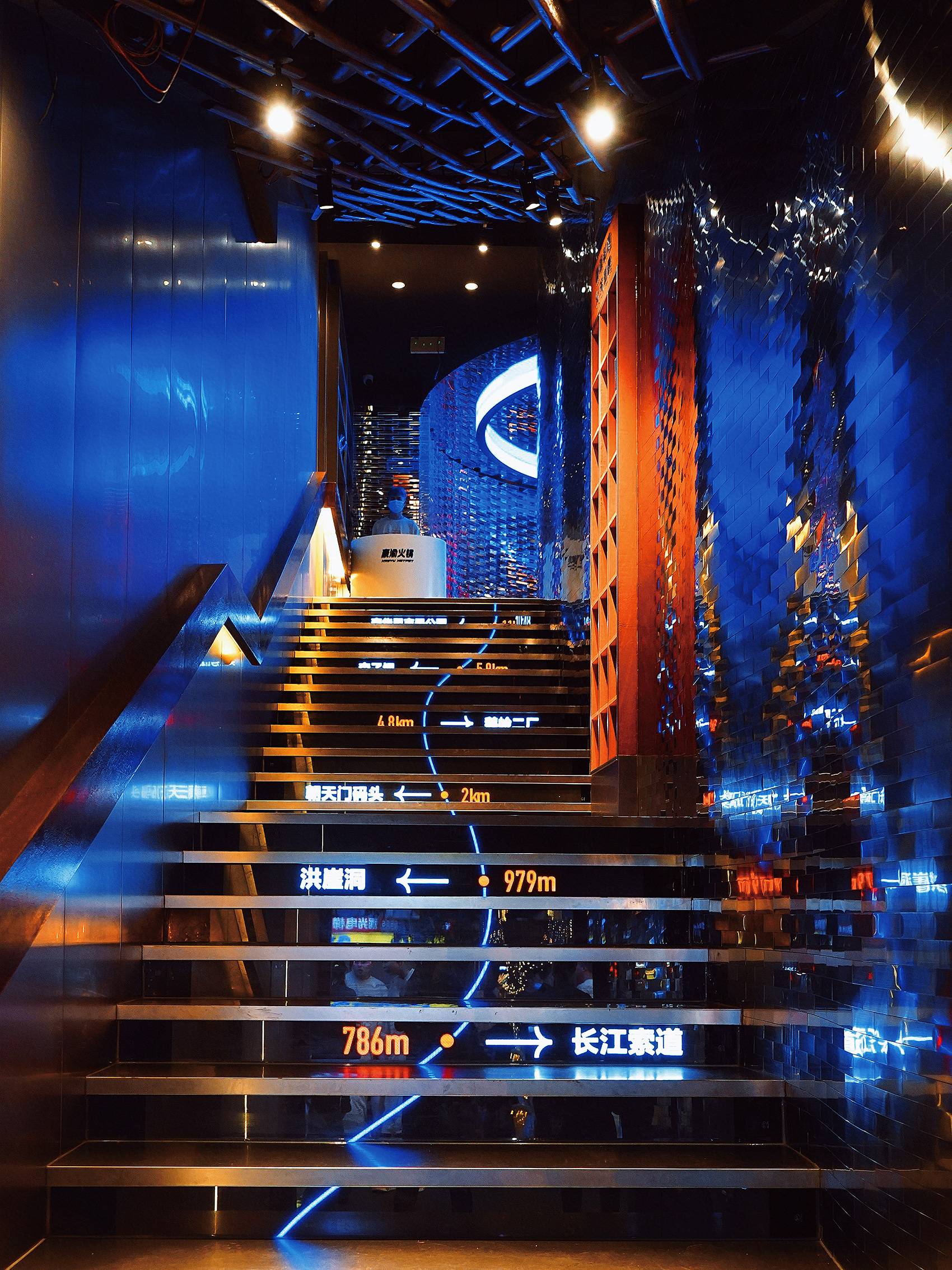 入口处的楼梯同样采用了LED屏,是一条流畅的从底下通向上面的行动动线,不自觉地让人跟随而上,加强了顾客与空间的互动,引客入门。整个楼梯过道都是金属质感的,自带的光泽,反射的灯光,硬朗而又明亮,立刻就能感受到空间的潮酷感。