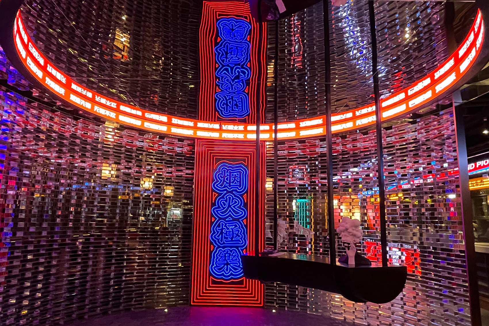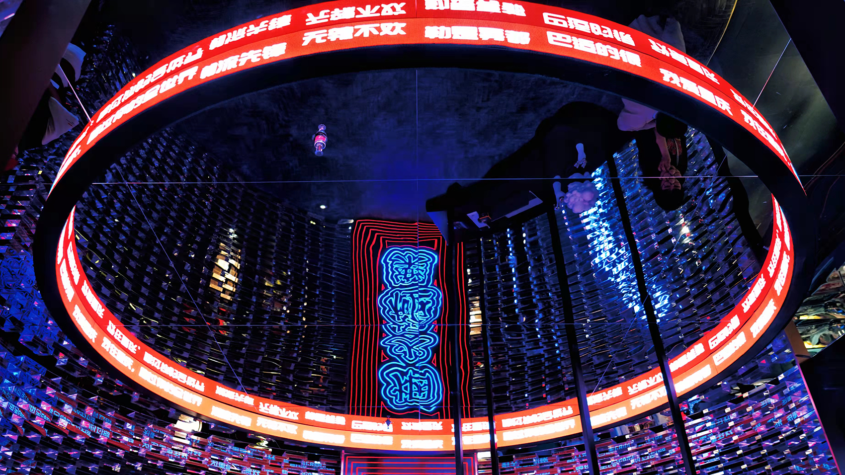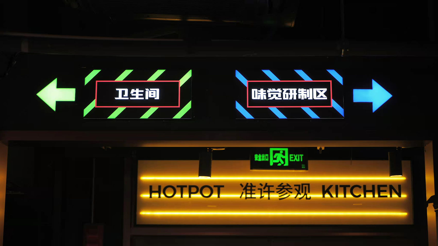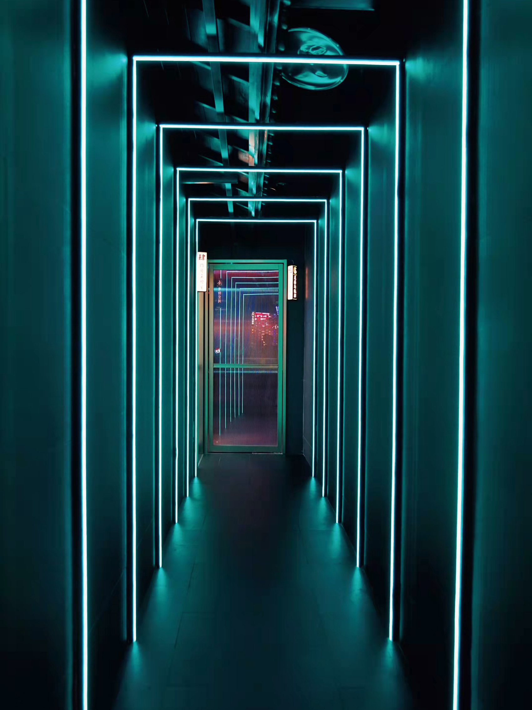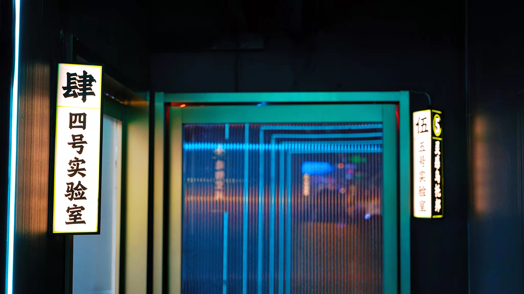 进入包厢区域,一眼就能看见设计师搭建的通往不同包厢的过道,类似光剑的LED灯装设,很有时空隧道的感觉,穿越空间,就可以去到不同主题的奇妙包厢。