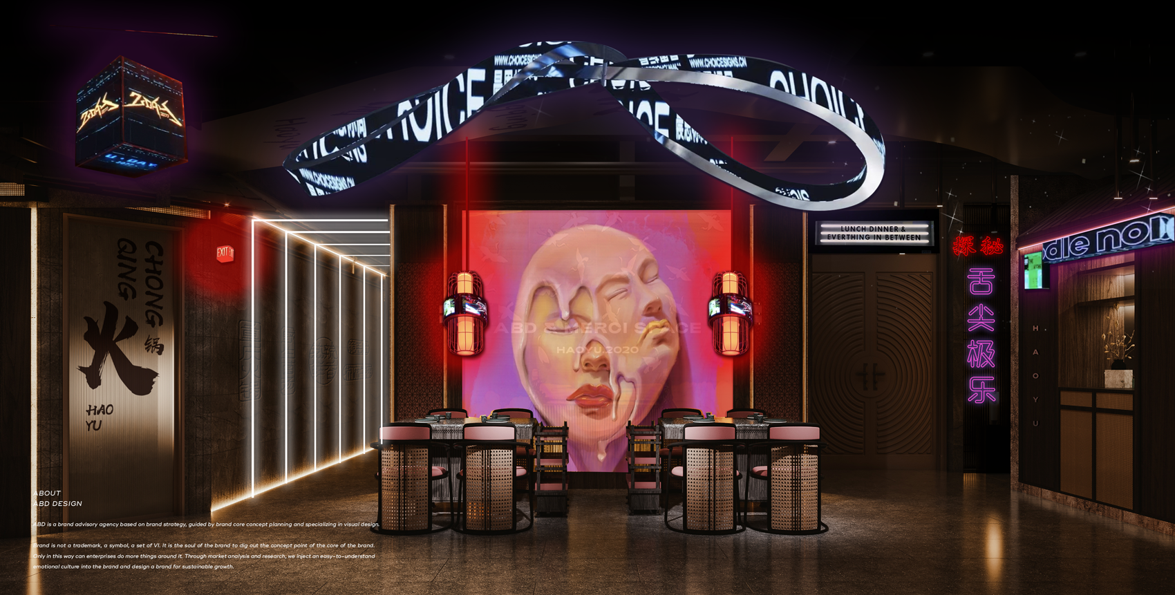 这次豪渝火锅将追溯源头,以历史为背书,从新出发。"重庆"名起于宋代,同时"宋代"是古东方审美公认的最高峰,因此,设计师从宋代的审美意象中接续出现代设计,最为相宜。结合时下赛博朋克、国风等热门潮酷元素,打造一场视觉、听觉、味觉的三重盛宴,感受不一样的豪渝火锅。