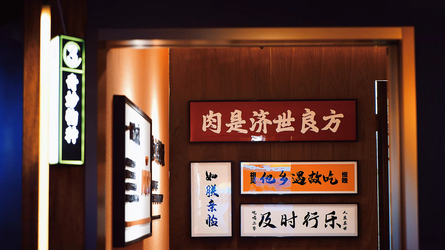 卫生间延续用餐区域风格,传统与现代的碰撞在这里也有体现,比如墙上的古风画、悬挂着的圆镜,都带有古代的感觉,同时金属质感的空间打造,又充满了现代感,给人以硬朗而简约的高级感。在用餐区域我们还专门设计了霓虹指示牌,显眼又融合整体的空间氛围,能让顾客一眼就能看见。