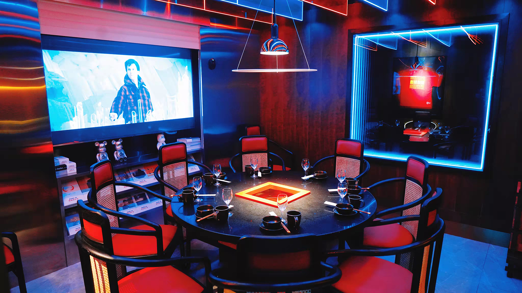 因为豪渝一直坚持开放式明档设计,所以整个用餐区域设计师都以厨房为核心区打造,看得见的食材制作,让顾客食用更安心、更愉快。空间内大量使用了木质结构,并做了特色衔接,营造出了宋代的韵味,再配合LED、艺术插画等的时尚潮酷设计,以及豪渝经典红的椅子,打破了空间的古板感,增添了不少活力和品牌感。