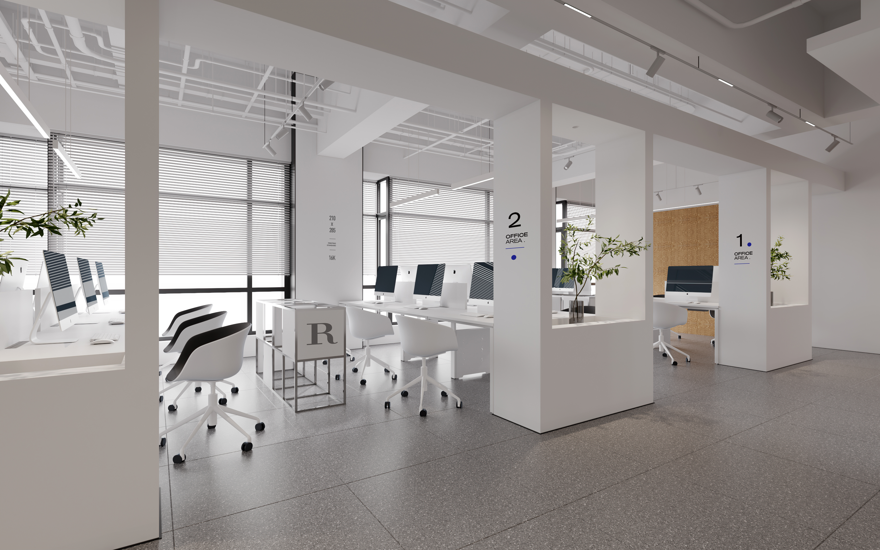 办公区域的设计通过有序的隔断、绿植、玻璃、自然光,打造一个共享开放自然的空间。充足的自然光线让空间呼吸感倍增,同时绿植的点缀,为整个空间注入了自然的气息,从而变得生机有趣,以此产生一种简单、舒适、纯粹的公共办公环境。