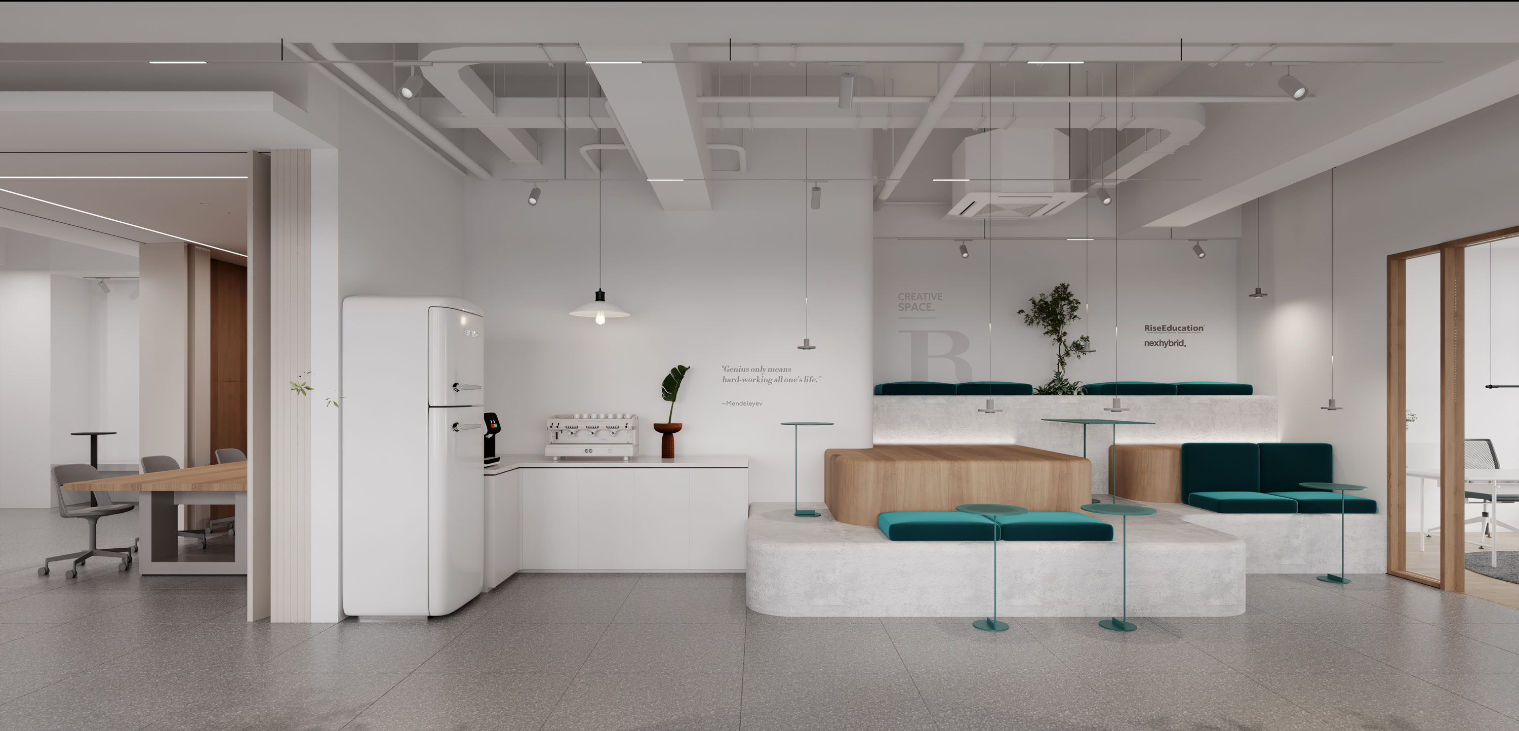 在办公区的一侧是休息茶水区,利用高低层级的设计,丰富了空间层次感,可供就餐、休息以及学习用途,打造独立自由的半开放式公共活动区。