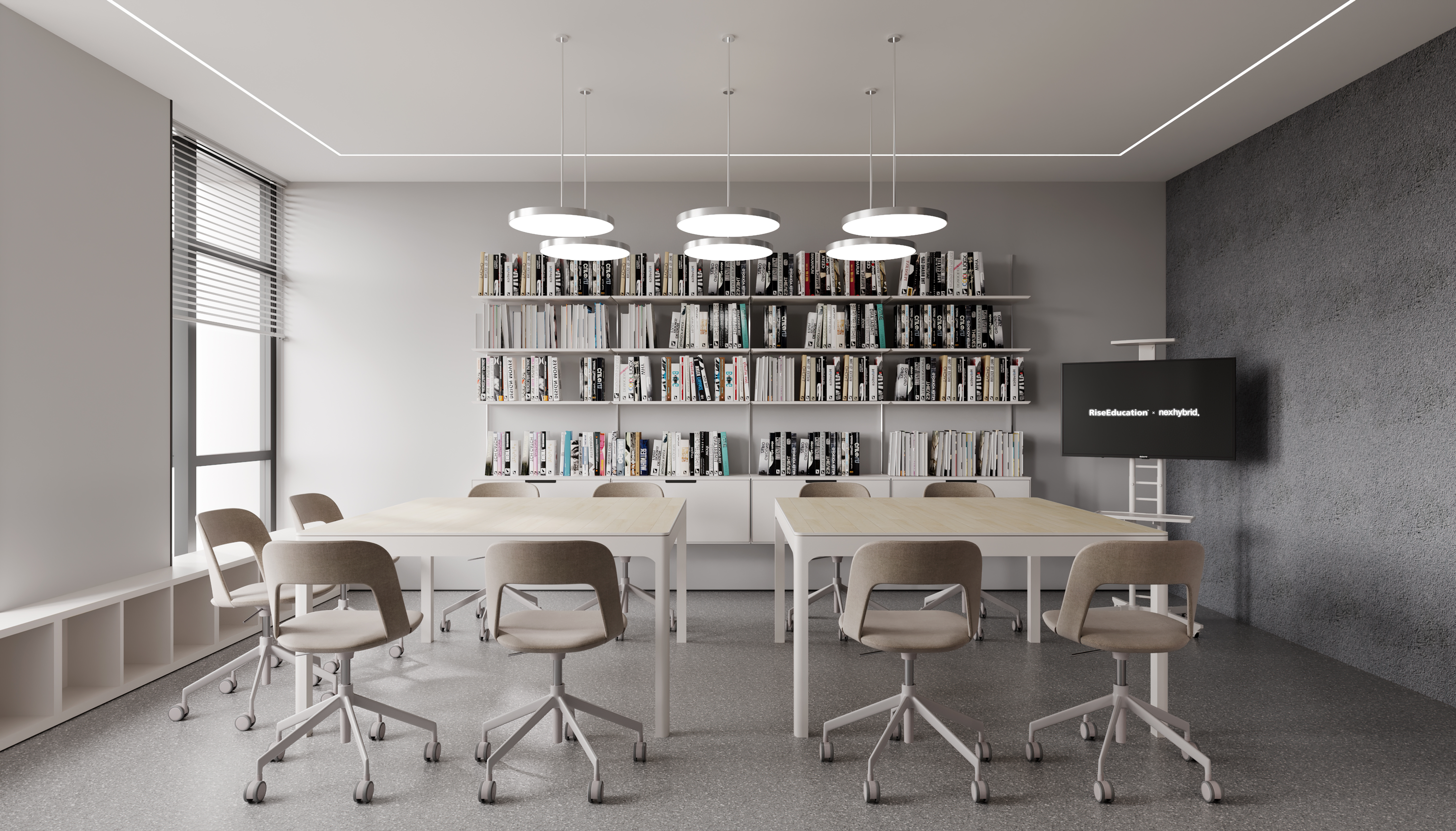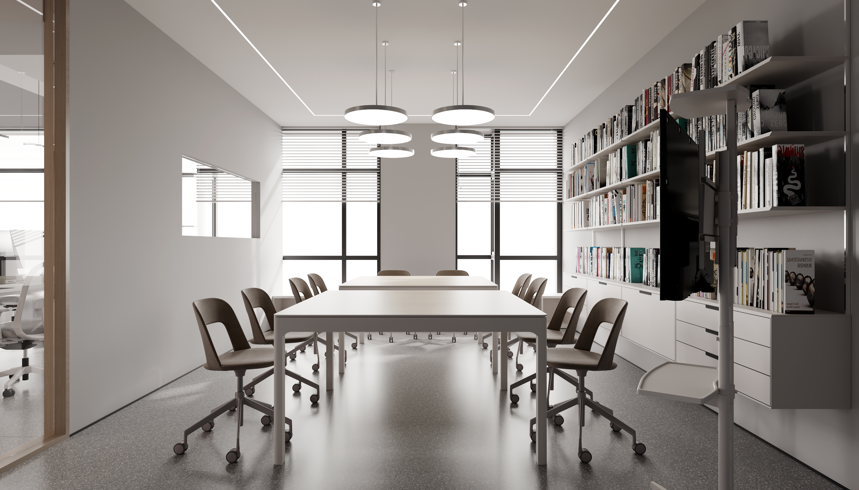培训室利用一侧简单的灰度作为空间"镇静剂",在明亮干净的空间内,又加了几分静谧沉稳,让空间拥有无限的包容性,适合来一场思想上的碰撞。在墙上还设置了Vitsoe书架可供员工学员阅读,知识的力量,就如这空间给人的感觉,安静而有力。