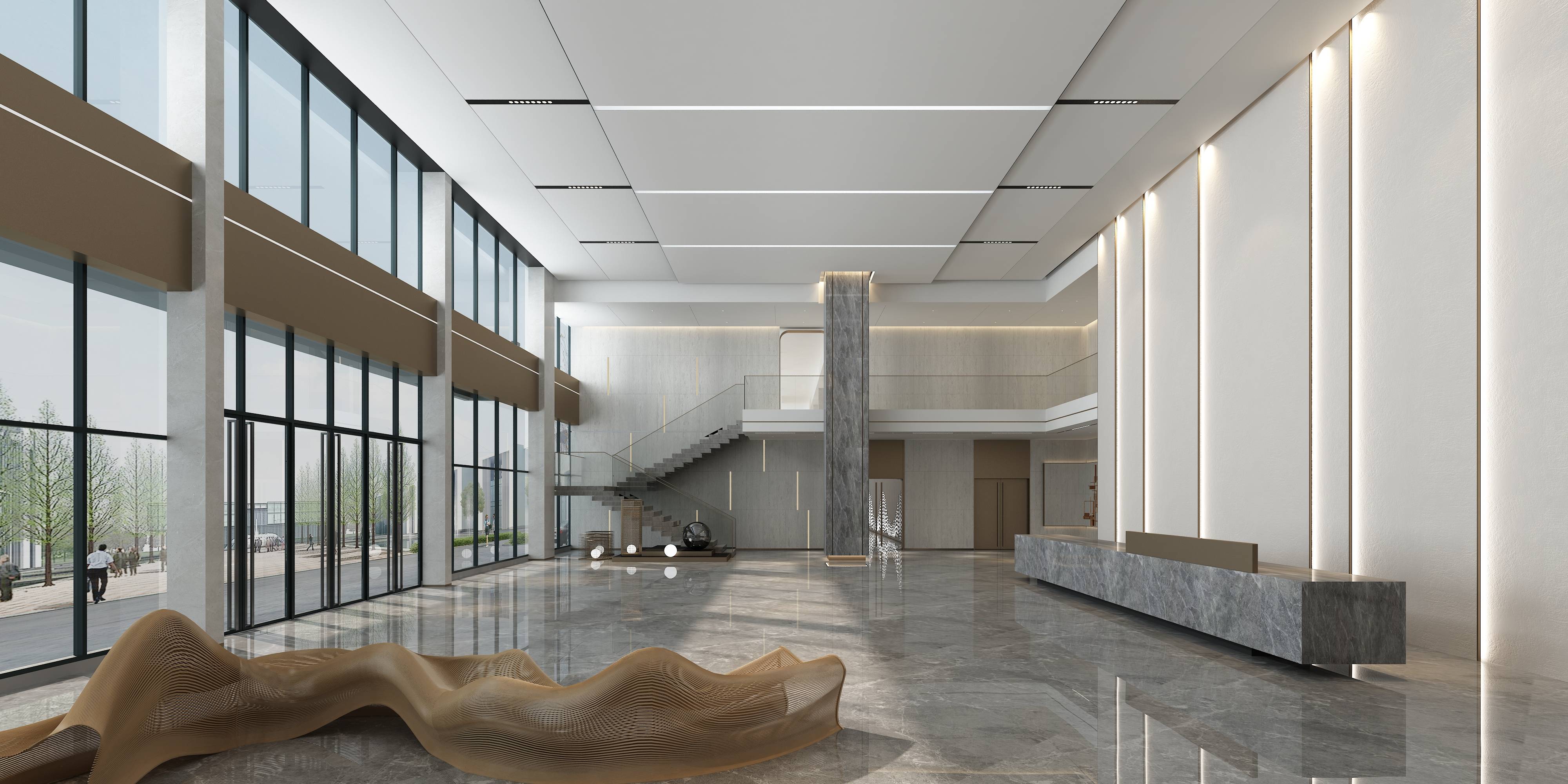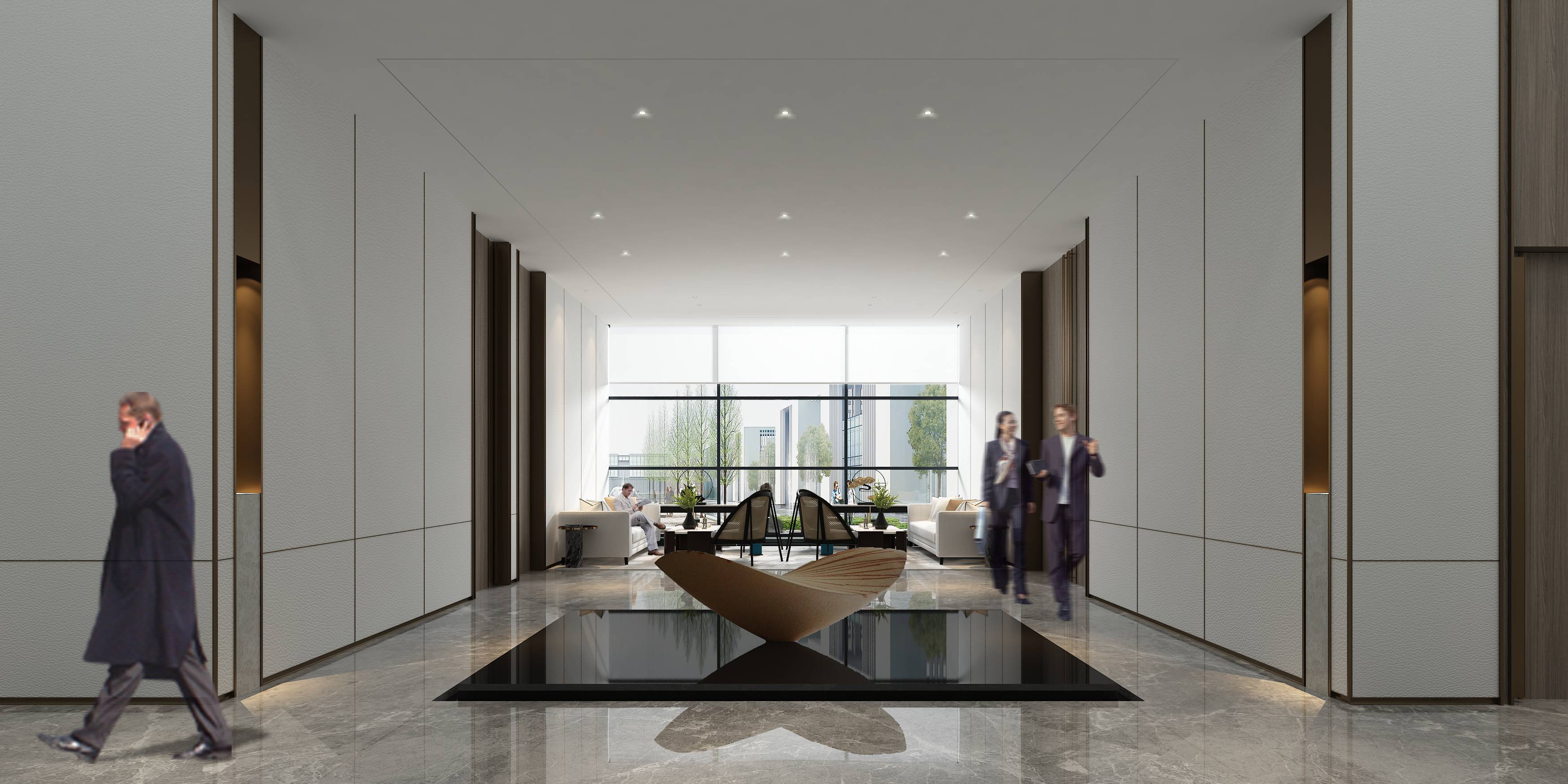 进入大厅区域即可感受到简洁、现代化的气质,入口处的大面积落地玻璃使整个空间更加明亮开阔,灯光与线条以及摆件恰到好处的使用也让整个大厅展现出些许的未来科技感。