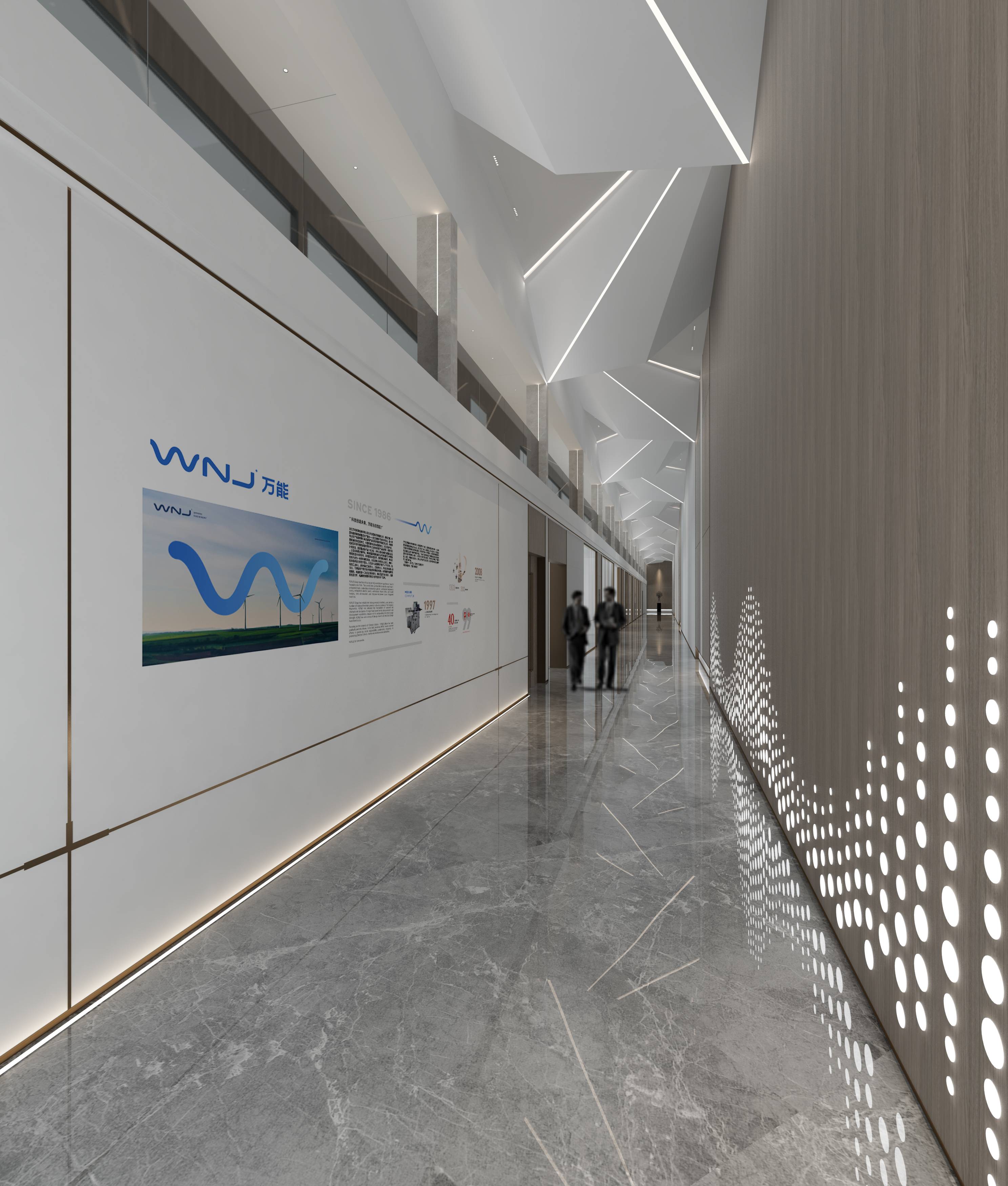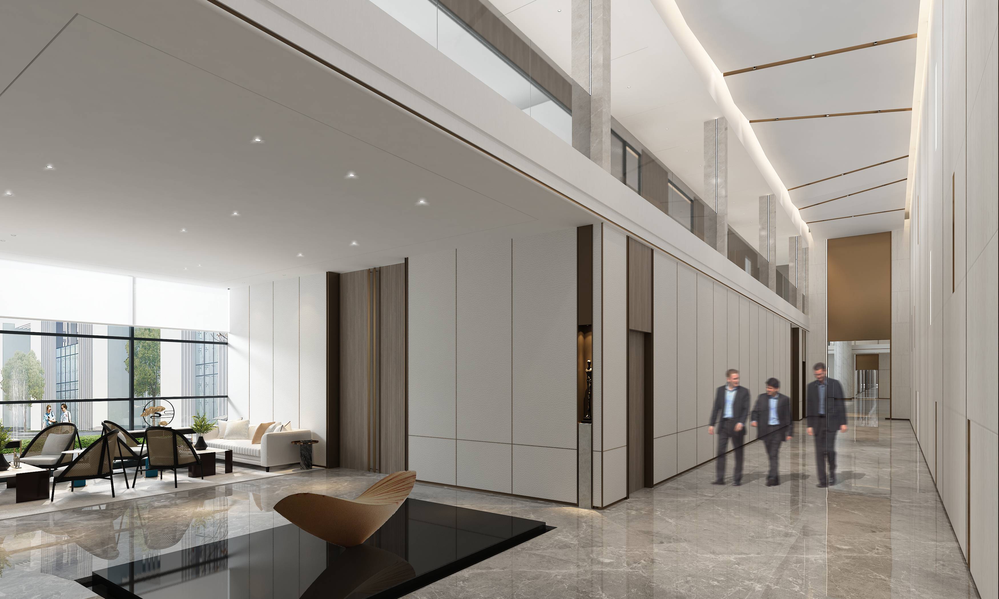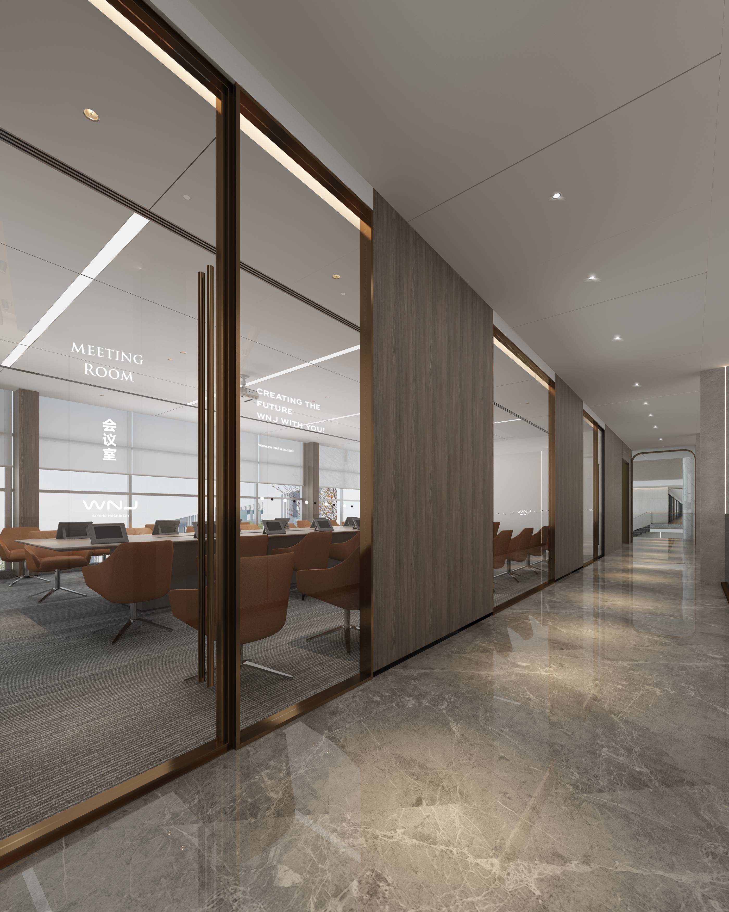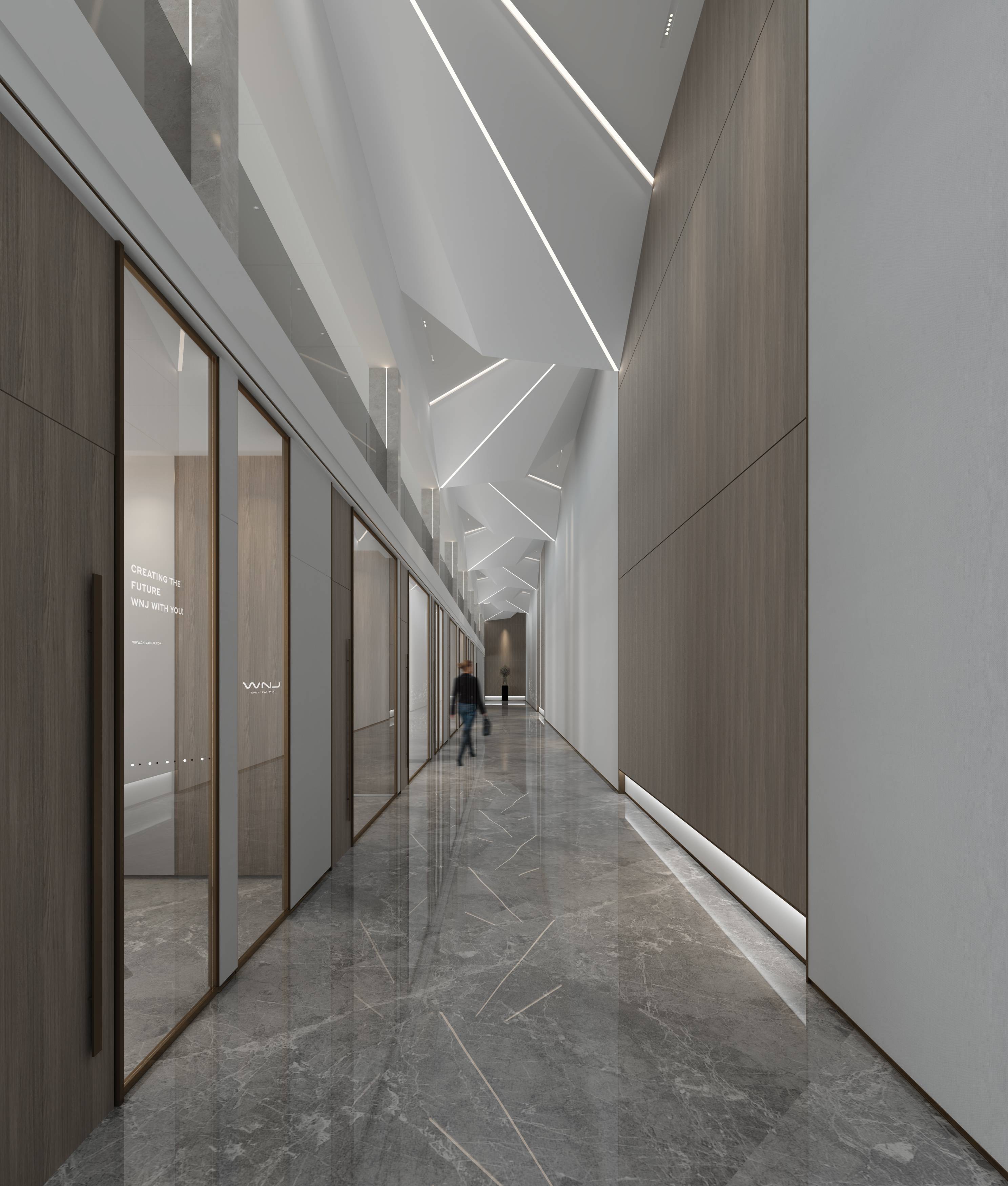 在满足现代多元化、智能化办公模式的同时,汲取了西方现代艺术发轫之处的审美诉求,以映射东方艺术的线性语言,为简单的几何立体空间赋型定调。