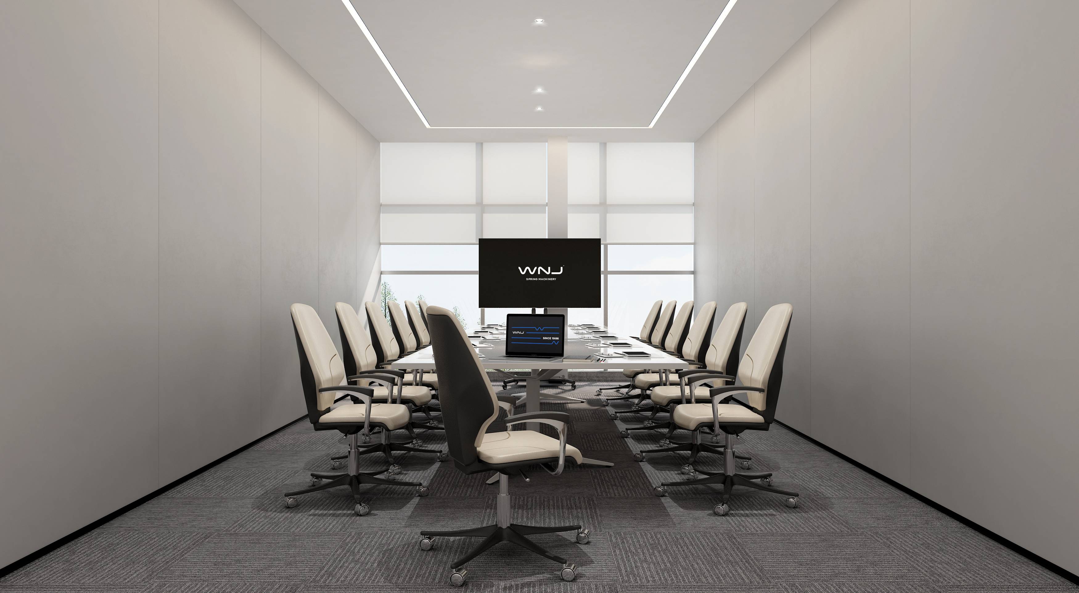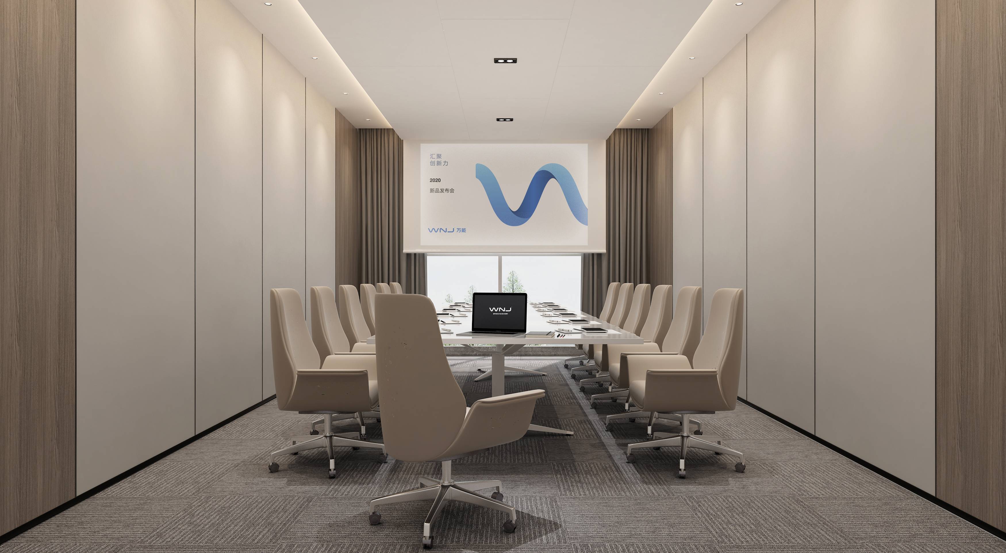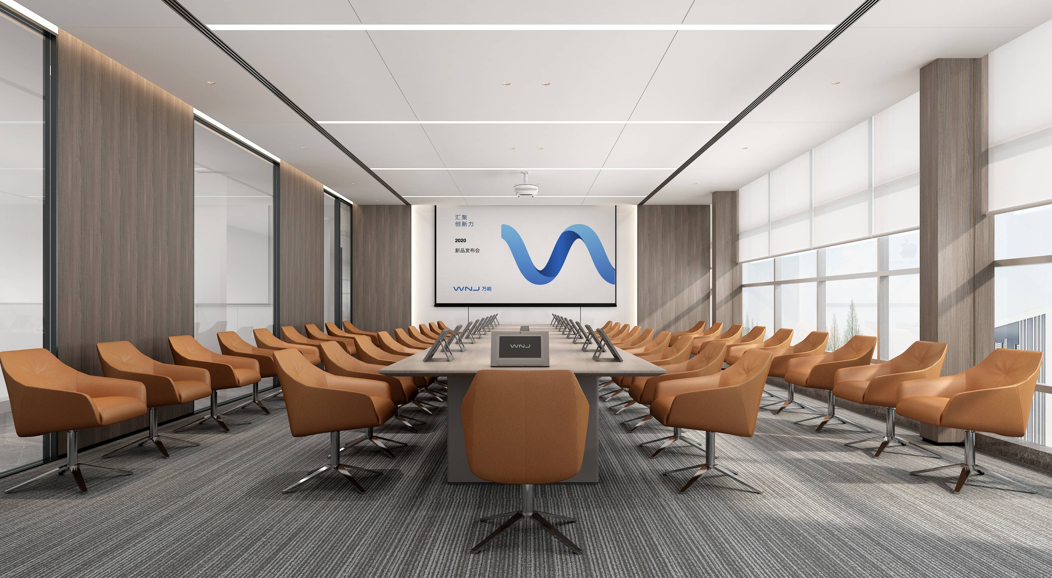 会议室看似中规中矩,并没有过多的设计,却也在细节和材质中展现出了万能弹簧的细致和科技感,墙面和地面都没有做过多的装饰,打造体积感。会议空间的简洁明快有利于提高开会专注度,进而提高工作效率。