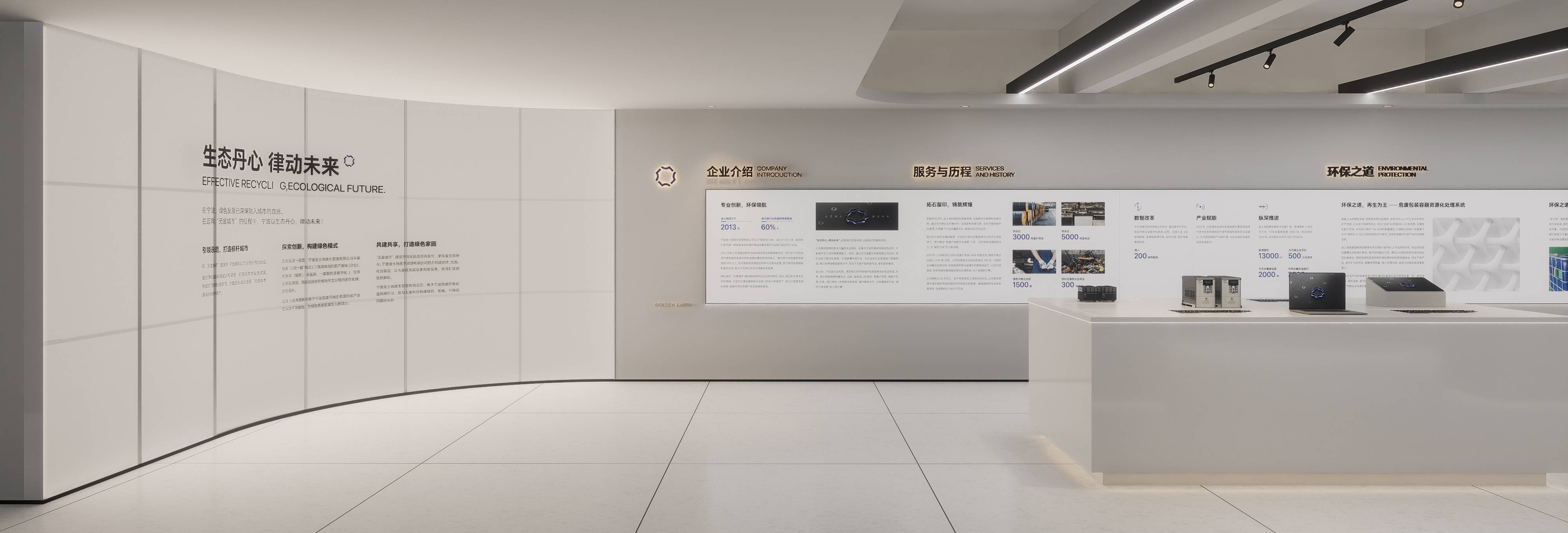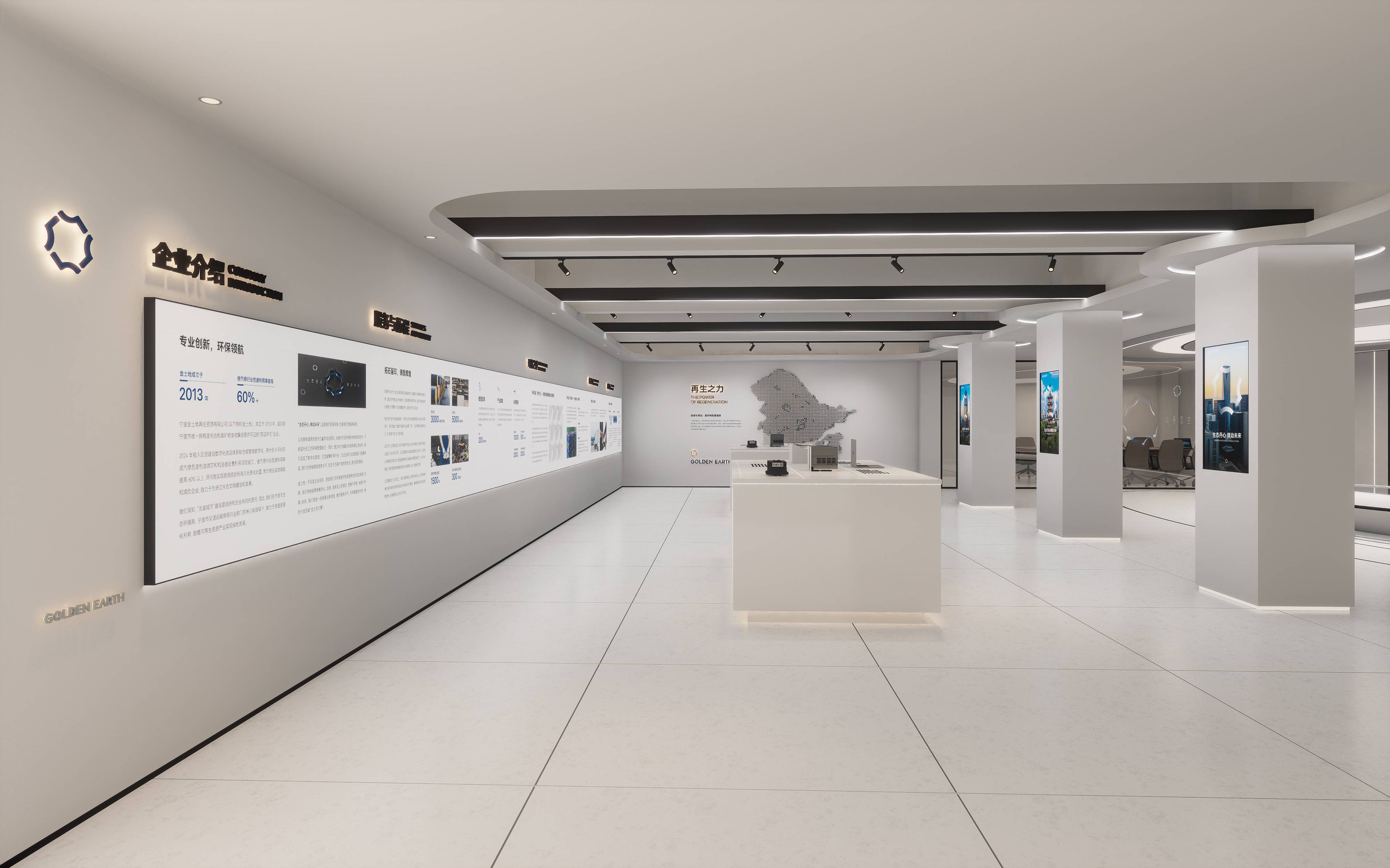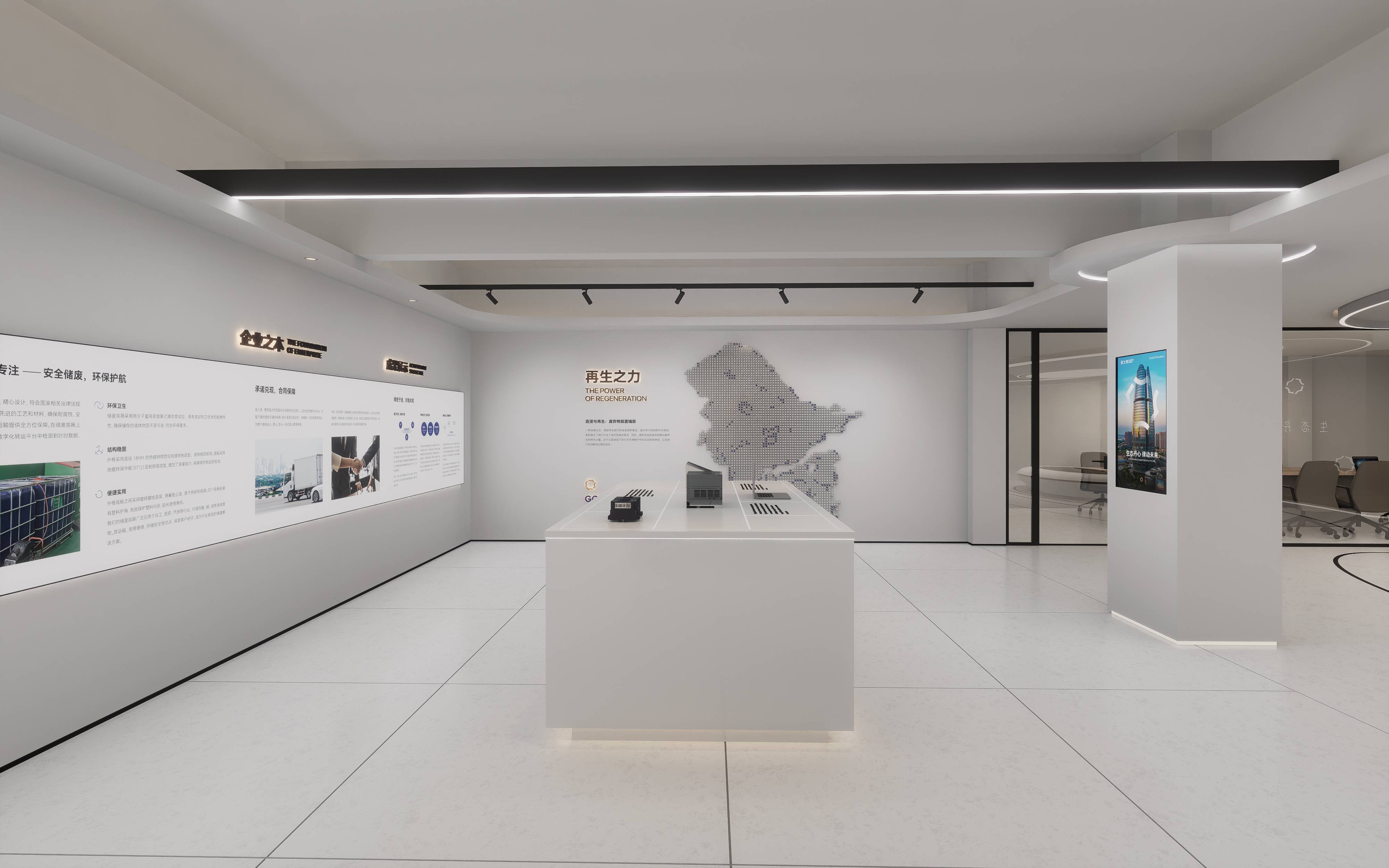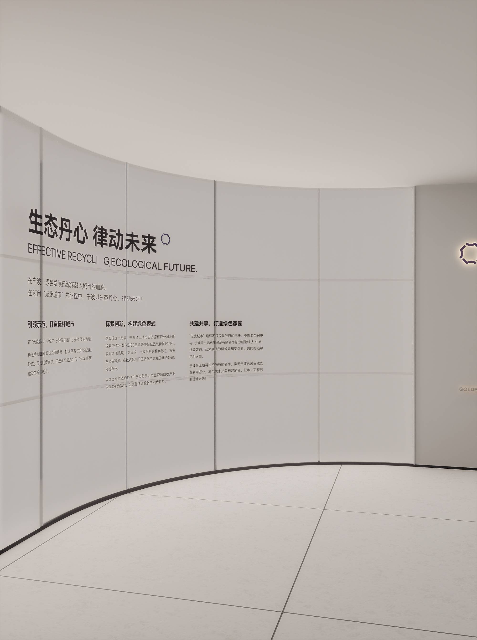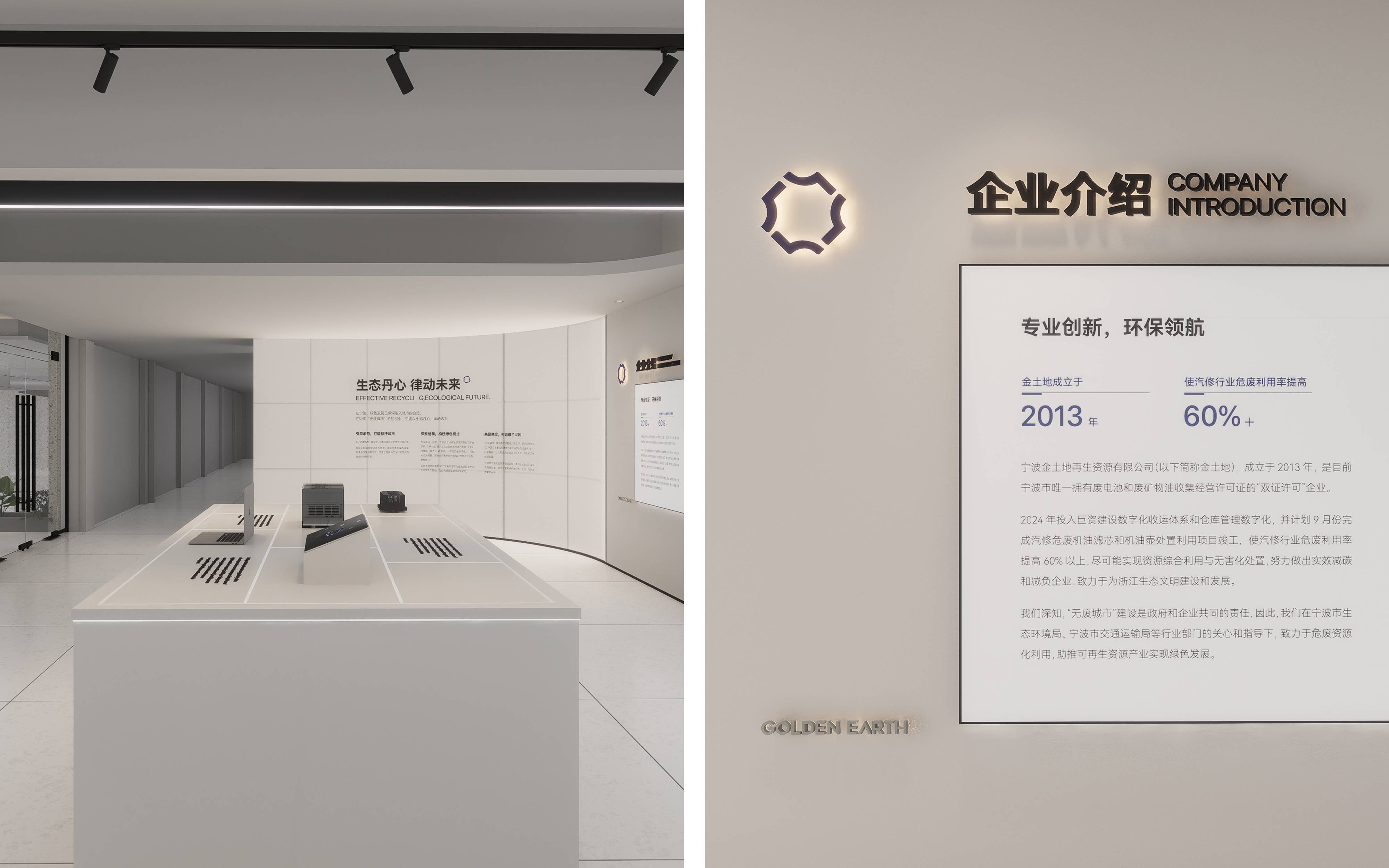 项目位于宁波市——“无废城市”的标杆城市。宁波金土地再生资源有限公司专注于危废回收和资源再利用领域;于其展厅,以简洁而干练定位的设计语言,营造了一个严谨而又科学的展厅空间。这不仅是循环科技的展示平台,也是对未来城市环境的一个期许和探索。