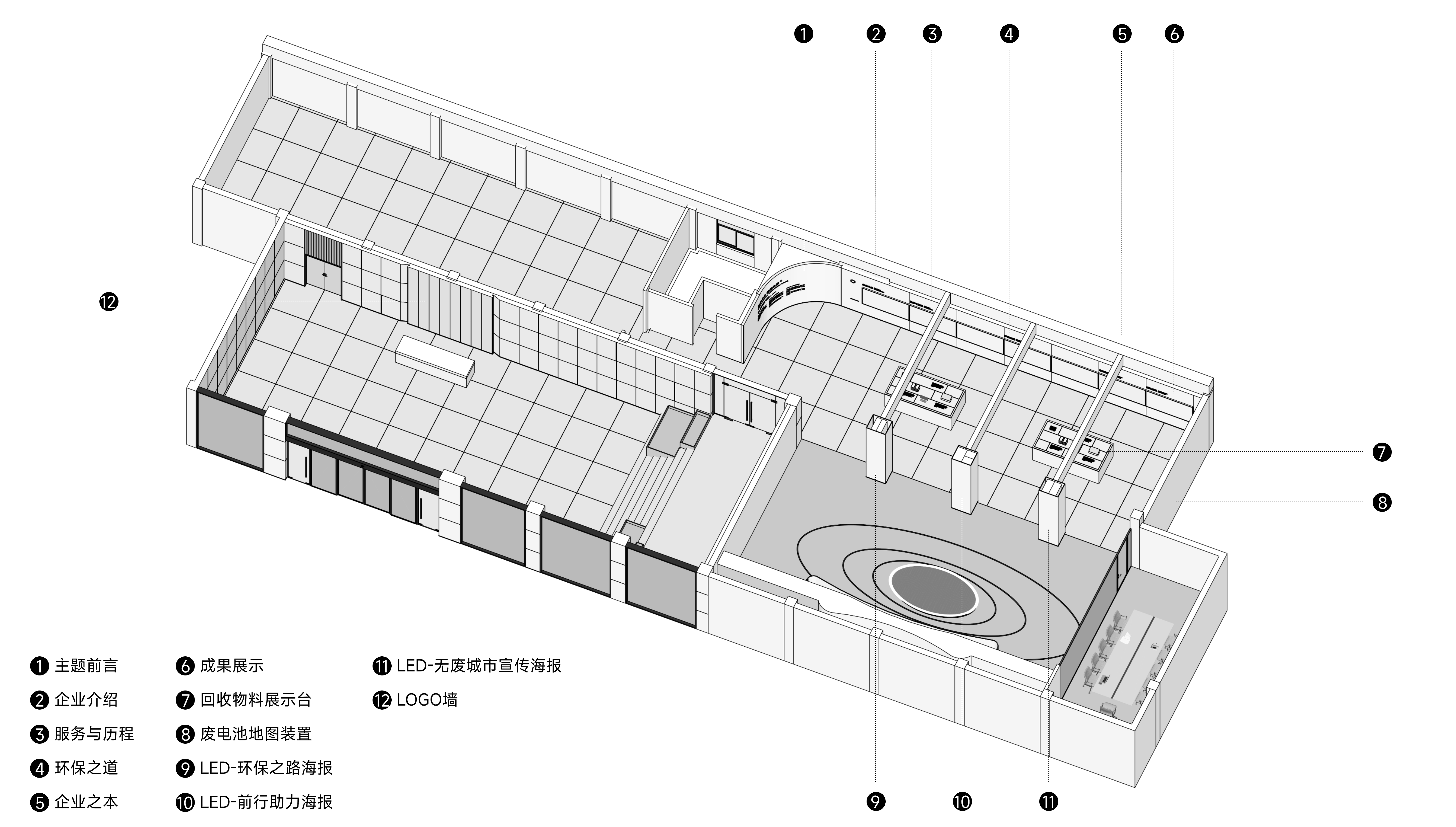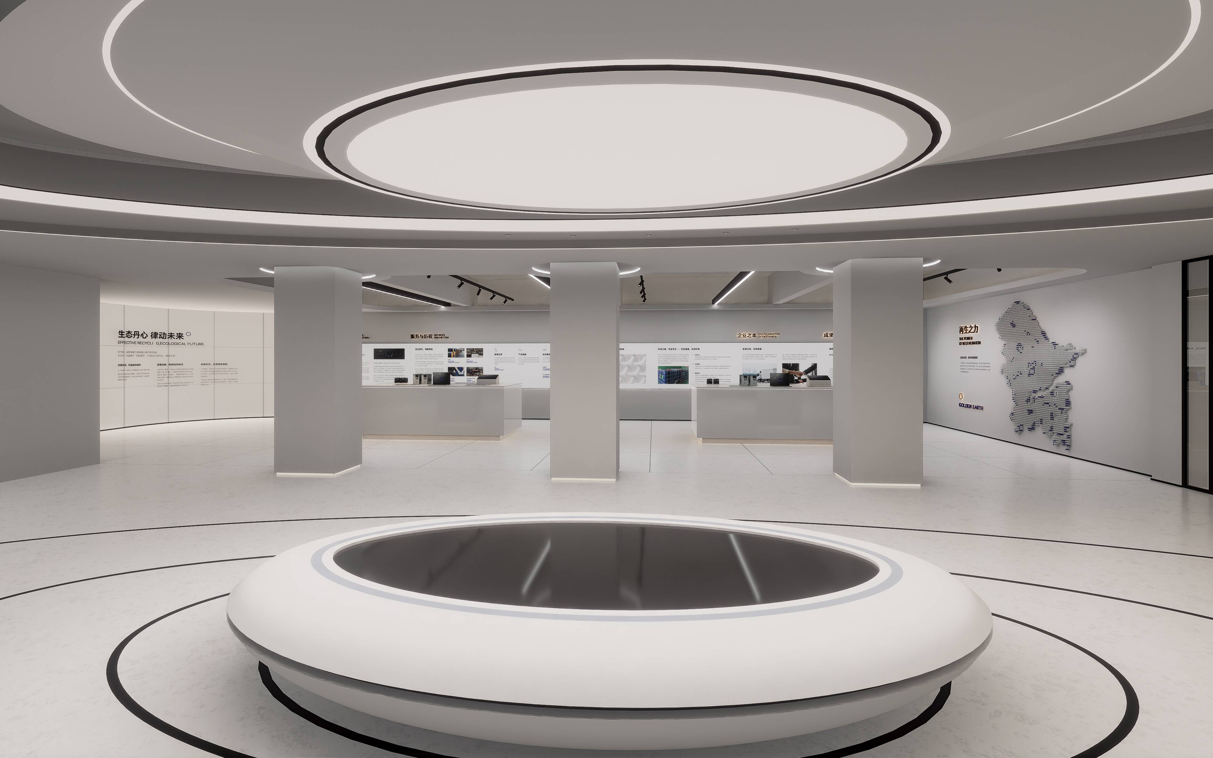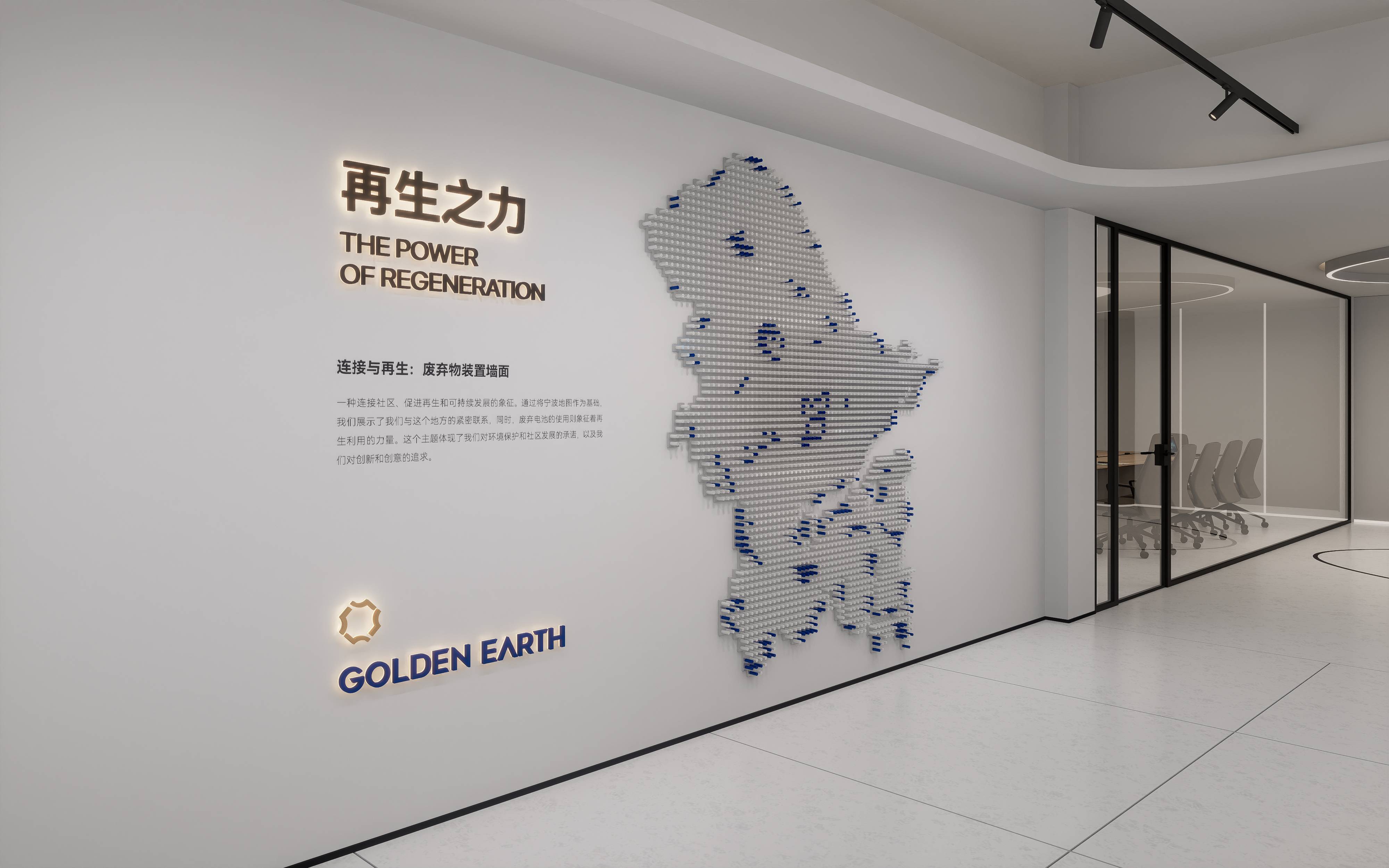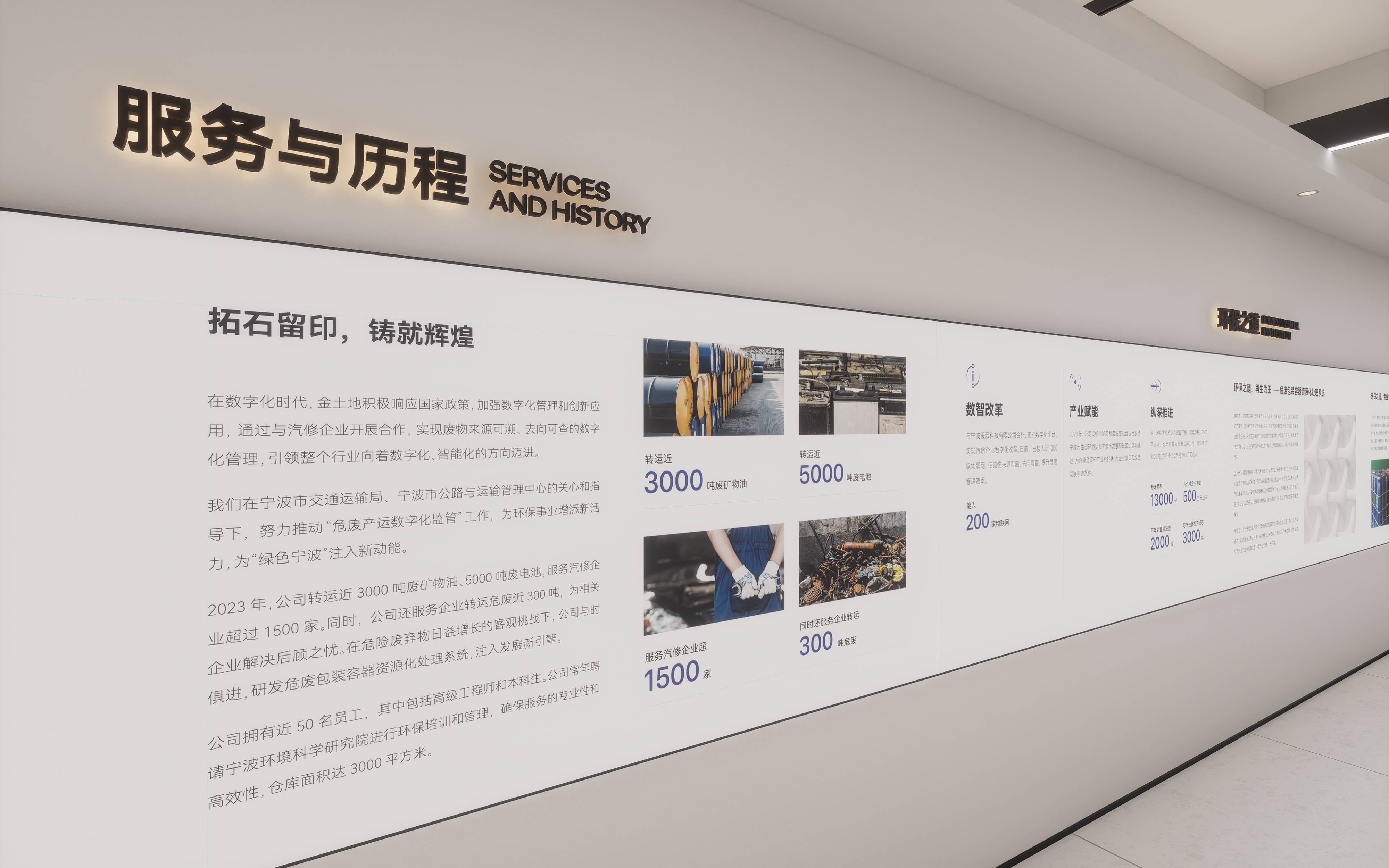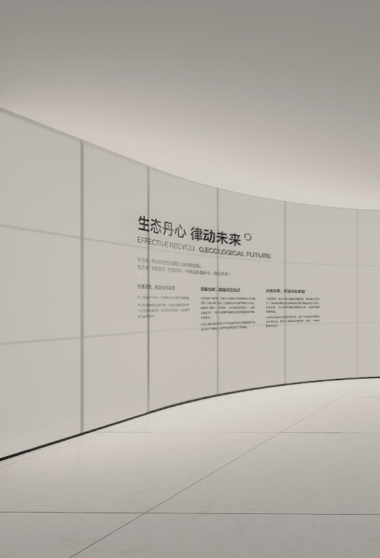 项目位于宁波市——“无废城市”的标杆城市。宁波金土地再生资源有限公司专注于危废回收和资源再利用领域;于其展厅,以简洁而干练定位的设计语言,营造了一个严谨而又科学的展厅空间。这不仅是循环科技的展示平台,也是对未来城市环境的一个期许和探索。