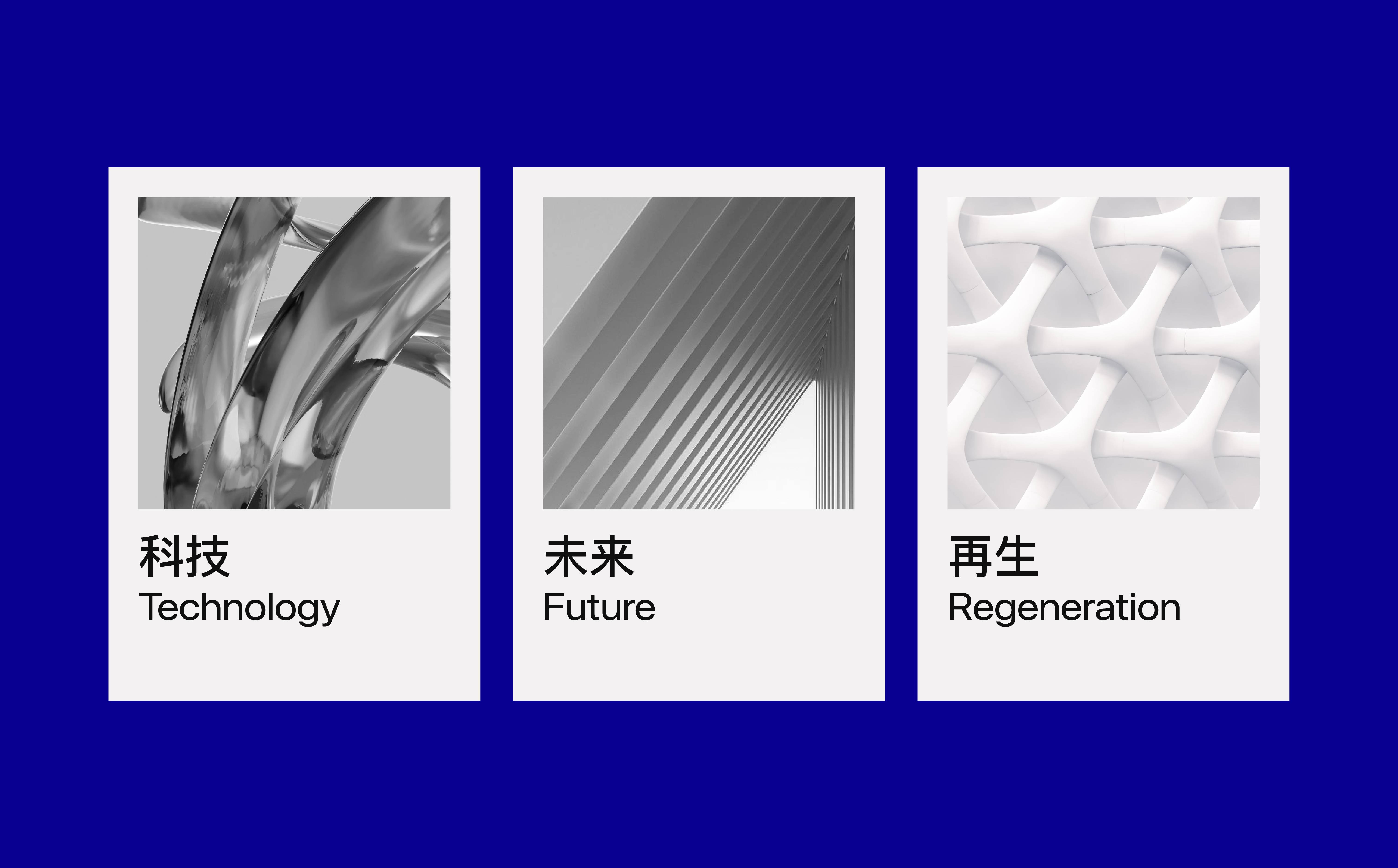 在色彩上,以白与灰两种中性色为主基调。白色明亮而干净,呈现专业的态度,交织融合不同材质的灰度,显得科技而高级,营造出一种严谨、沉稳的氛围,非常适合现代再生科技的节奏和风格。