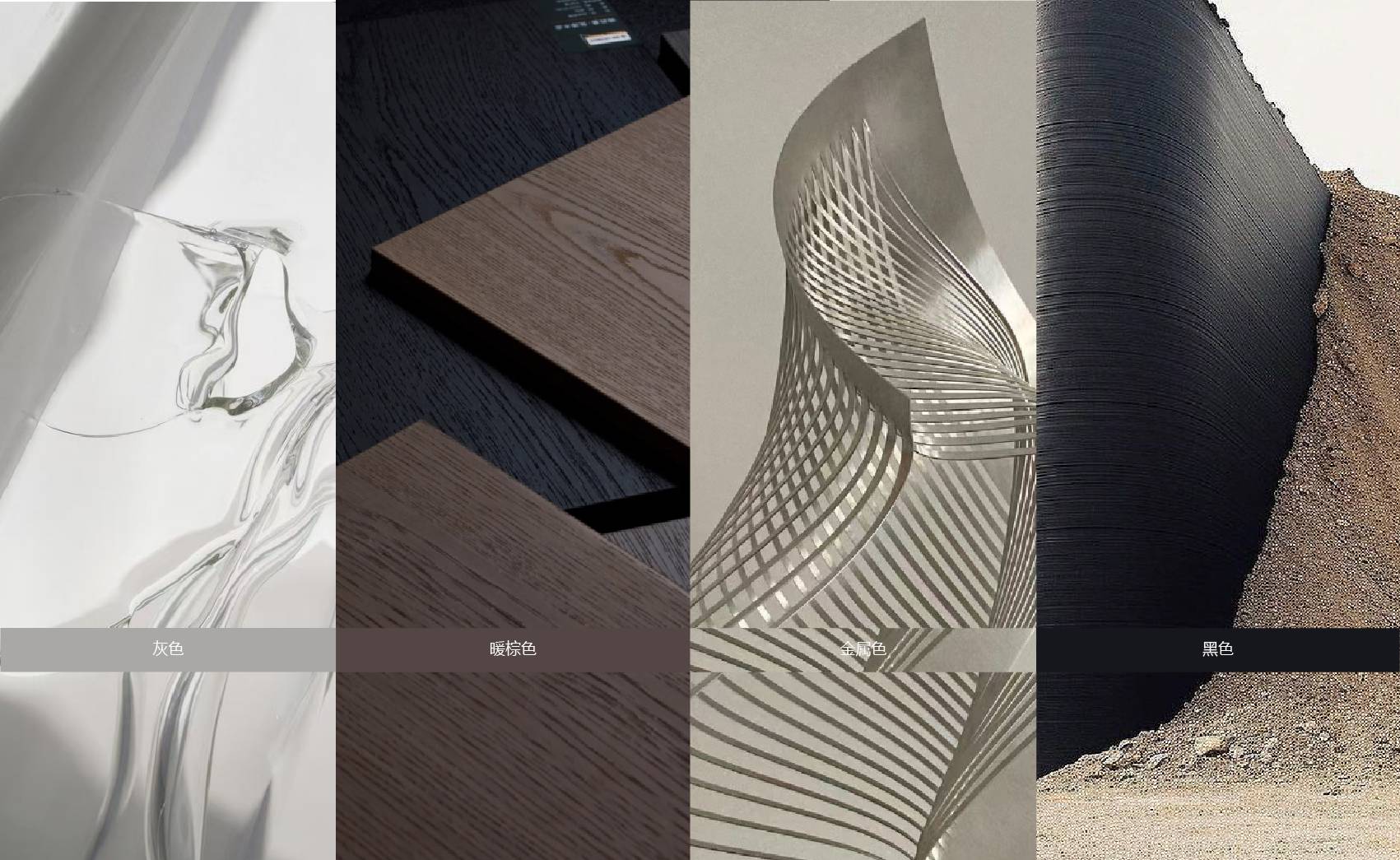 色彩上,以灰色为主色,沉稳而低调,铺陈出冷静克制的现代氛围。黑色以深沉的色调打破灰调的单一,塑造出鲜明的视觉焦点,赋予空间层次与秩序感。金属色化作跃动的光影,点缀其中,为空间注入科技感与精致气质。而暖调的棕色中和了冷色的疏离,让空间多了几分亲近与温度。