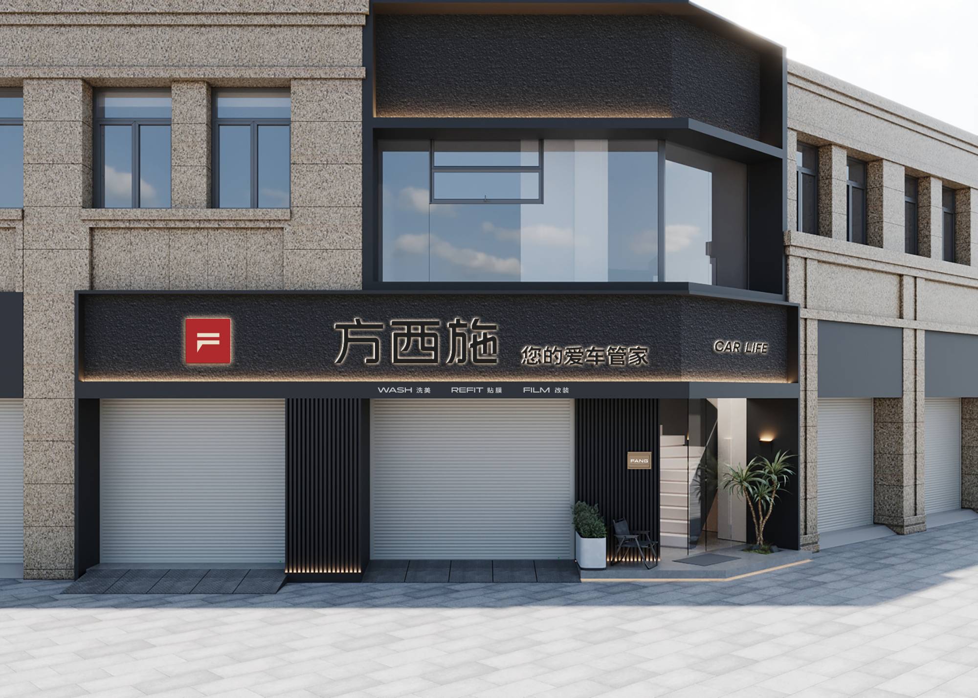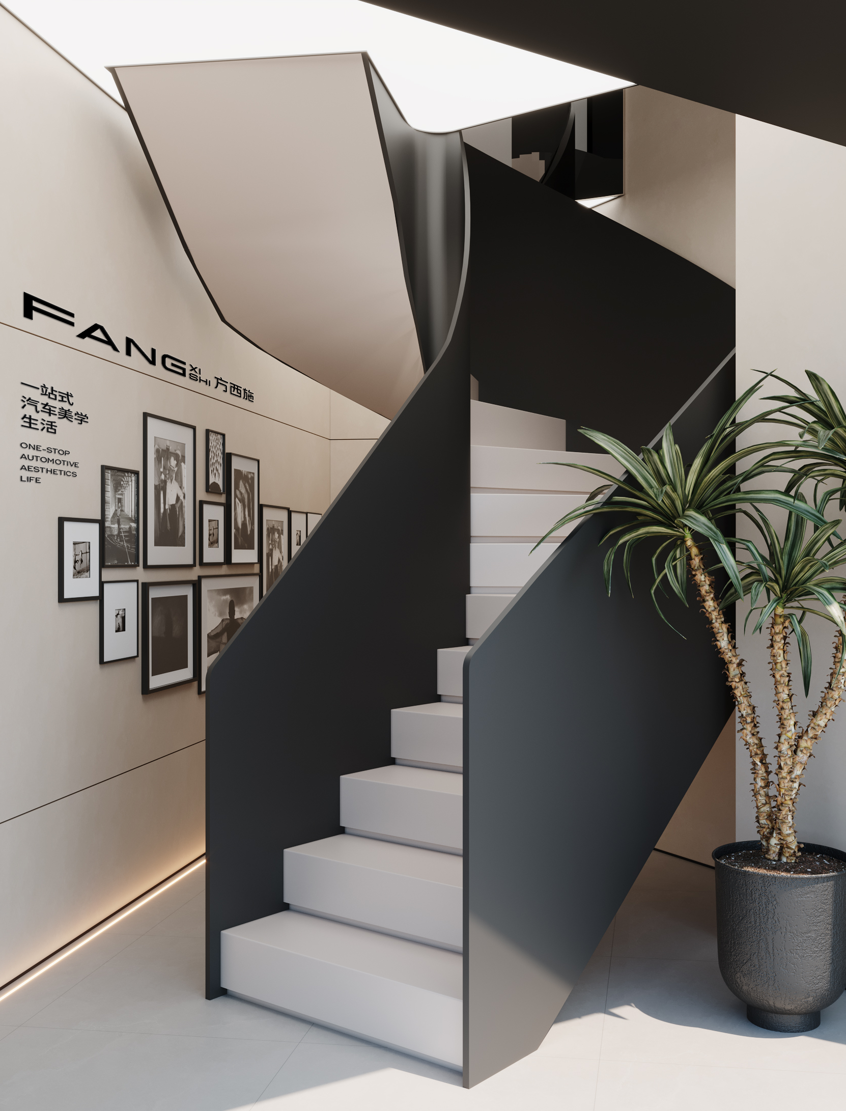 一层区域以现代极简美学重构功能性场景。粗犷石材与哑光金属构成质感碰撞,竖向格栅强化立体韵律。楼梯区域装点绿植与文化墙,弱化传统汽车洗护店的商业属性,为空间注入自然生机,从细节处提升整体空间品质,打造出高端、舒适的汽车养护环境。