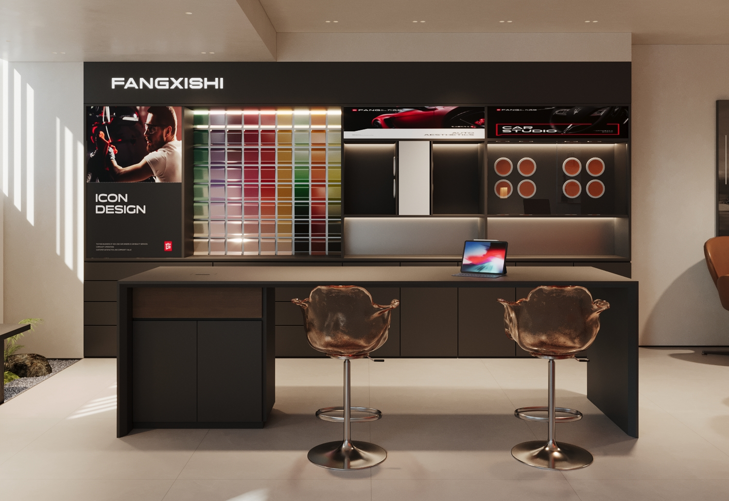 展示洽谈区采用深色背景墙与简洁的陈列布局,将色彩样本、工艺展示板及相关宣传资料有序摆放,直观呈现汽车养护店的服务内容与产品特色,以便顾客了解和选择。