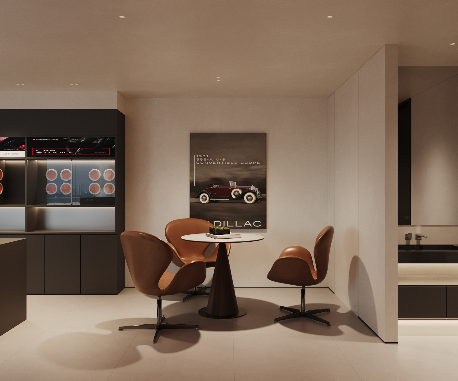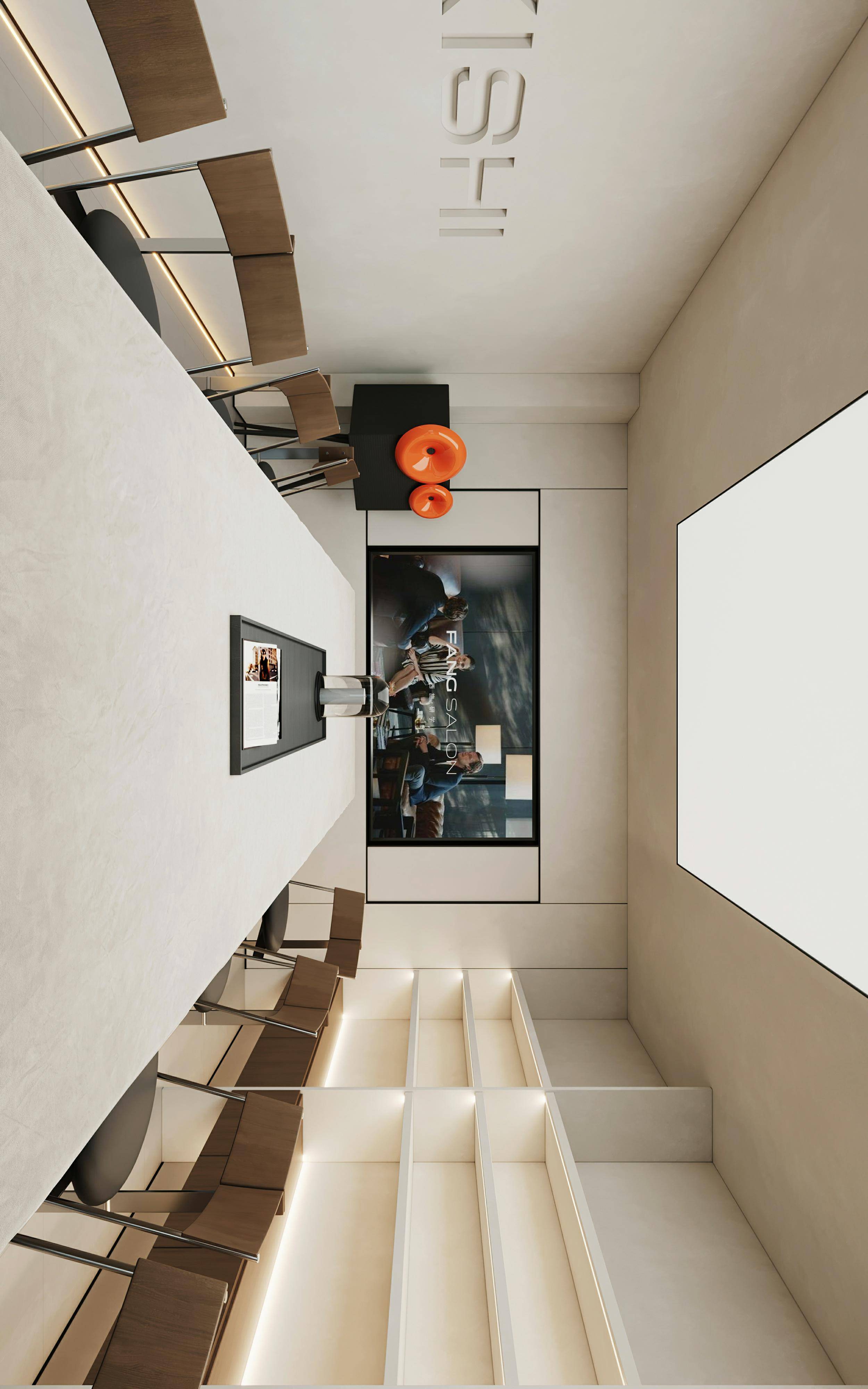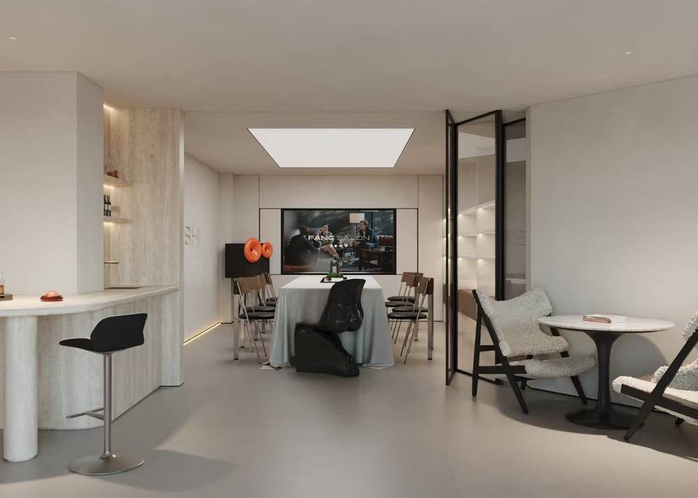 沙龙区以玻璃折叠门作为隔断设计,既保持空间通透性,又能灵活调节私密程度,实现功能与形式的平衡。中央配置规整的会议桌椅,满足多人沙龙活动需求;侧墙通过凹雕工艺呈现品牌logo,以沉稳的视觉语言传递品质感,强化品牌记忆点。