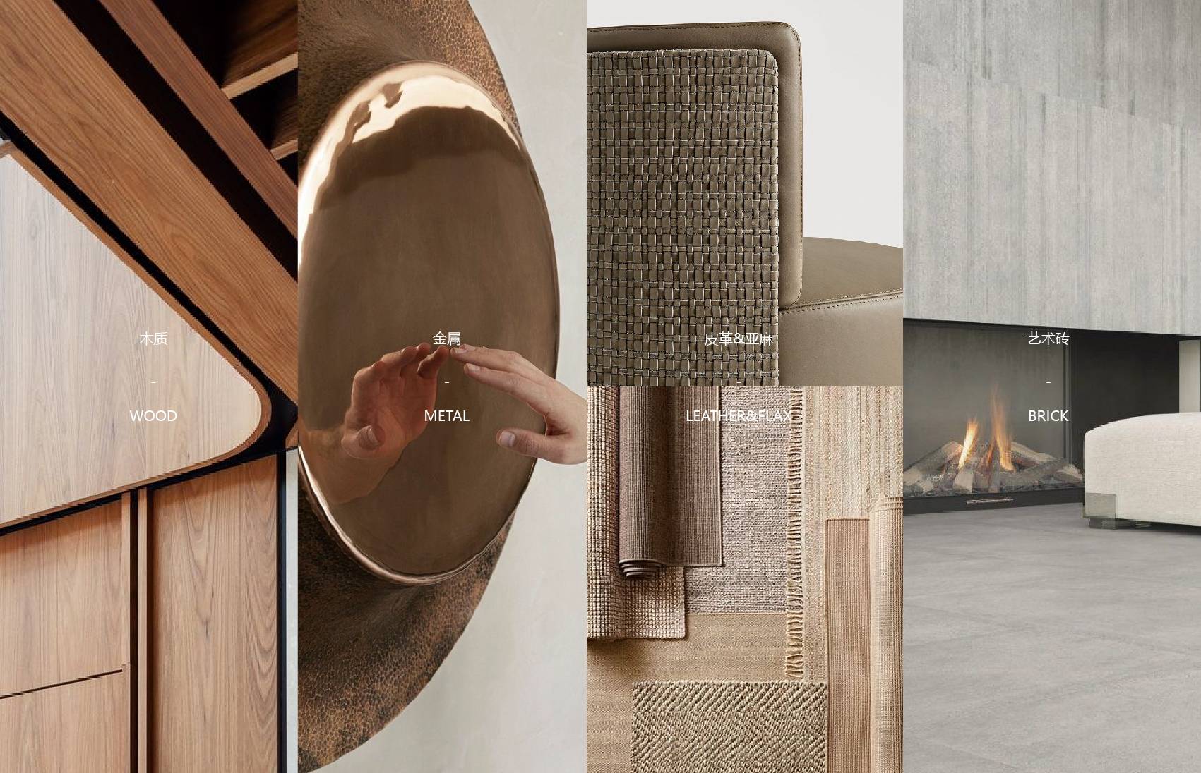 以温润天然的木质为主要材质,通过亲和力与疗愈感营造舒缓氛围;哑光金属与细腻皮革的碰撞注入现代理性格调,艺术砖的斑驳肌理则串联起历史厚度与现代审美。三者刚柔并济,在材质对话中构建出传统与现代交融、功能与精神平衡的复合型场域。