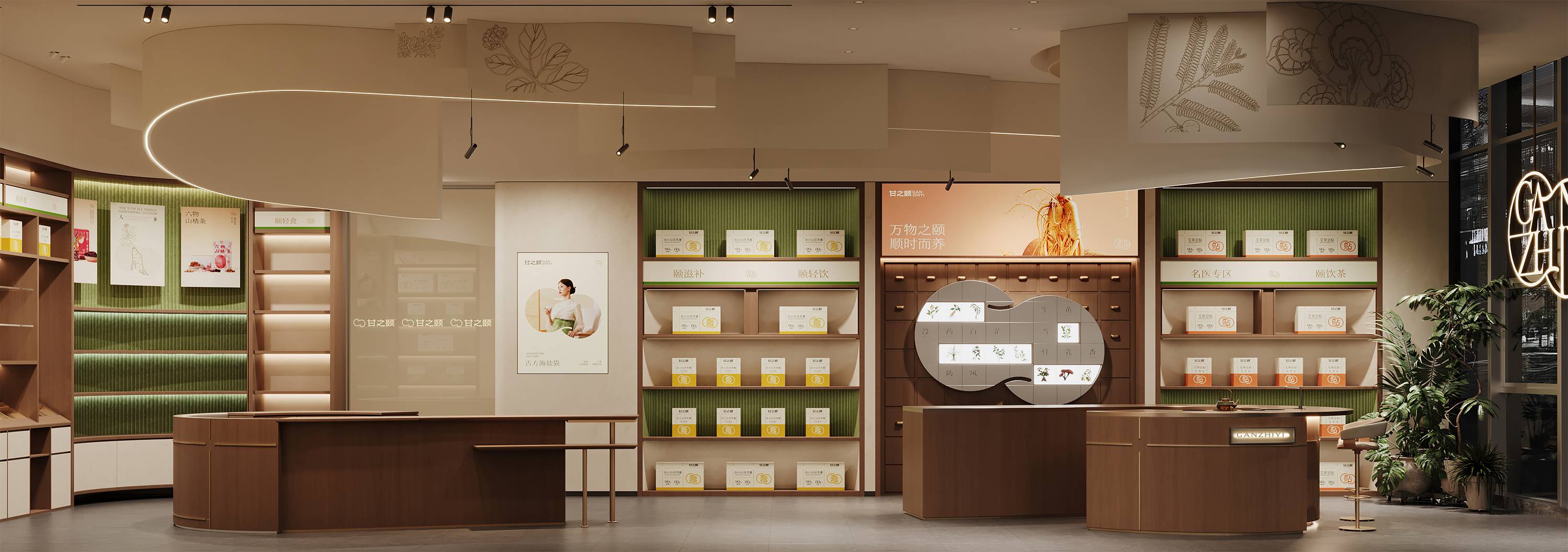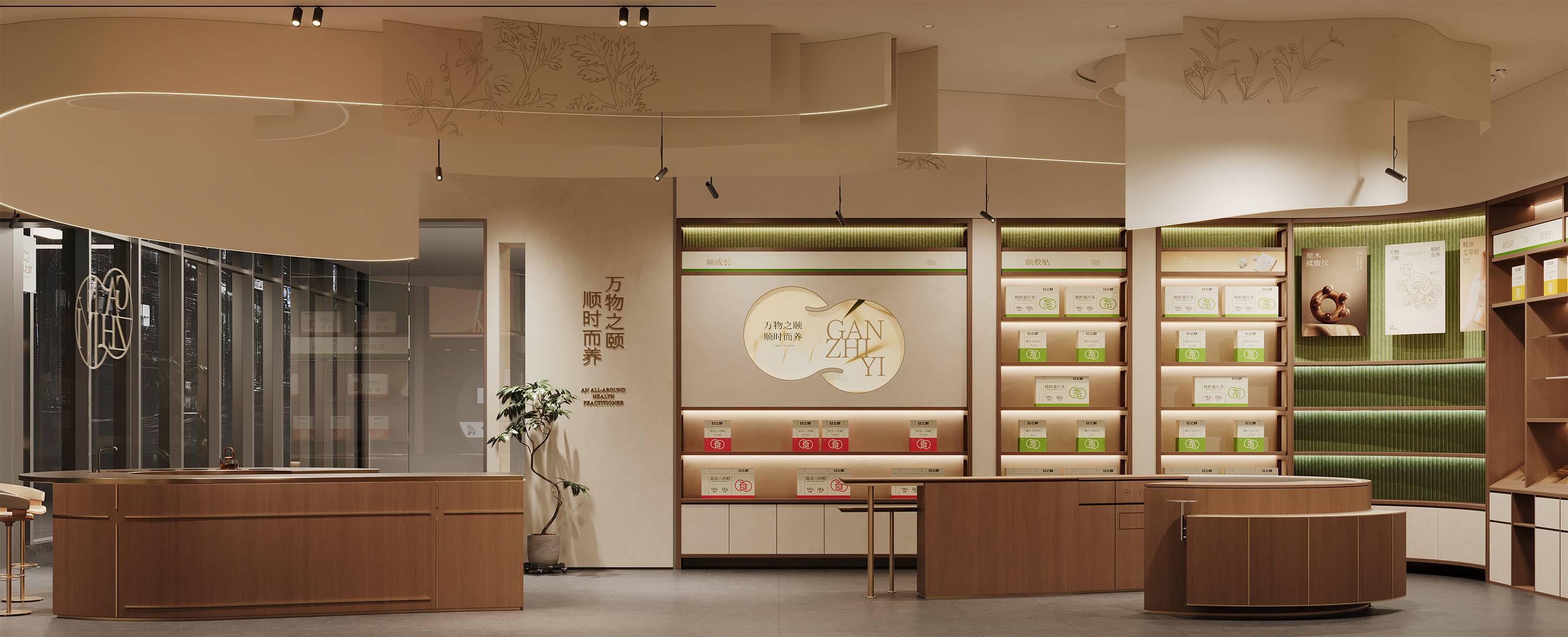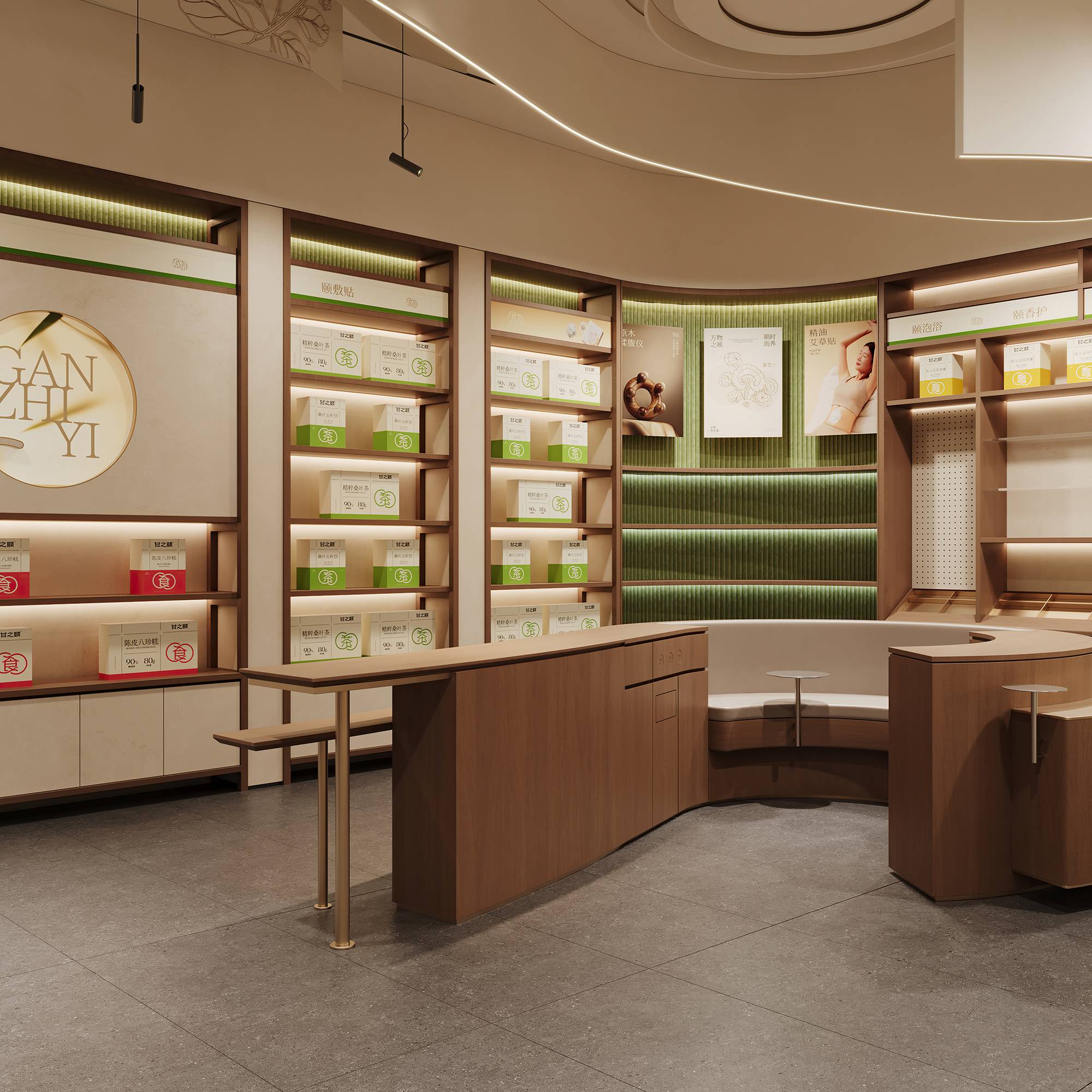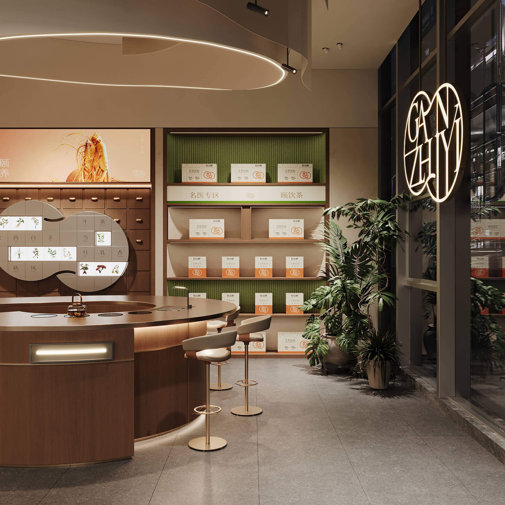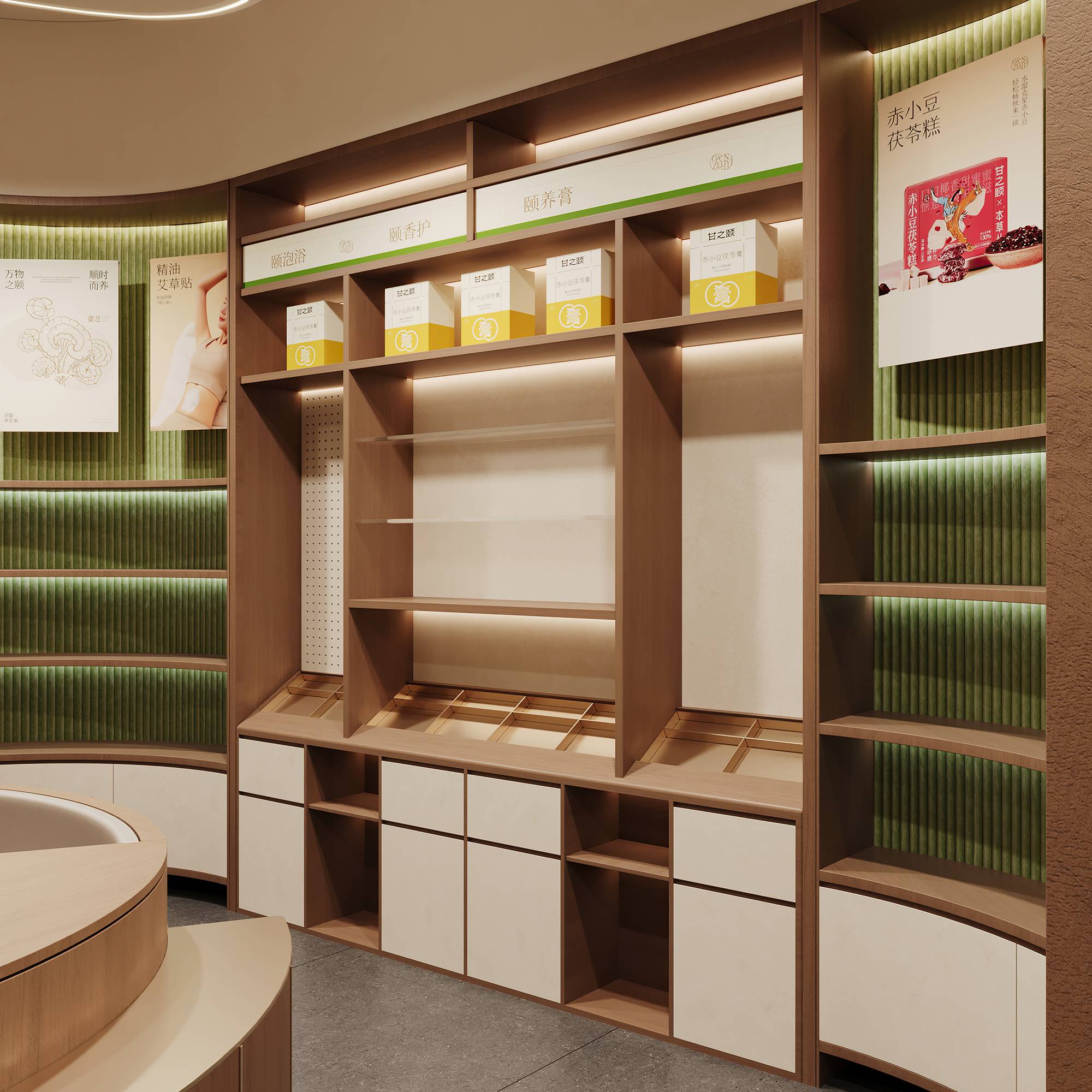 以柔和的杏白色奠定基调,形成包容且舒缓的底色;沉稳的棕色与之形成冷暖平衡,暗合中医阴阳调和理念。加入品牌绿色,作为空间的点睛之笔,为空间注入静谧的生机,呼应“木主生发”的生命能量。三色交织,营造出沉稳而不失灵动的空间氛围,诠释中医自然疗愈理念。