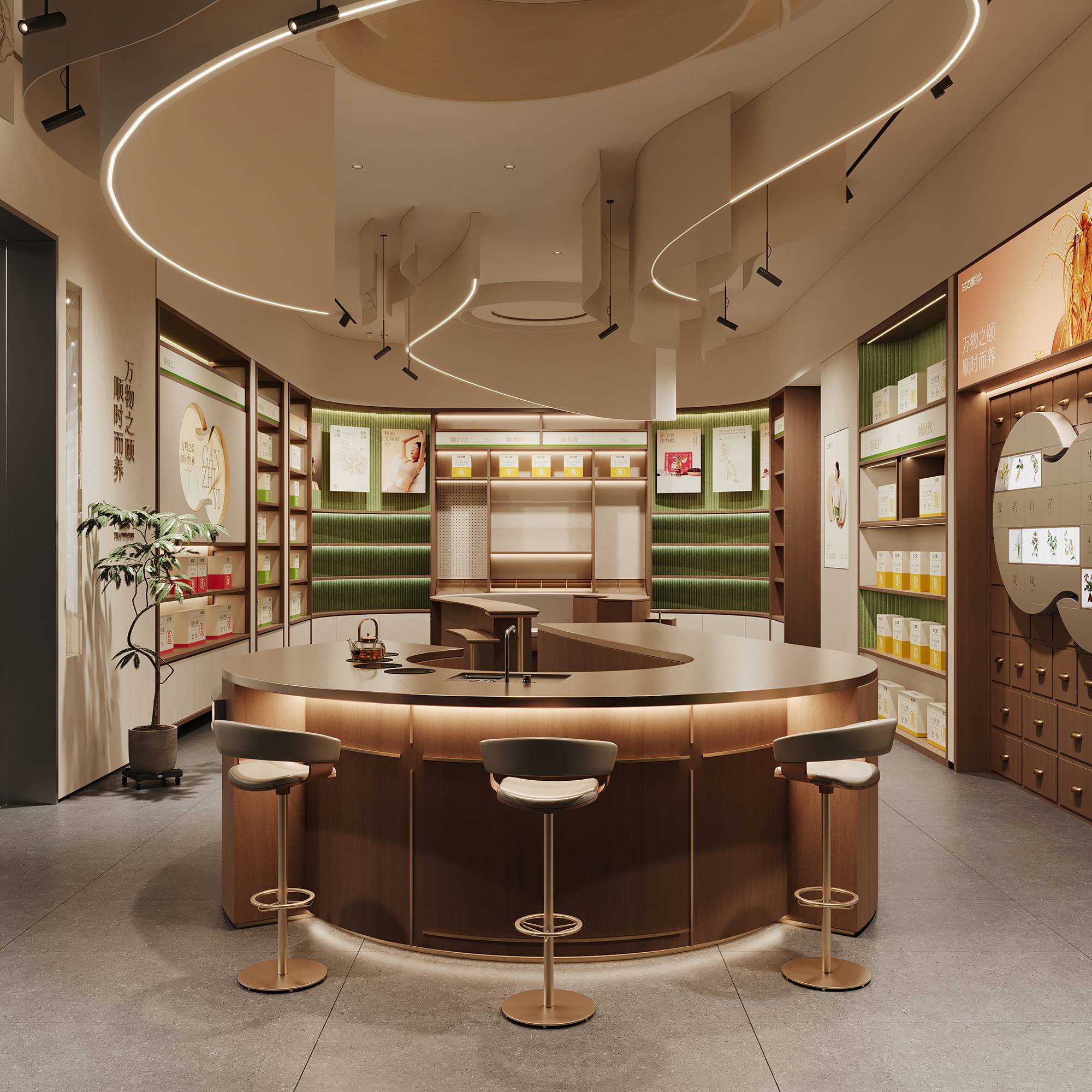 入口侧中岛构成开放洽谈区,顾客可在此围坐交流、试用产品,感受品牌倡导的“慢养”氛围。对侧中岛通过内收弧线围合VIP空间,品质皮革卡座搭配独立操作台,以满足VIP客户定制养生方案的需求。两者间留白区域形成自然过渡,顶面延展的草本纹样吊顶串联起整体空间,以流云般的曲线呼应传统养生文化的底蕴。
