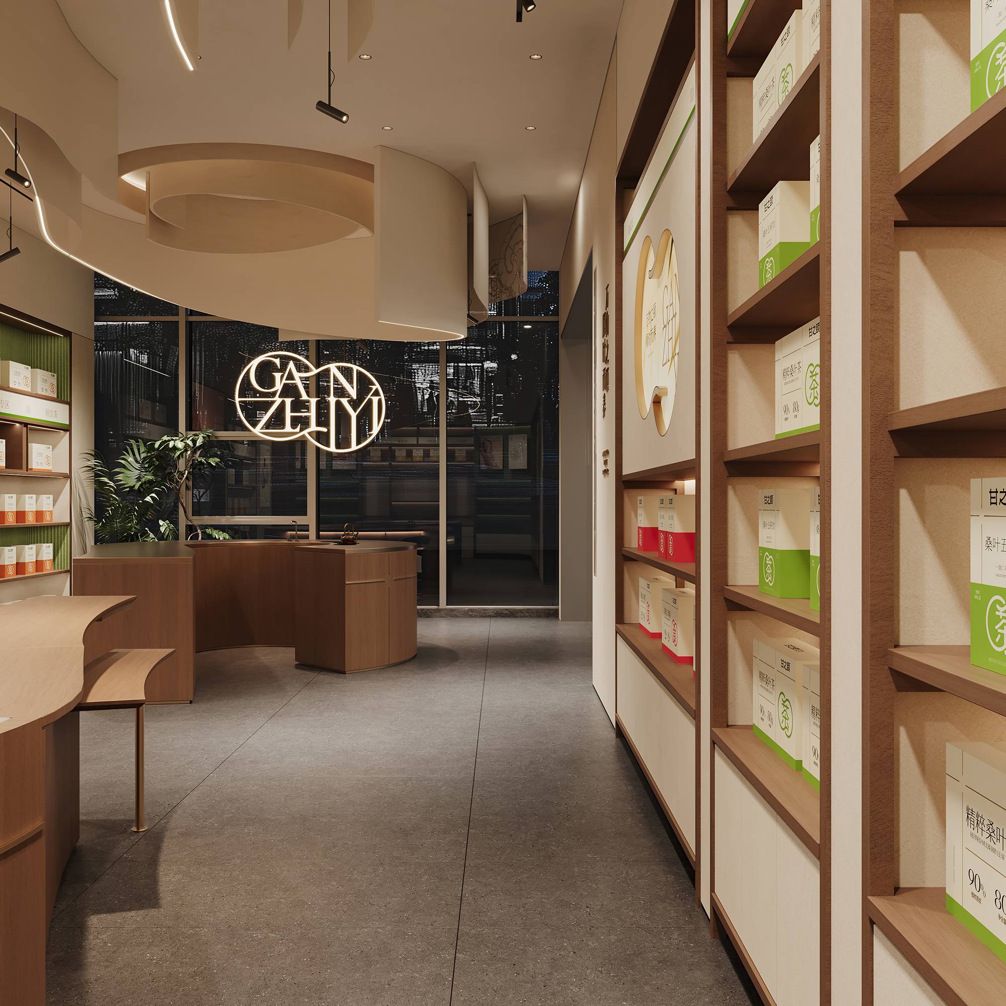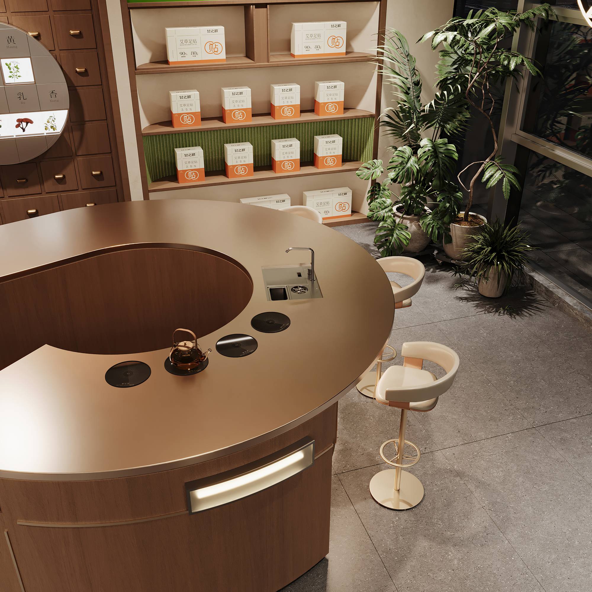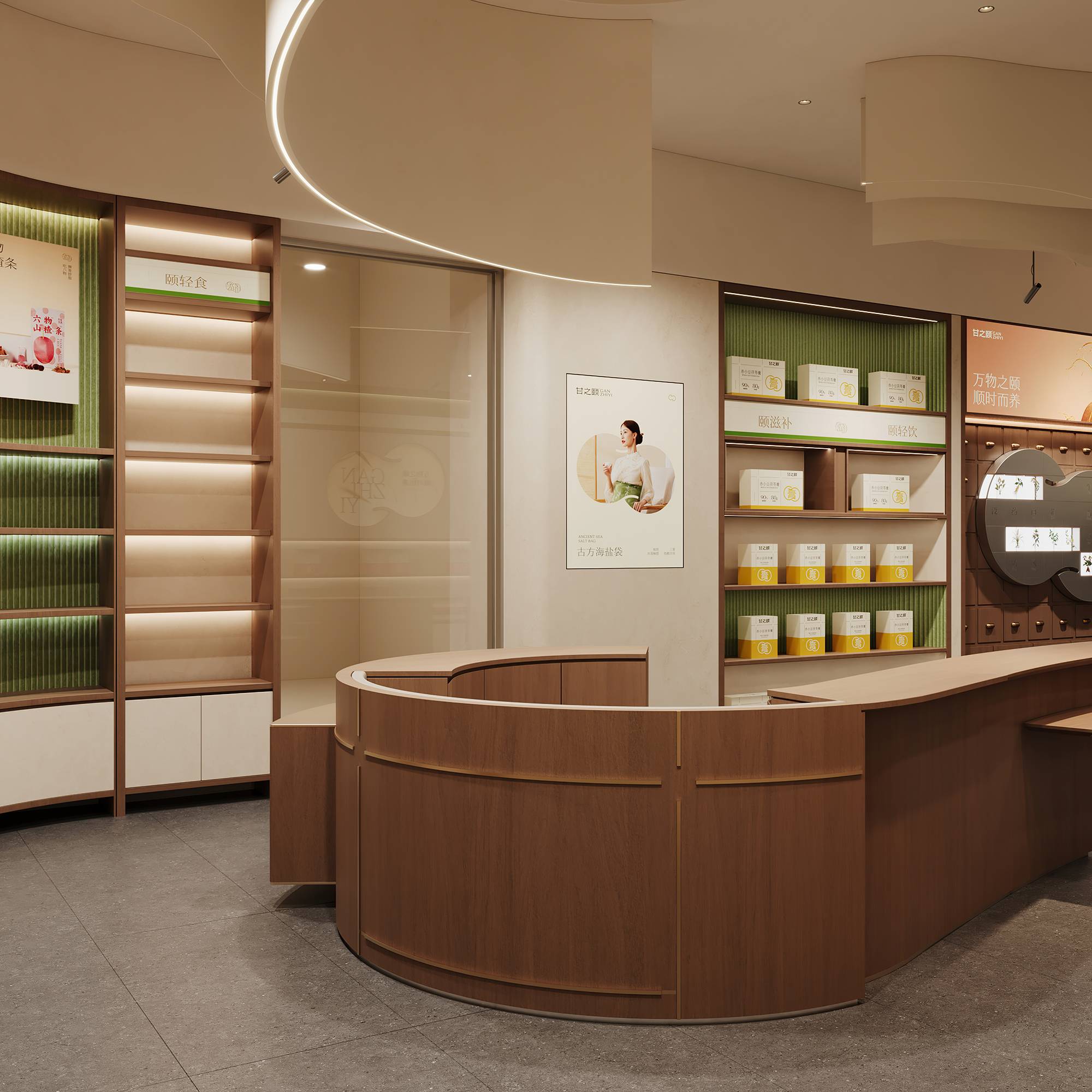 步入店内,空间以“动线引导+功能分区”构建沉浸式养生场景。两组半围合木饰面中岛台分置两侧,其蜿蜒形态是品牌符号的实体演绎,如同被自然分割的循环符号,暗示养生之道的永续性。