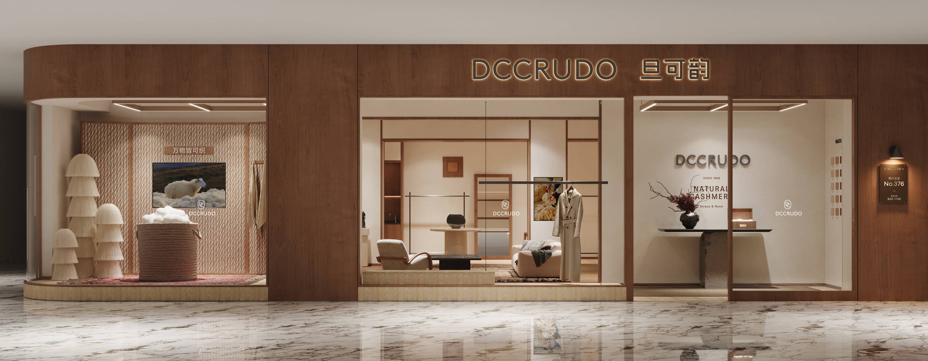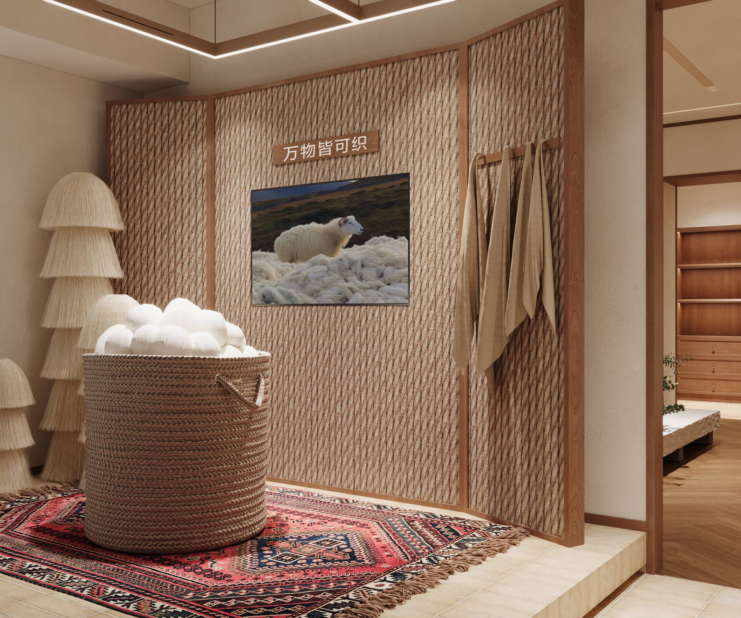 入口处如一场温柔的仪式,中古风的雅致松弛里,透着品牌对天然质感的精微把控。橱窗则聚焦“编织” 主题,编织纹理墙面、羊毛元素陈列与民族风地毯层层叠合,将天然纤维的原生质感与工艺温度具象化,使橱窗成为品牌理念的立体缩影。