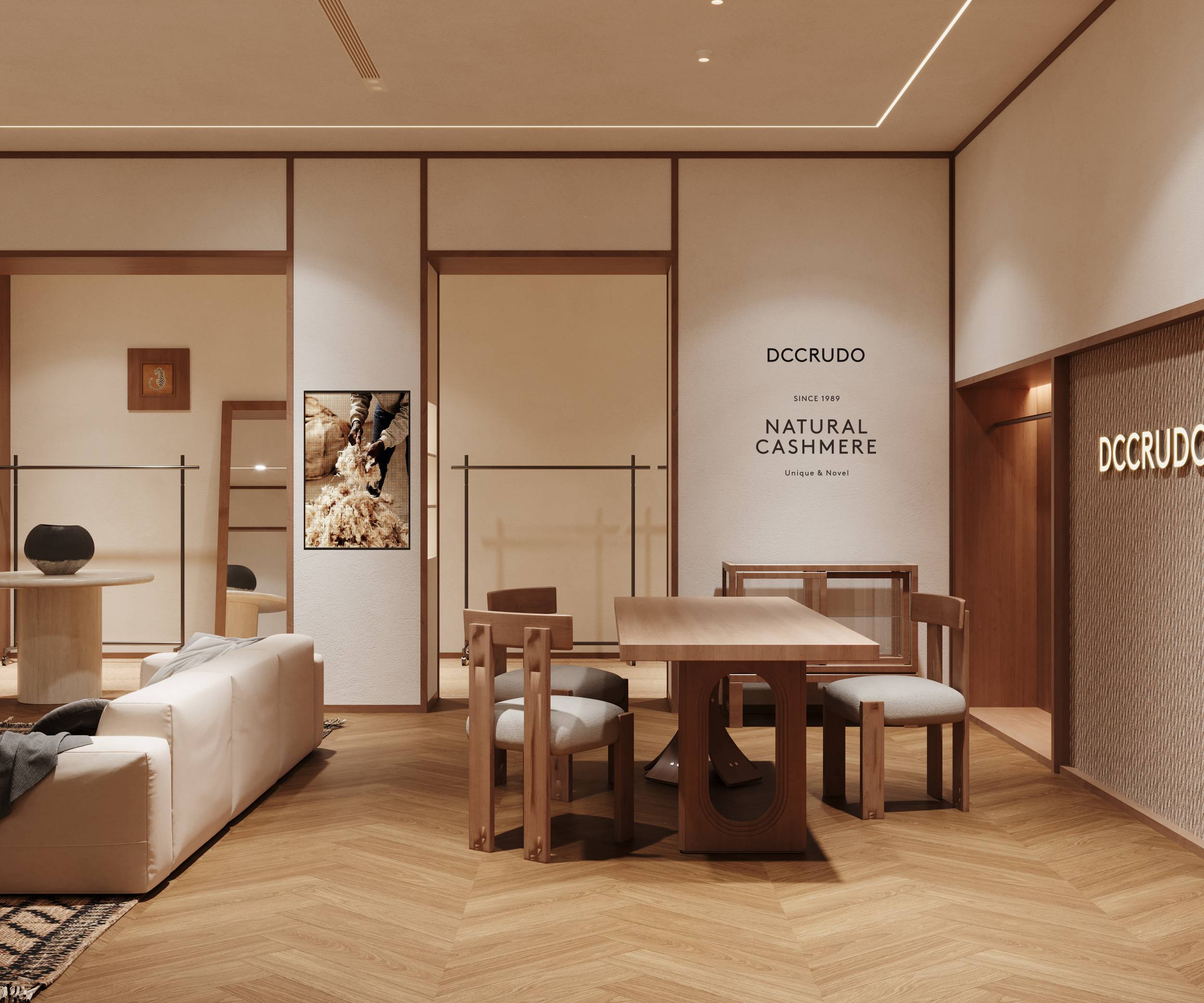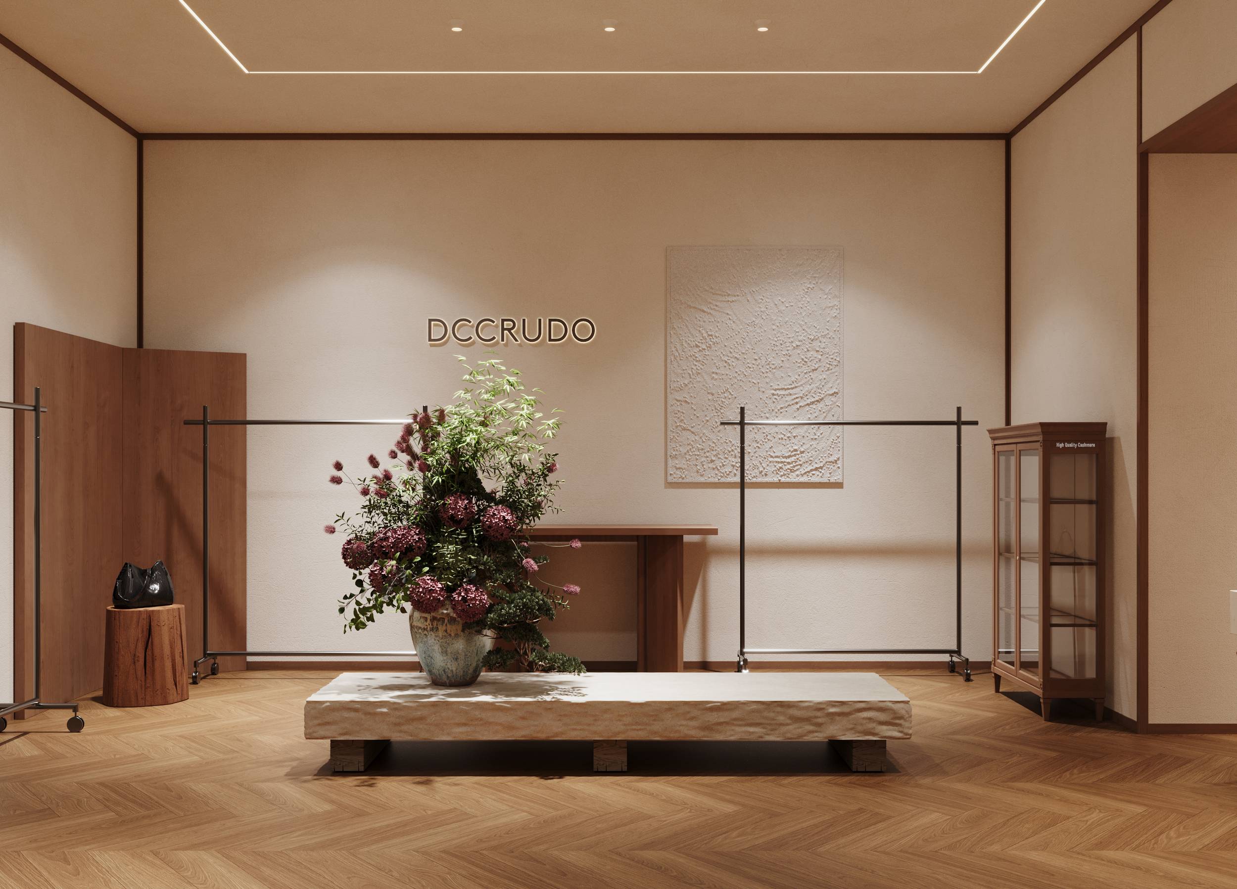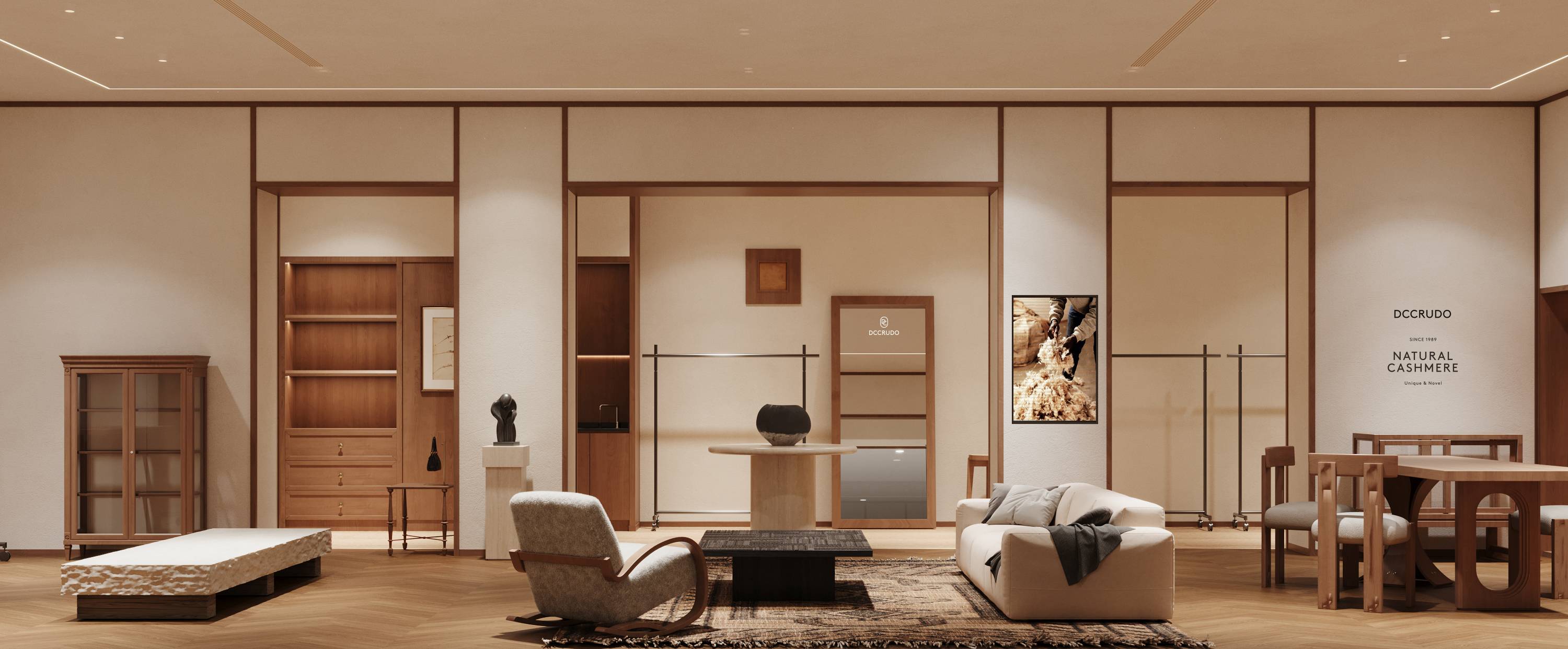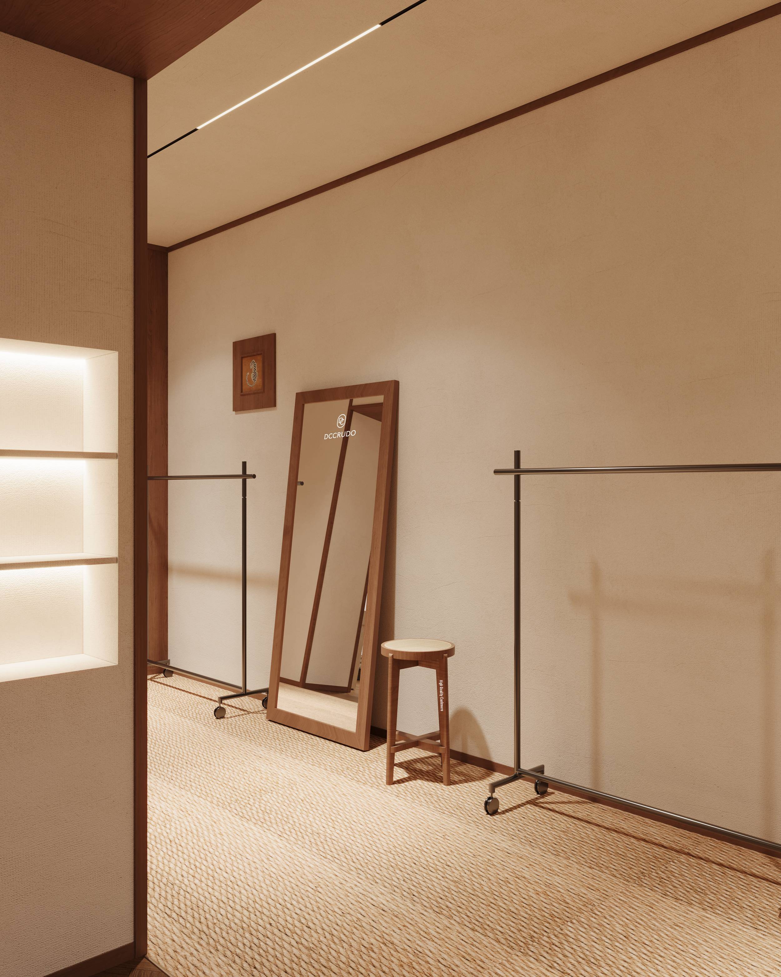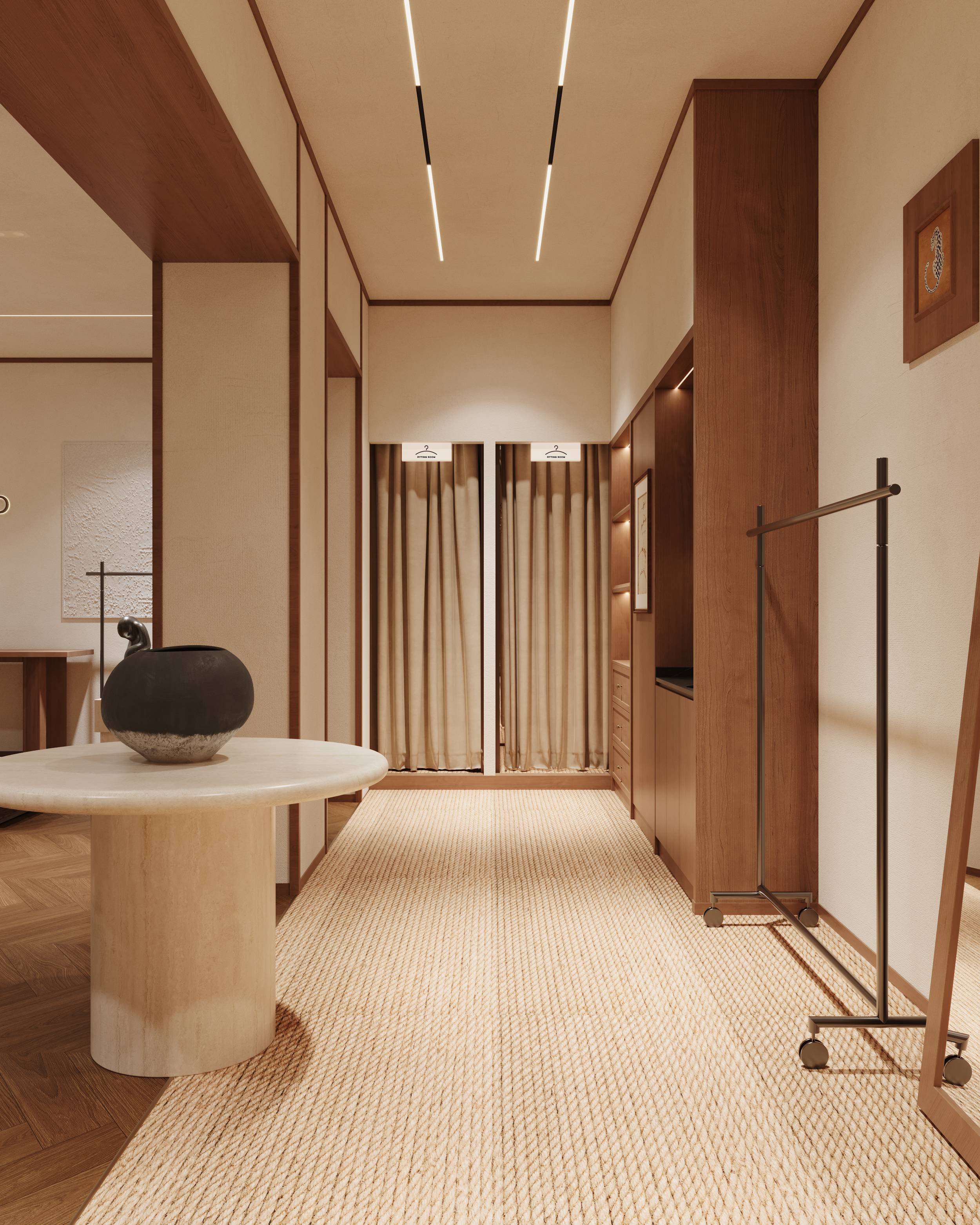 开阔与围合自然过渡,衣物的陈列区、供人小憩的沙发、商务洽谈的长桌与隐于幕后的试衣间,都像生长于斯般妥帖安放。动线如溪水般舒缓,无声地邀请脚步慢下来,在探索与静思间找到内心的节奏。