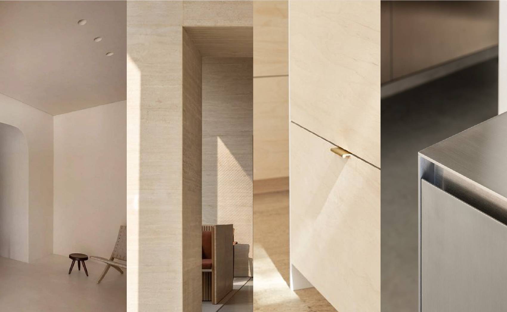 空间之中,艺术涂料搭配海洋板组合,着力营造自然、舒适的场景印象。同时,洞石的细腻质感与天然纹理,碰撞金属的冷峻,创造一种随性与严谨交织的丰盈体验。