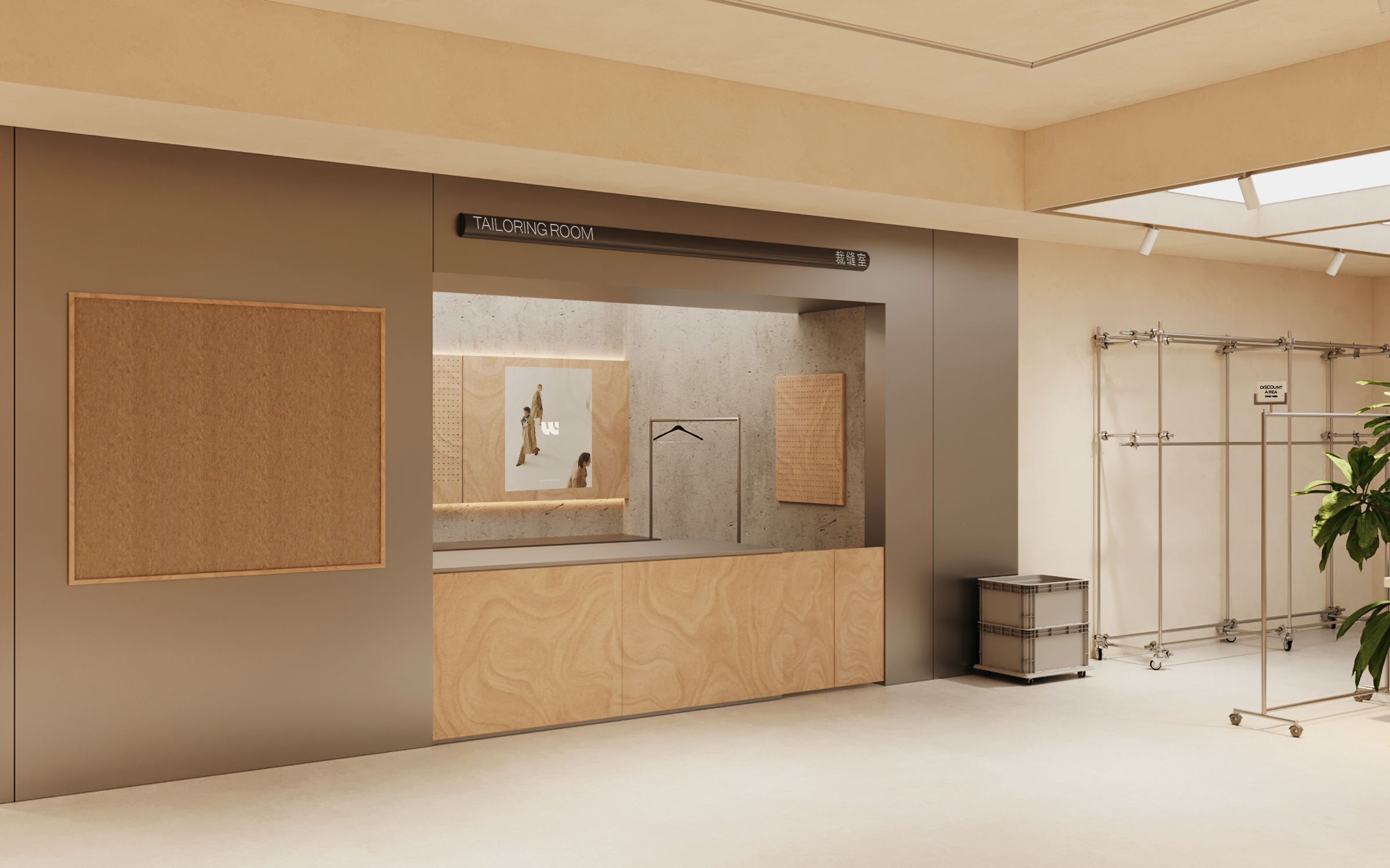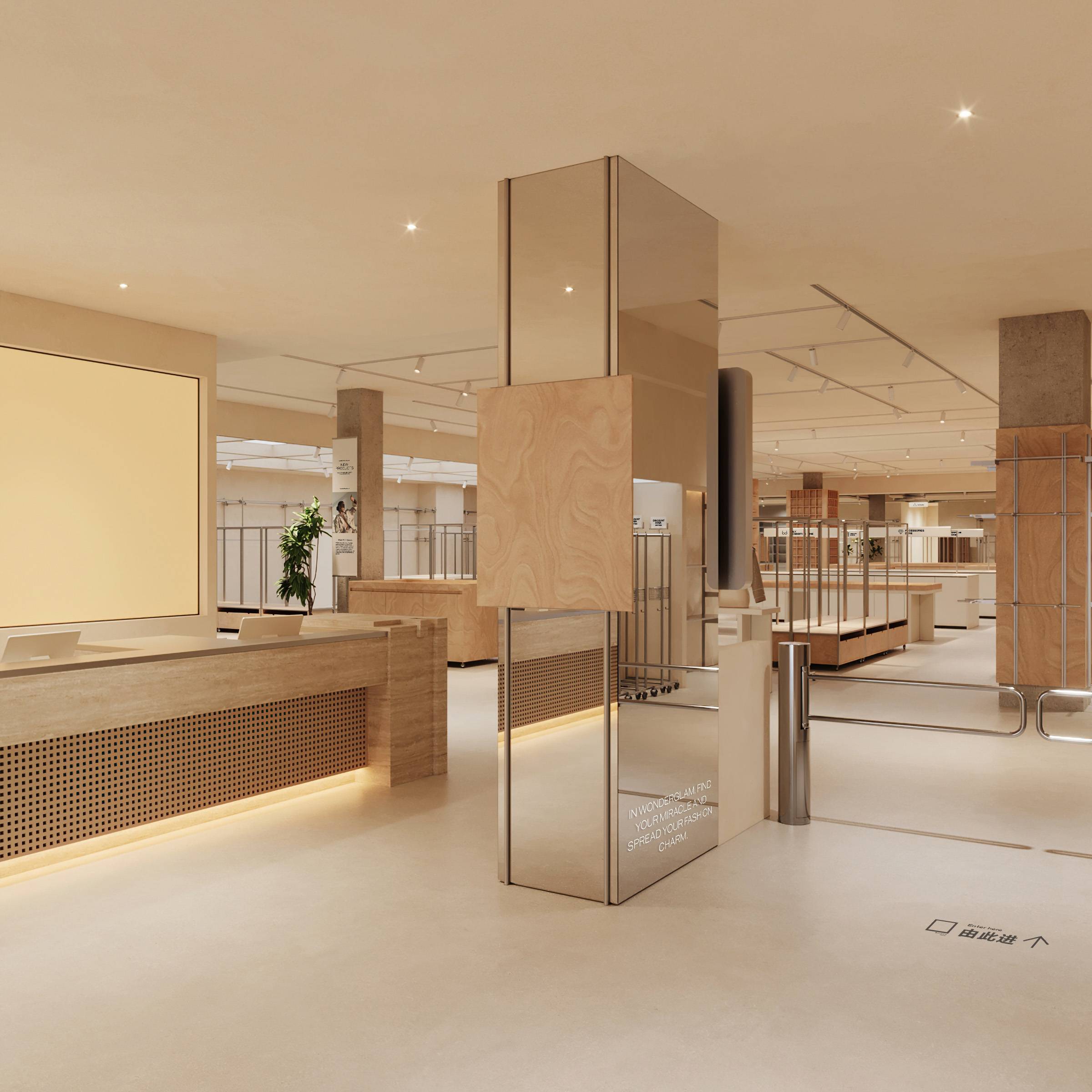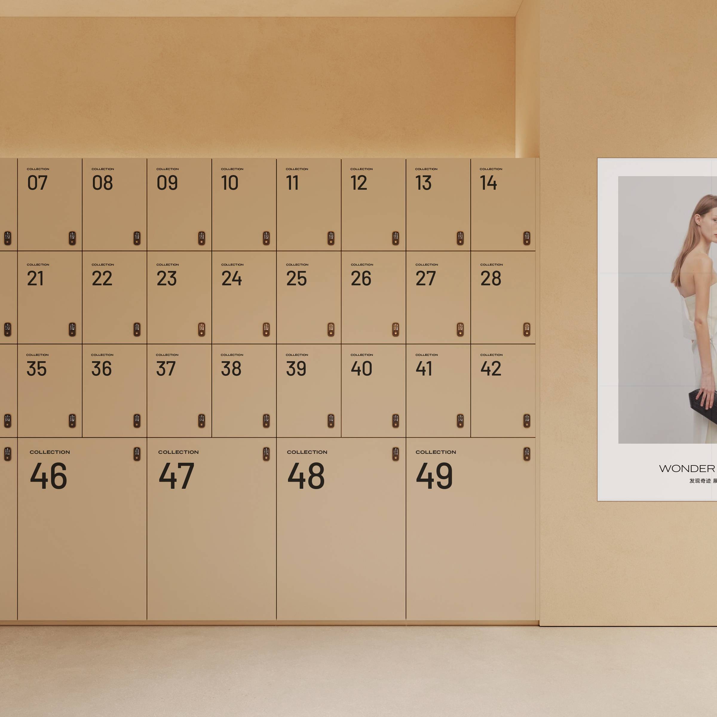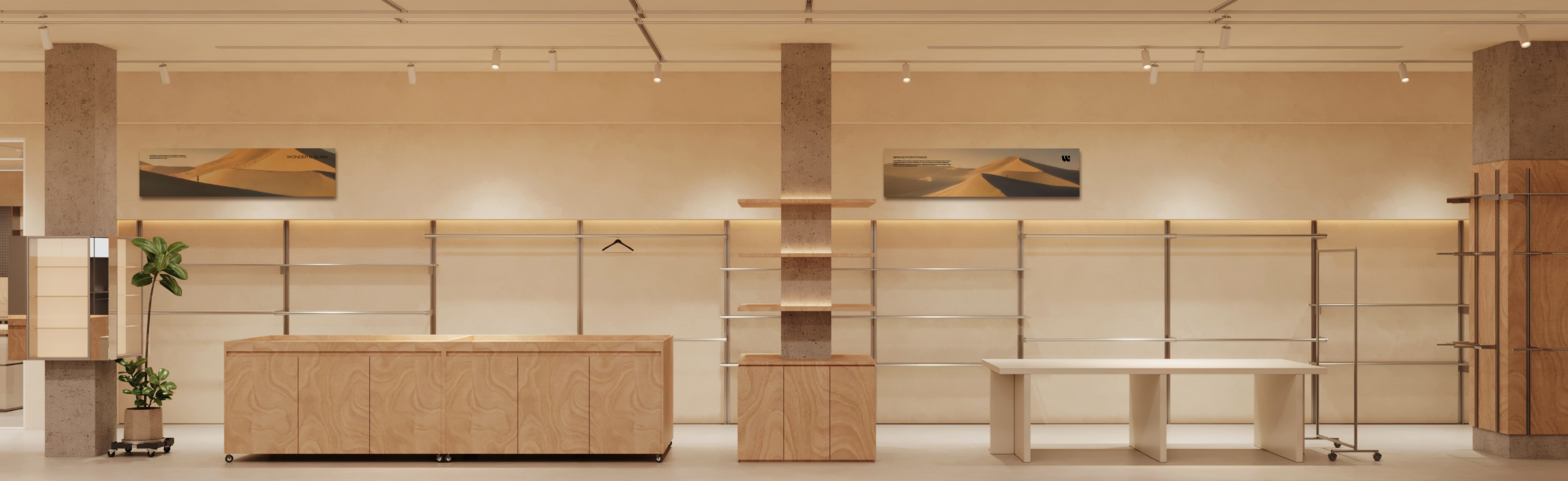 店铺整体以浅色作为空间底色,从米白、浅米到米棕色,层叠交织,营造宁静、舒适的氛围,暖灰色内敛、稳重,在轻盈柔和的基调上增添了一份力量感。