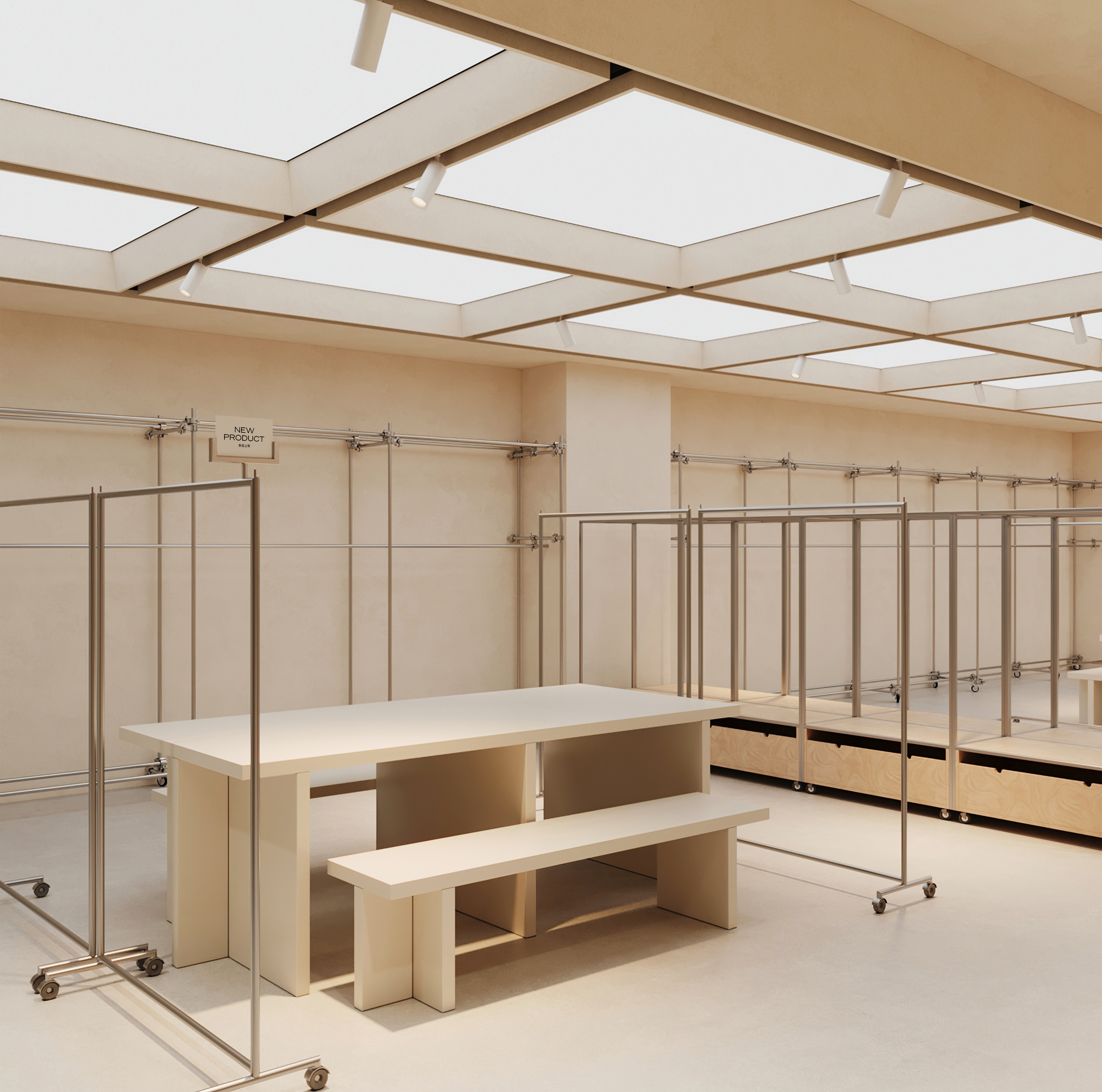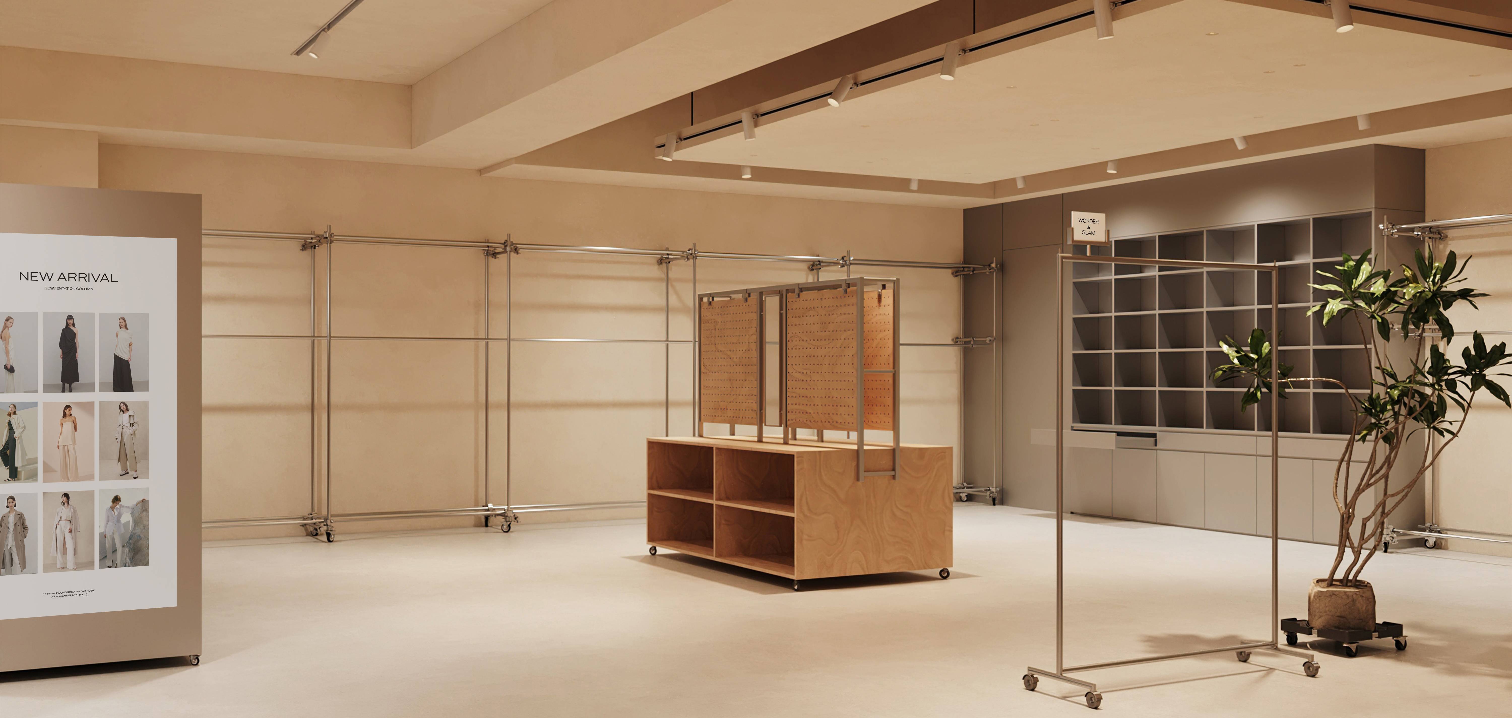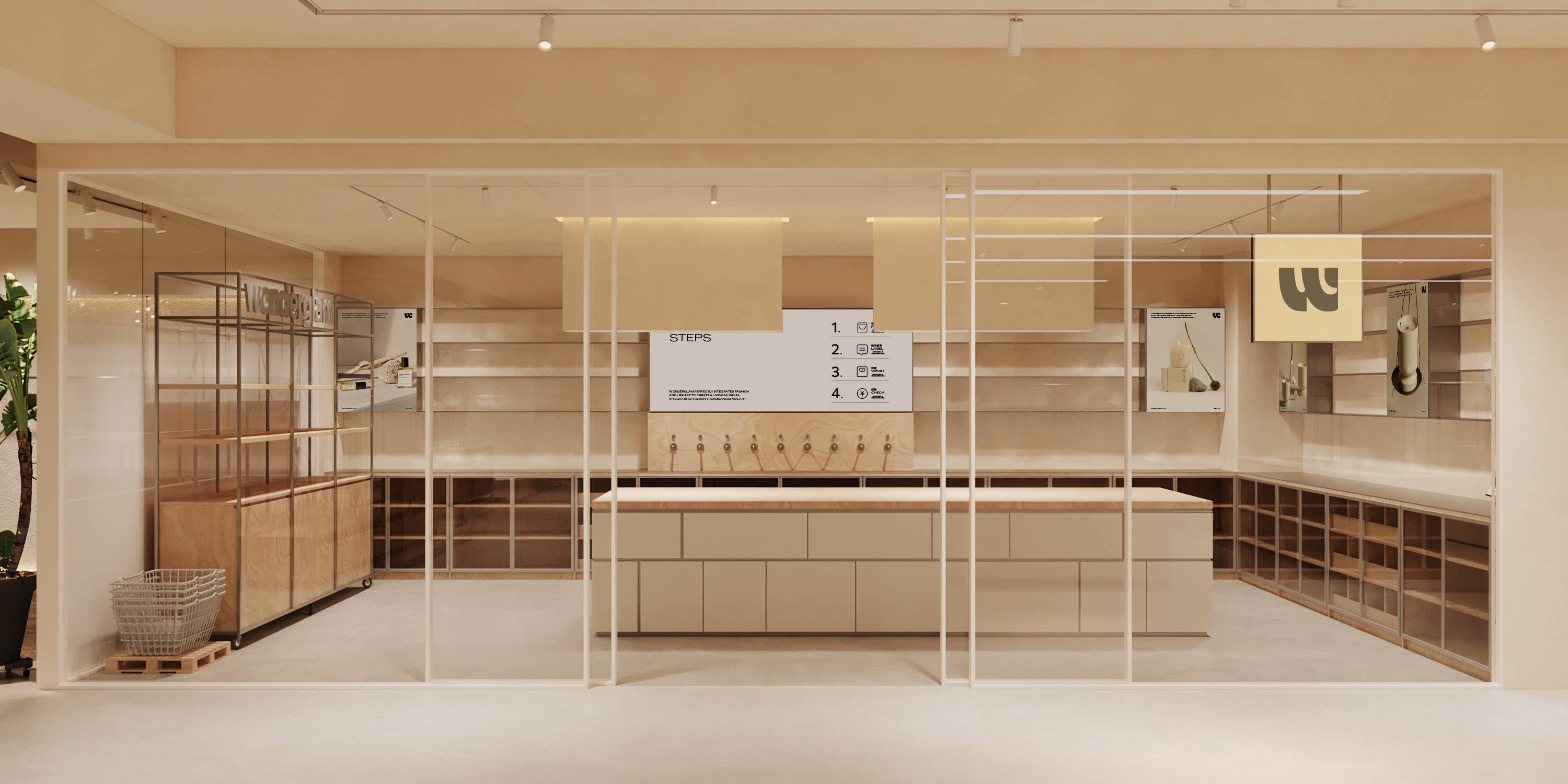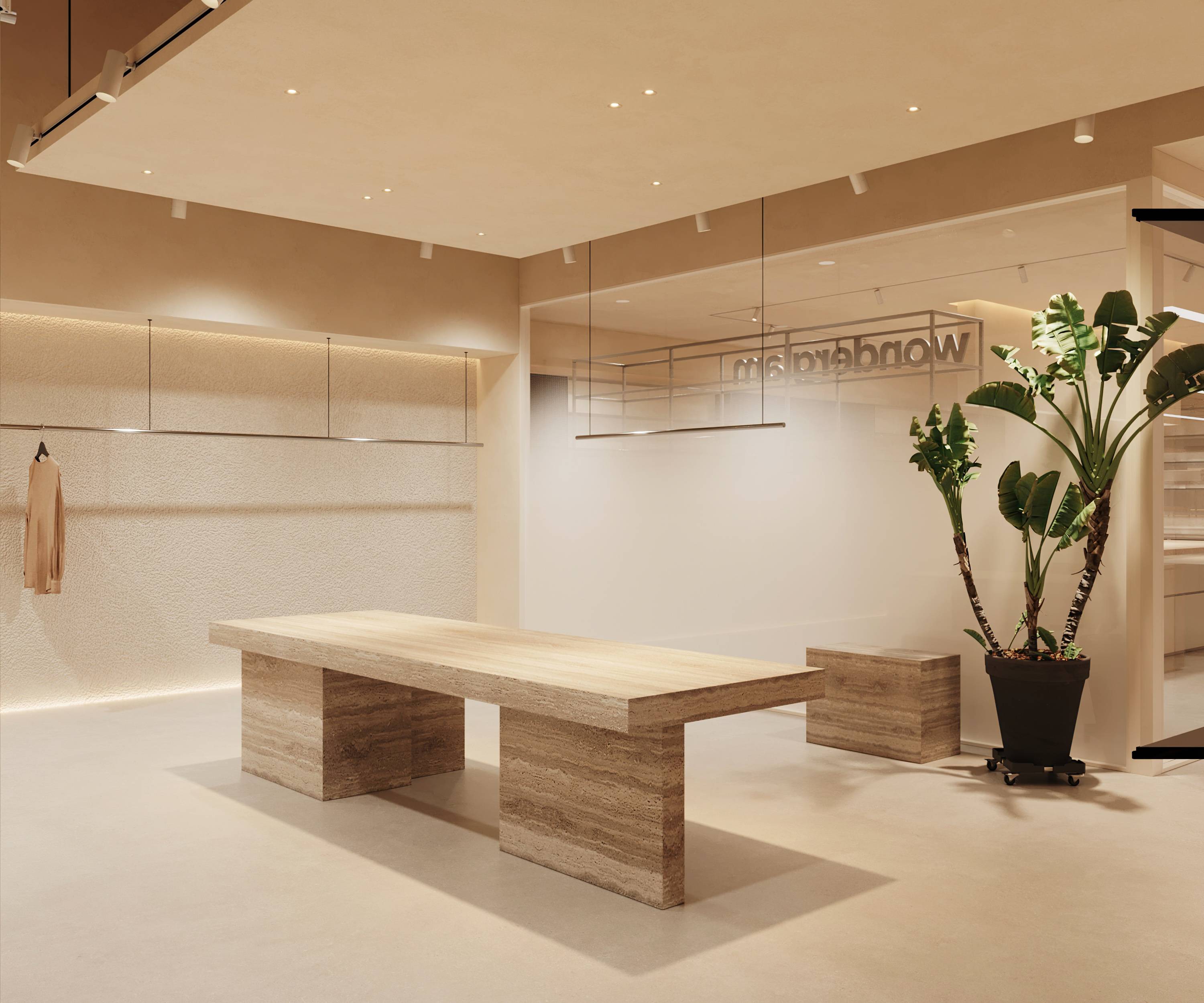 店铺整体以浅色作为空间底色,从米白、浅米到米棕色,层叠交织,营造宁静、舒适的氛围,暖灰色内敛、稳重,在轻盈柔和的基调上增添了一份力量感。