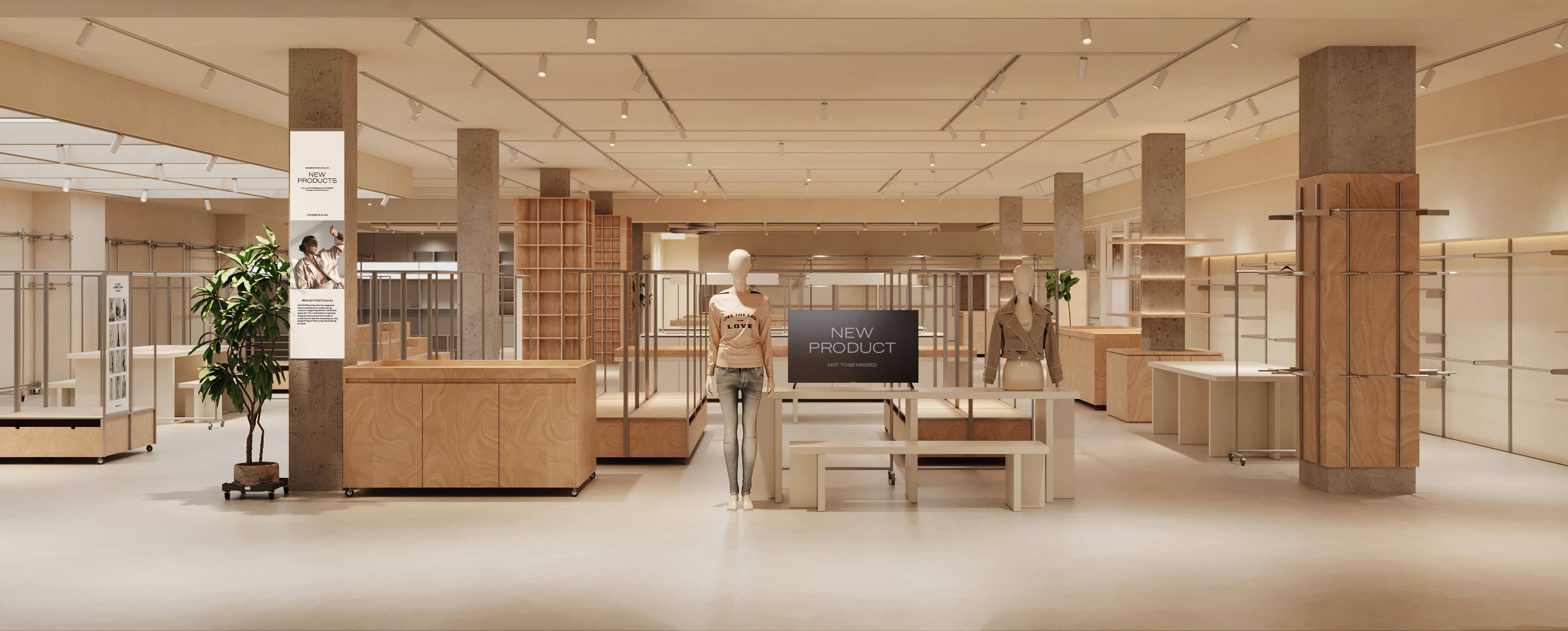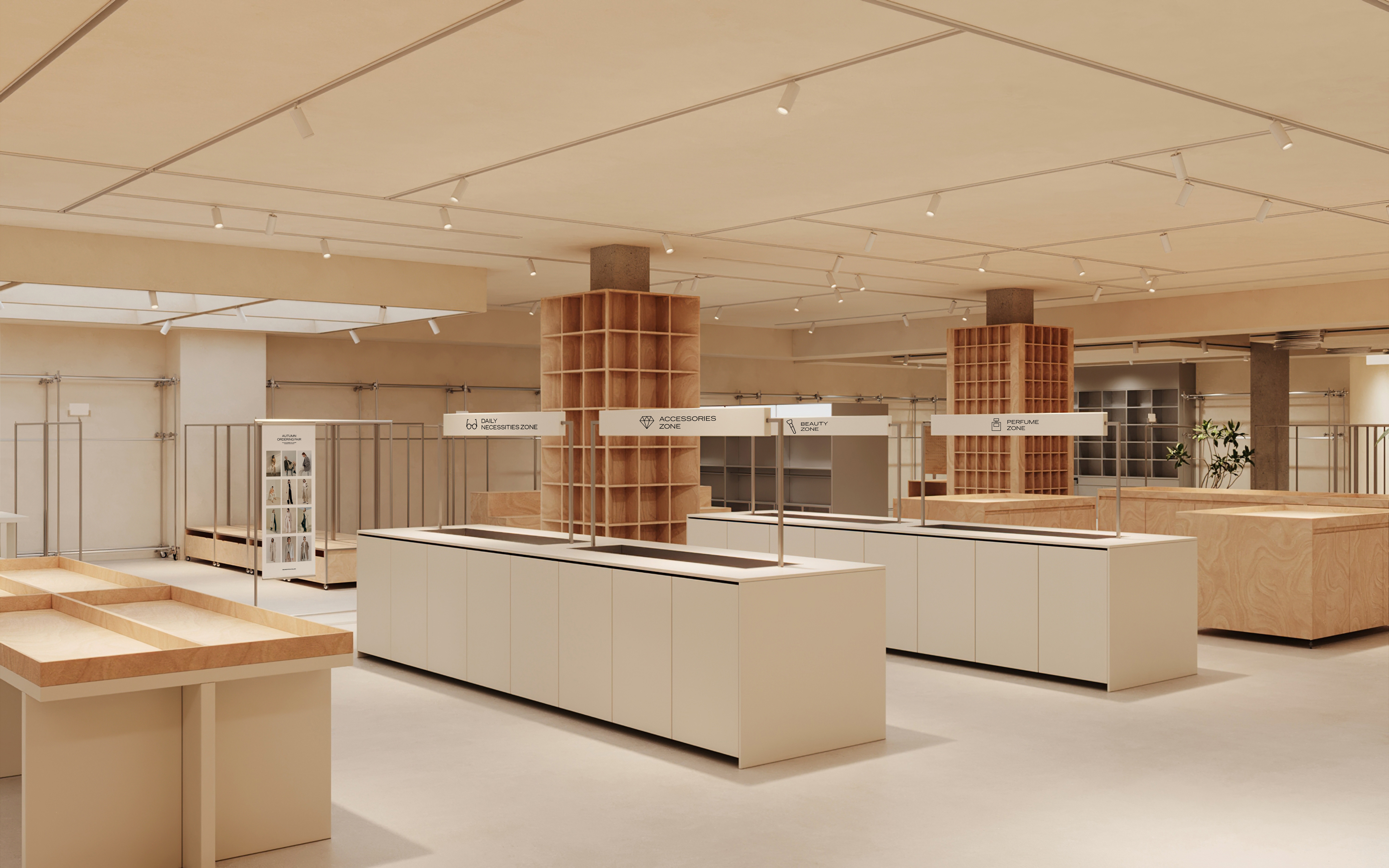 既是流线自由的轻松空间,也是规整的矩形空间,多形式的陈列架与展示柜台错落有致,功能区域清晰划分,打造多元包容的生活方式买手店。