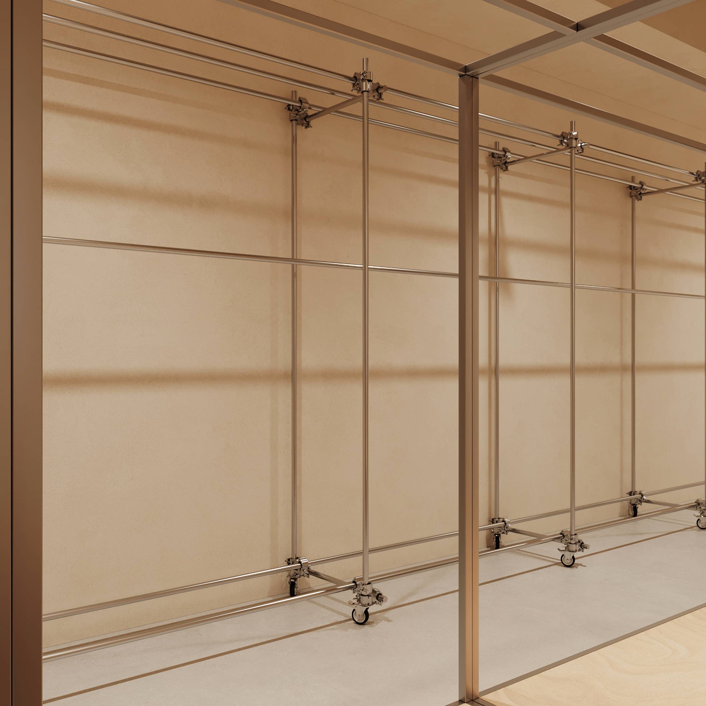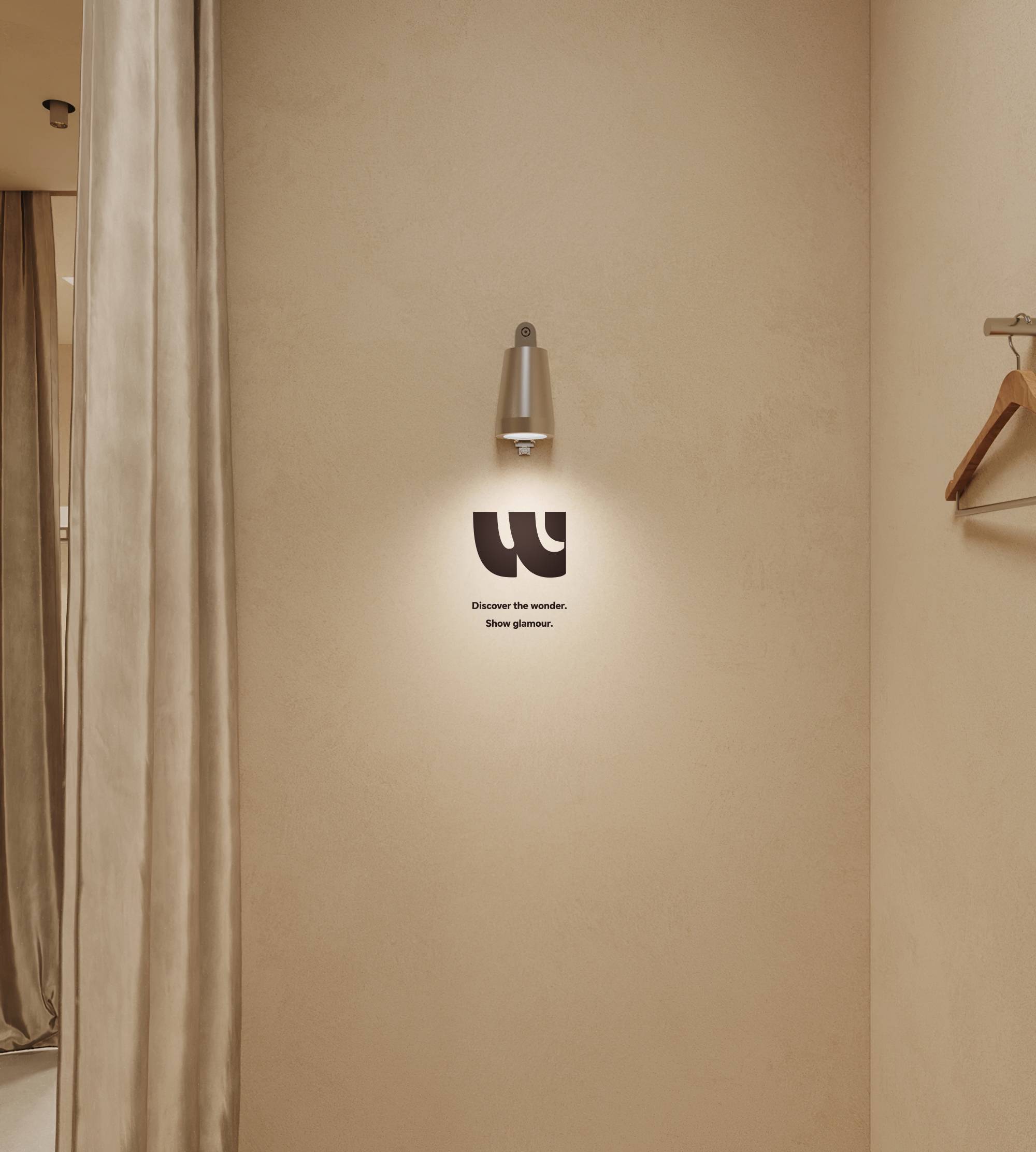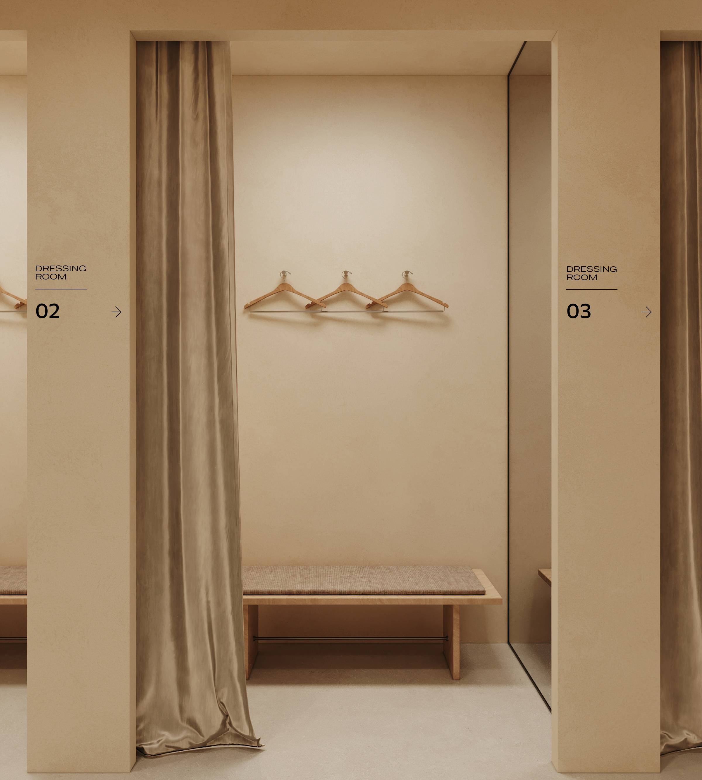 更衣室安静而私密,在走廊尽头安装有茶色镜面不锈钢,微弱映射着店内情景,人群走过的虚影与店内铺陈形成互动,为空间增添生动感。