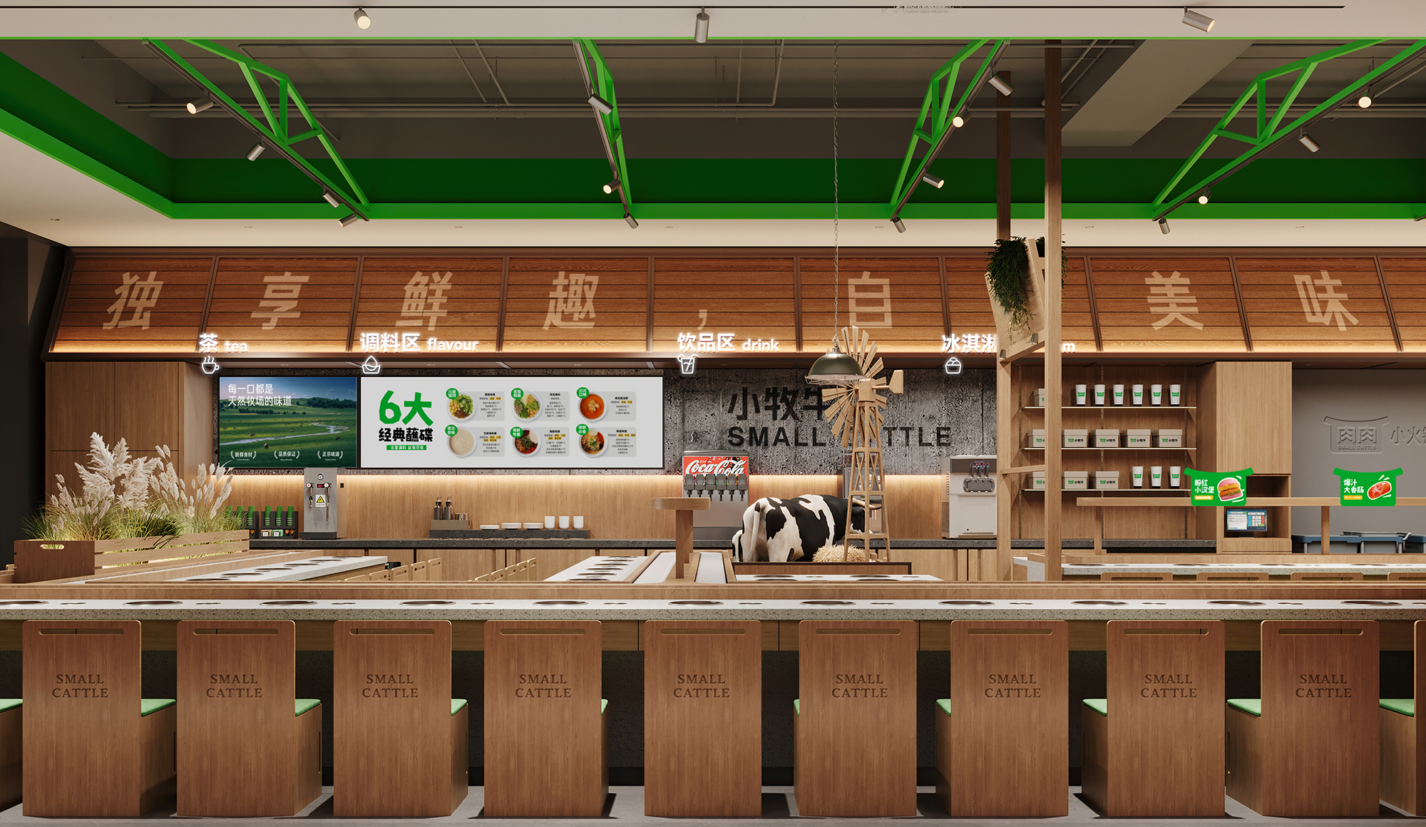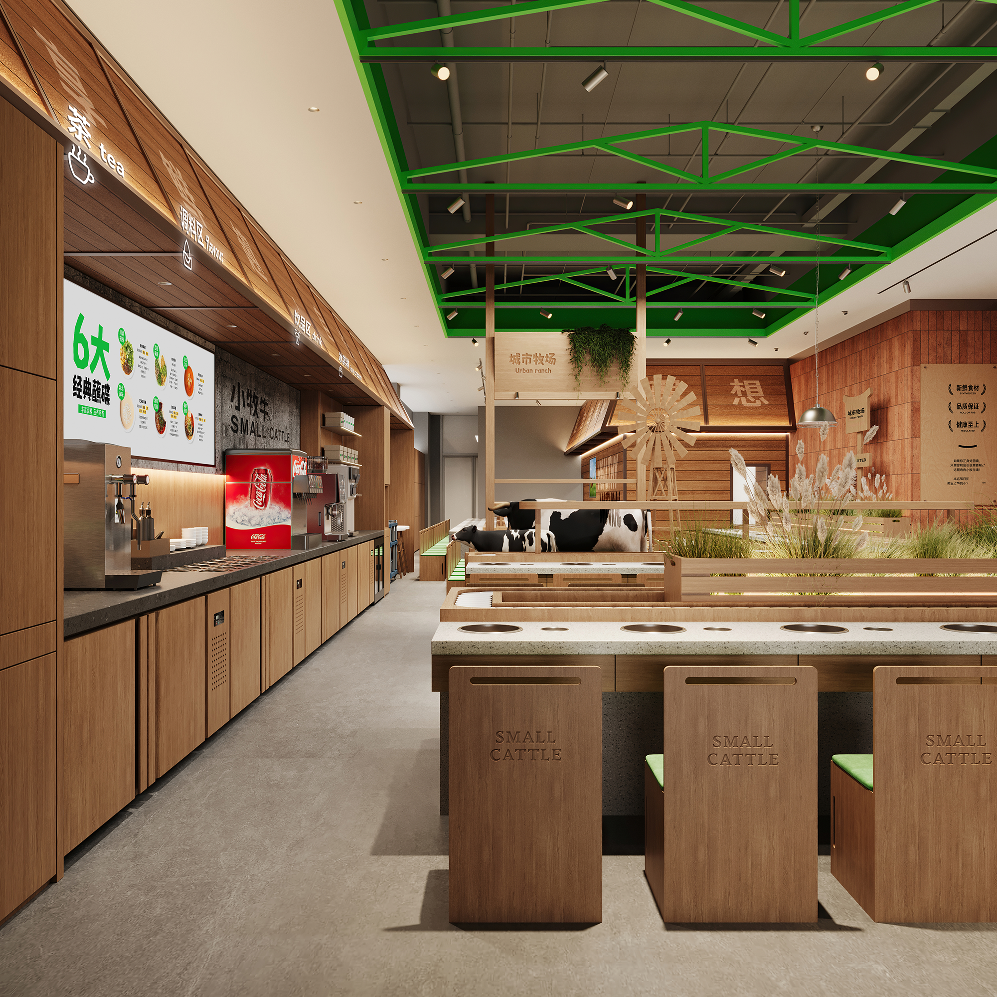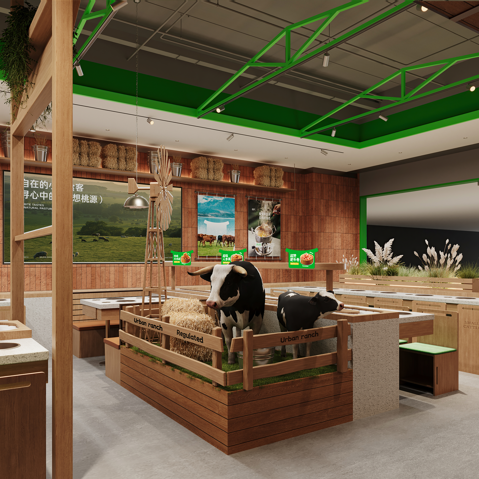顶部以绿色金属框架勾勒出简洁的空间轮廓,其线条轻盈而富有结构感,为空间增添了几分现代笔触。视线下落,巧妙布置的绿植、缓缓转动的风车、蓬松的干草堆与奶牛模型,共同构筑出一处处微型牧场景致,注入恰到好处的生机与野趣。当火锅的热气袅袅升起,在木的温润、绿的呼吸与细节的趣味中,寻得一片城市中的自然绿洲——这一刻,喧嚣渐远,唯余惬意与自在缓缓流动。