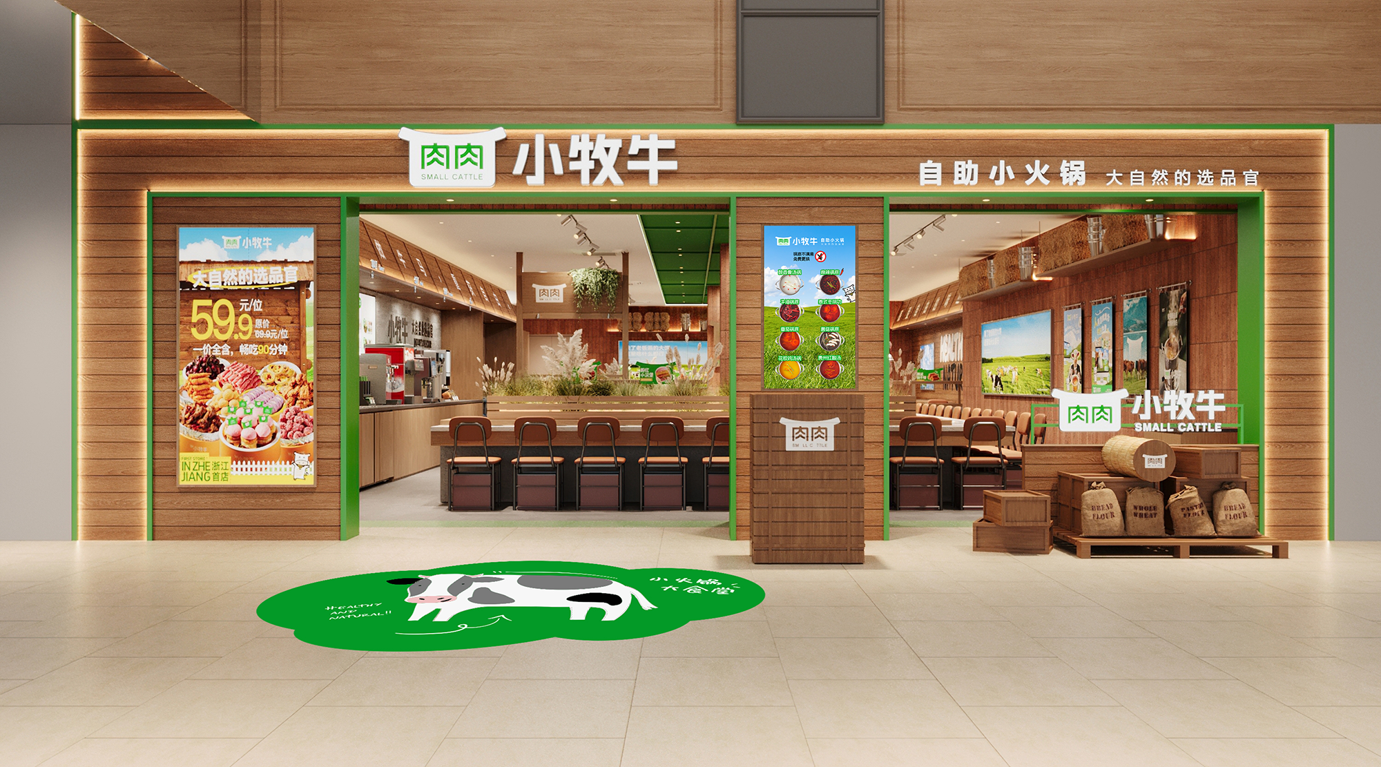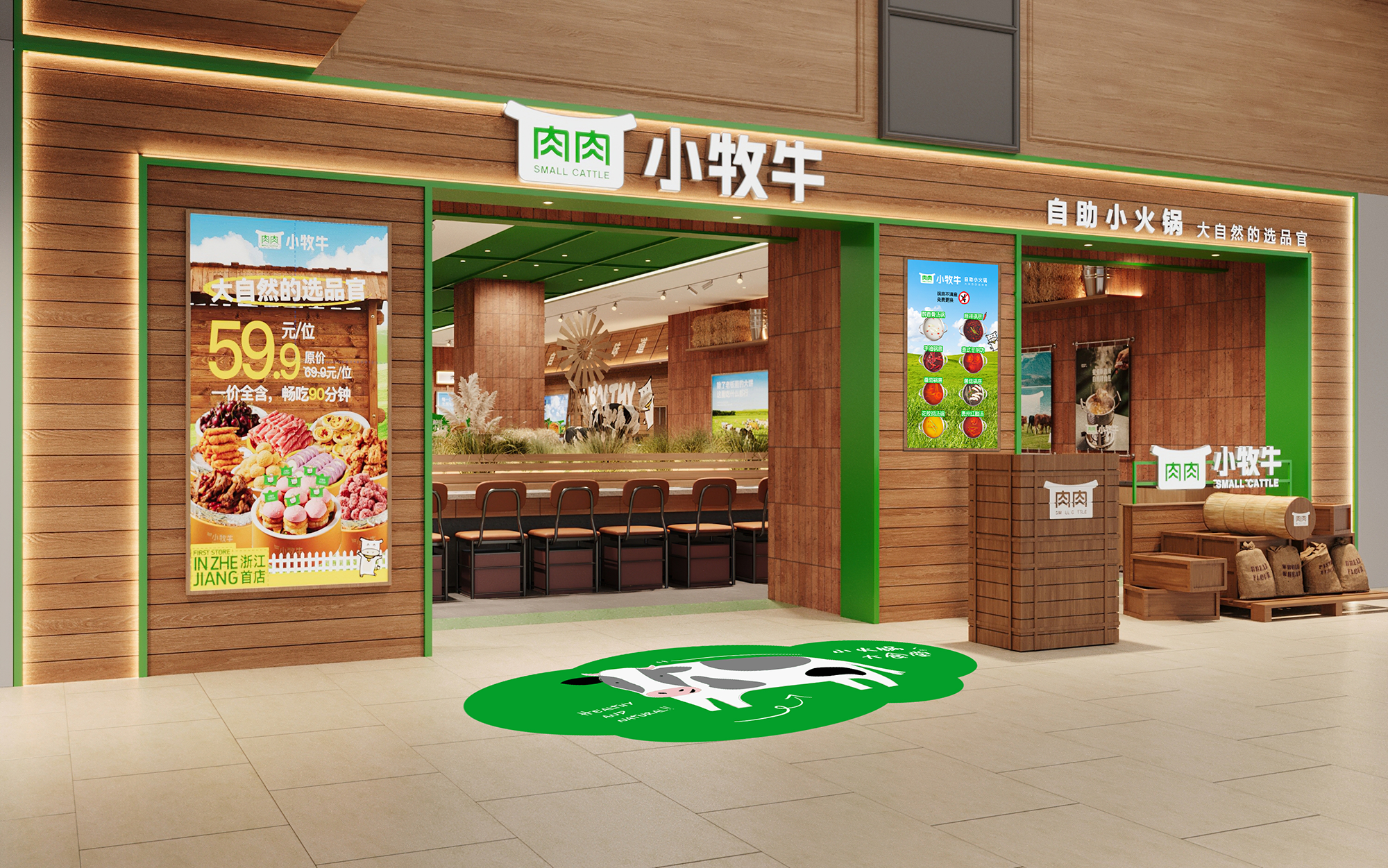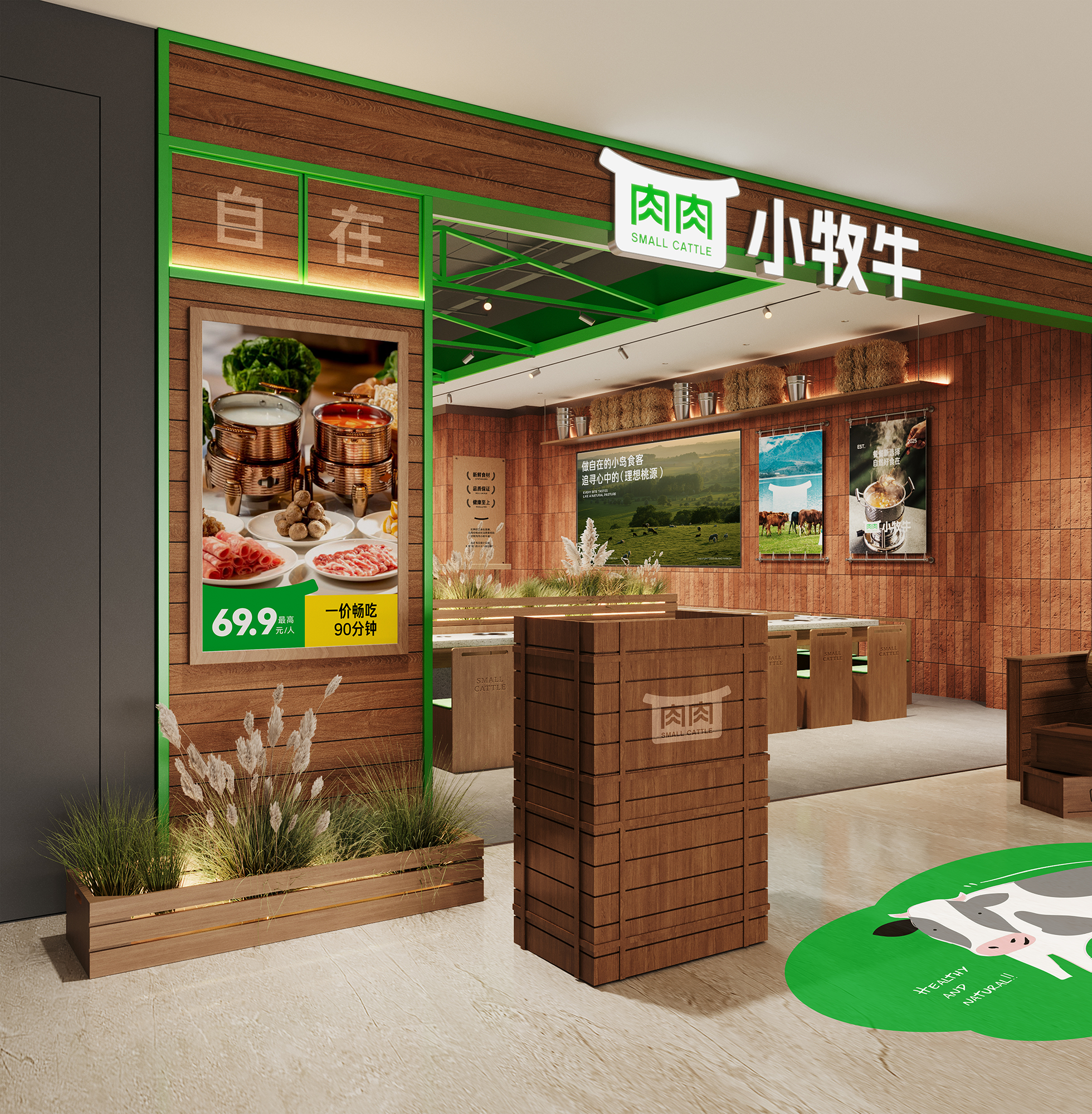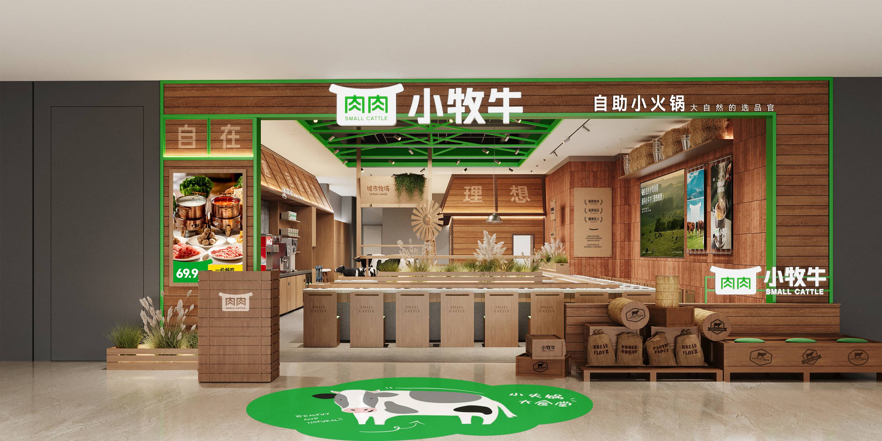 顶部以绿色金属框架勾勒出简洁的空间轮廓,其线条轻盈而富有结构感,为空间增添了几分现代笔触。视线下落,巧妙布置的绿植、缓缓转动的风车、蓬松的干草堆与奶牛模型,共同构筑出一处处微型牧场景致,注入恰到好处的生机与野趣。当火锅的热气袅袅升起,在木的温润、绿的呼吸与细节的趣味中,寻得一片城市中的自然绿洲——这一刻,喧嚣渐远,唯余惬意与自在缓缓流动。