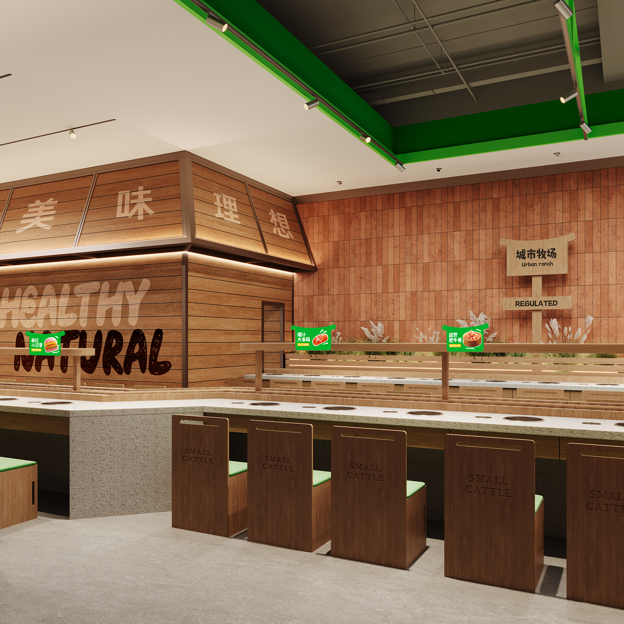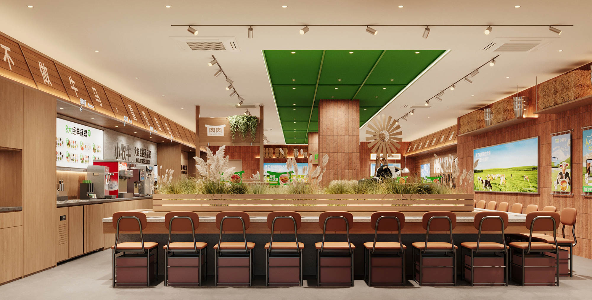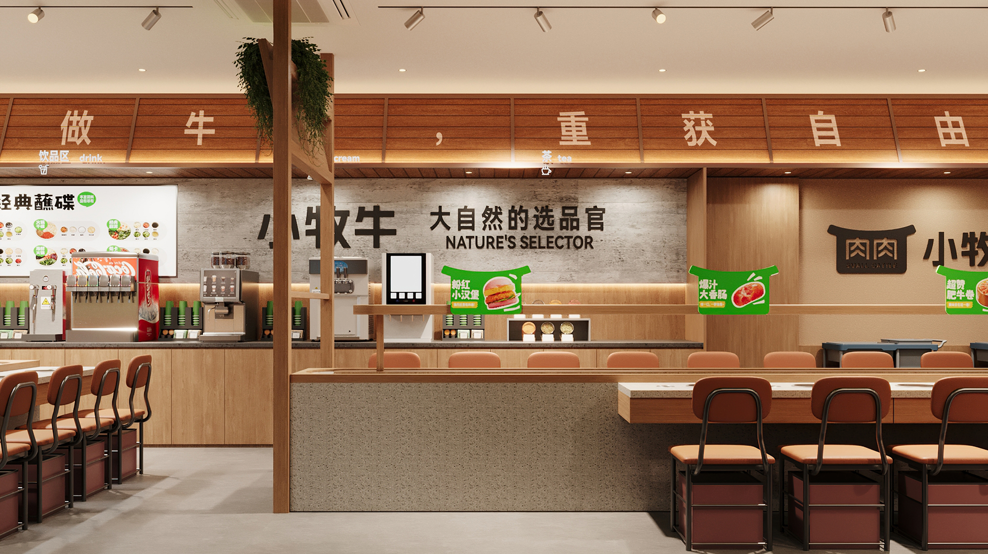 店内区域以"都市牧场"为理念,将牧场的松弛感与现代餐饮功能完美融合。空间整体延续自然质感的表达,原木与绿色调贯穿始终,营造出温暖而生动的氛围。自助取餐与就餐区域无界相连,流畅的动线引导,让取餐如同在牧场中自然漫步,轻松且自在。