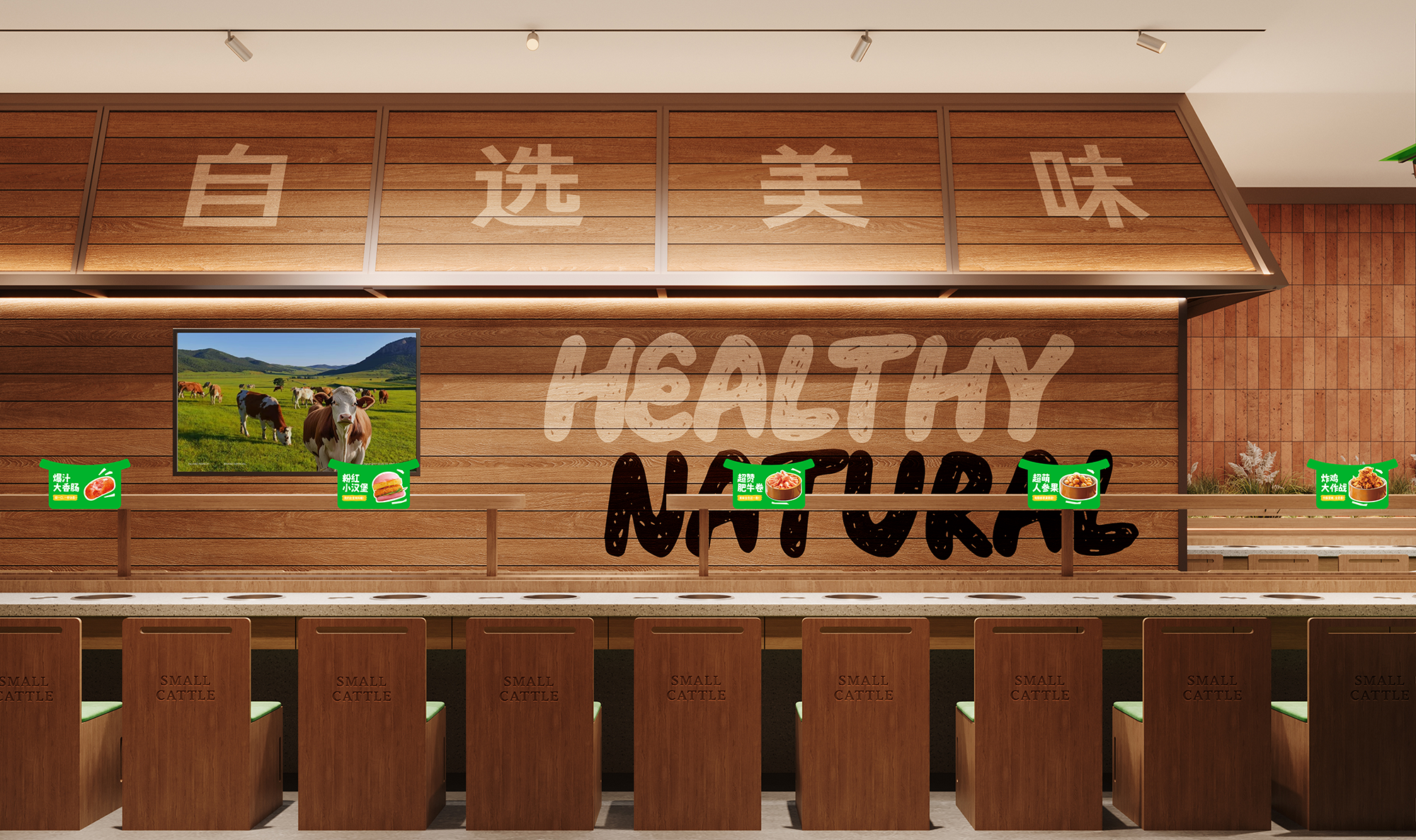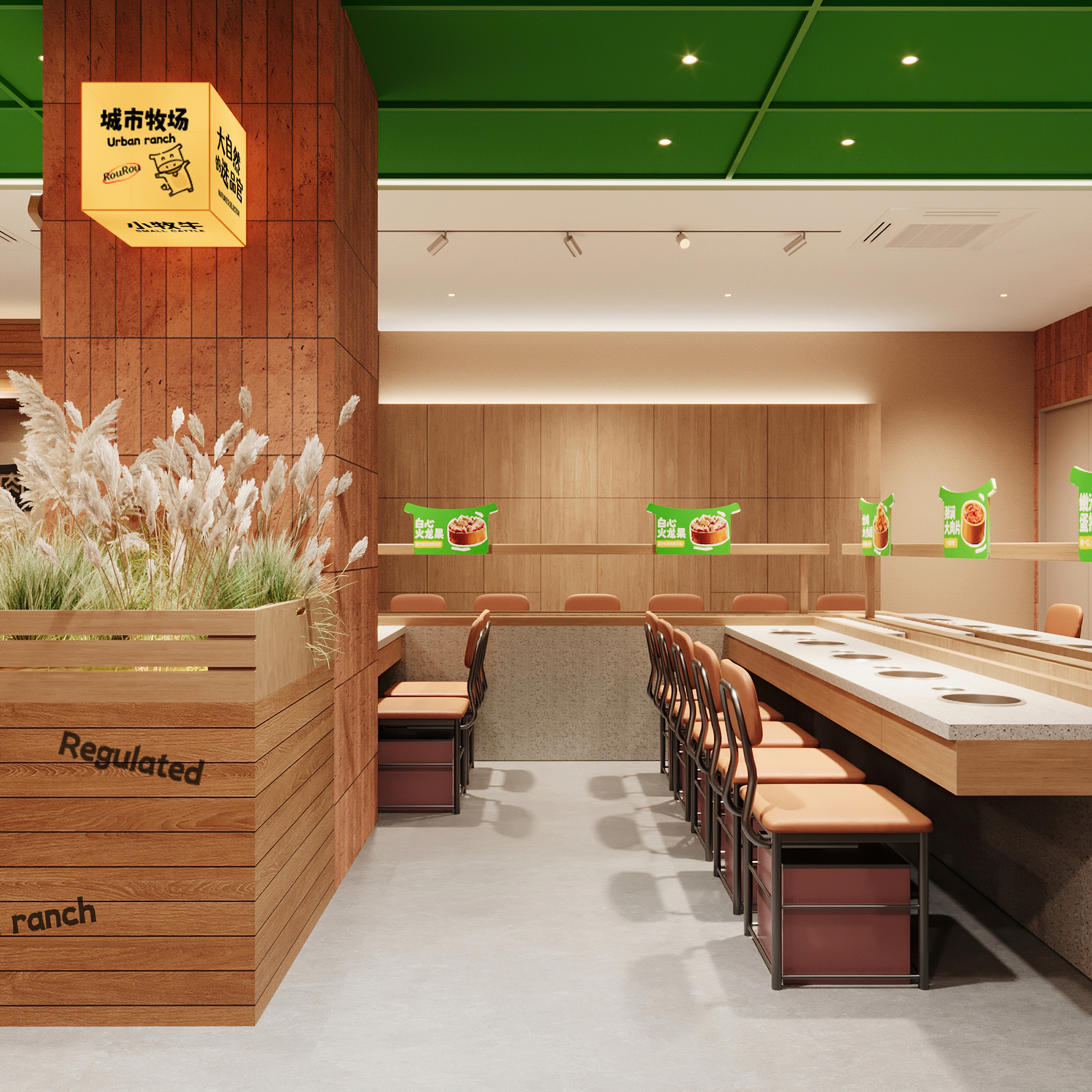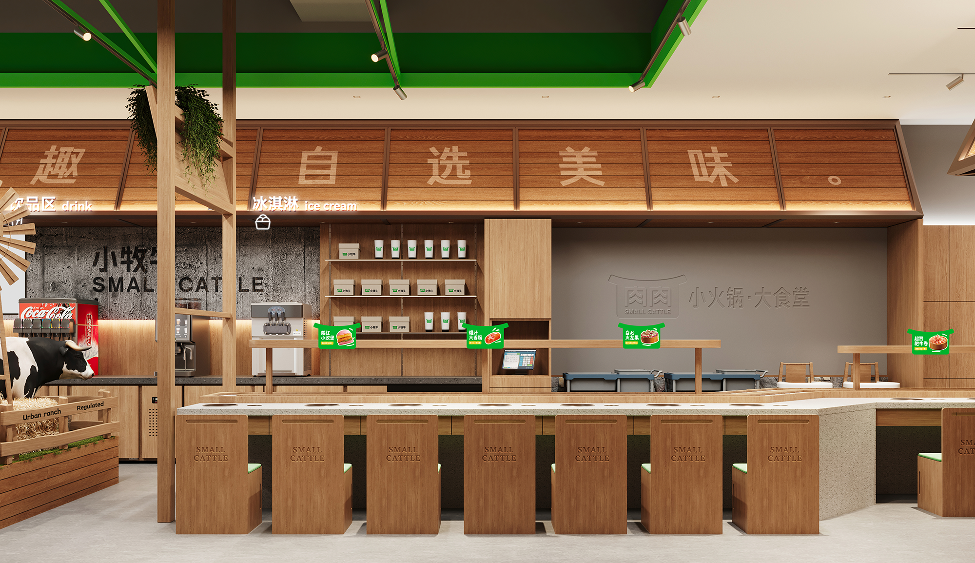 店内区域以"都市牧场"为理念,将牧场的松弛感与现代餐饮功能完美融合。空间整体延续自然质感的表达,原木与绿色调贯穿始终,营造出温暖而生动的氛围。自助取餐与就餐区域无界相连,流畅的动线引导,让取餐如同在牧场中自然漫步,轻松且自在。