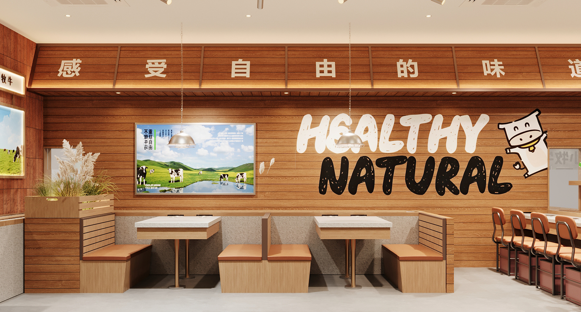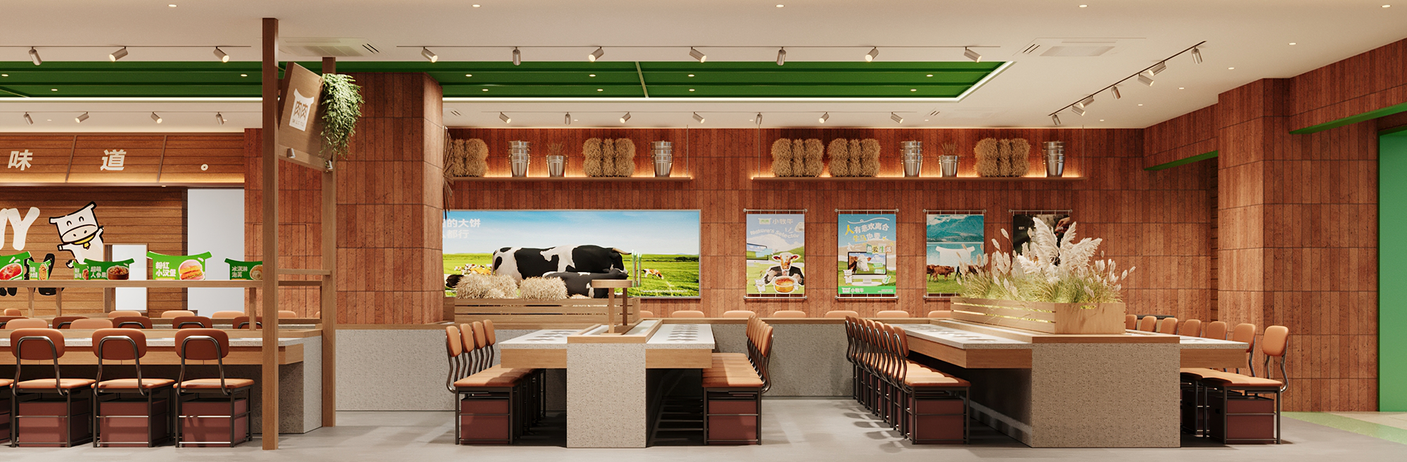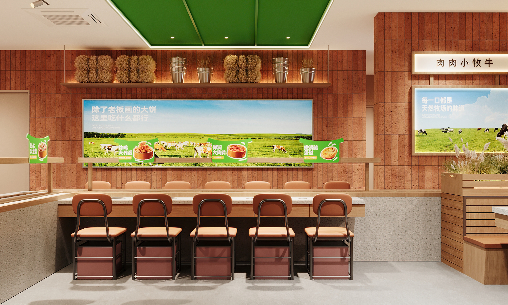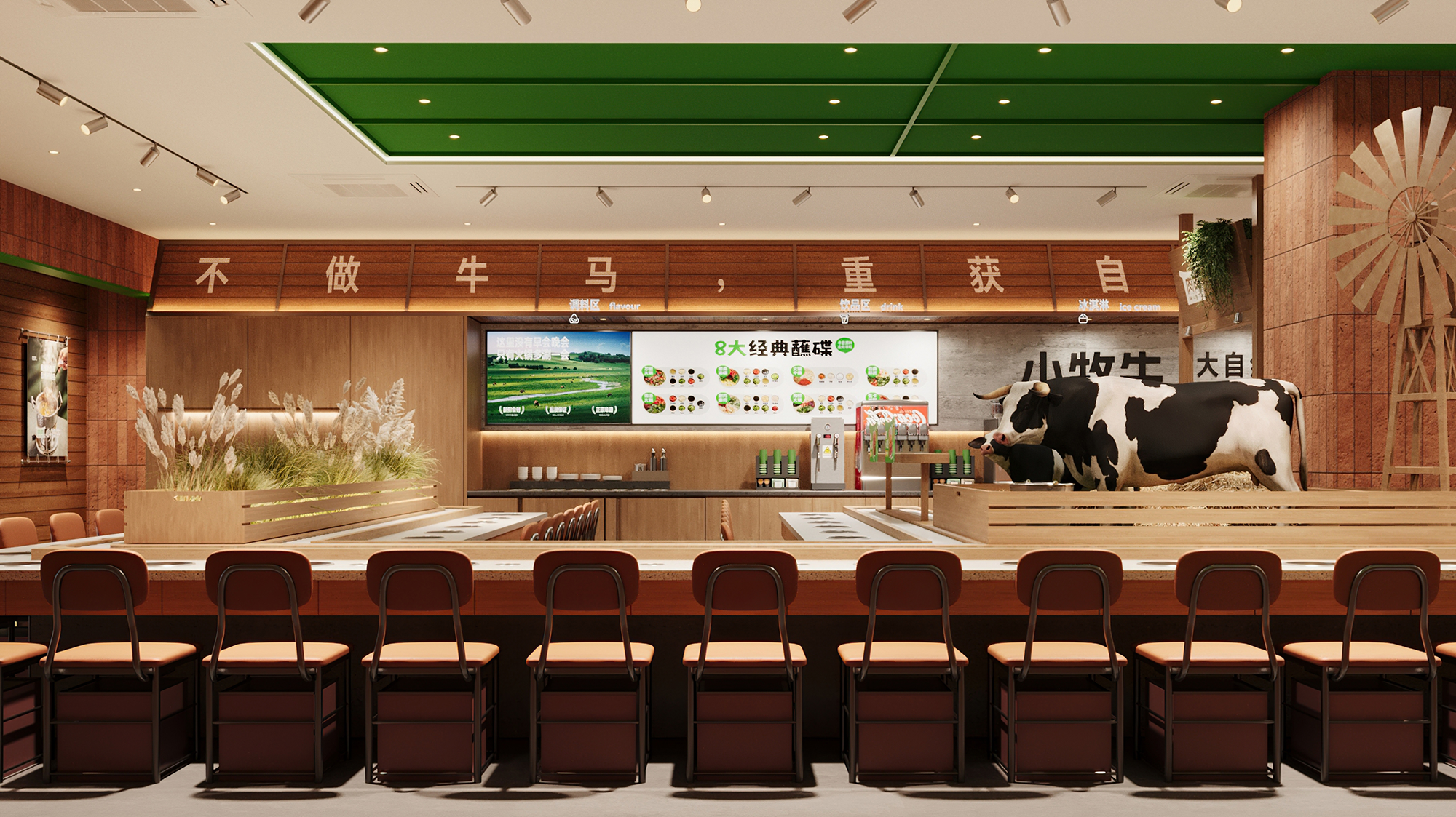 店内整体设计回归自然质朴,摒弃繁杂装饰,营造轻松治愈的用餐体验。红砖、原木材质与浅绿色调贯穿始终,搭配点缀的绿植、风车与奶牛元素,在不经意间唤醒牧场的松弛趣味。