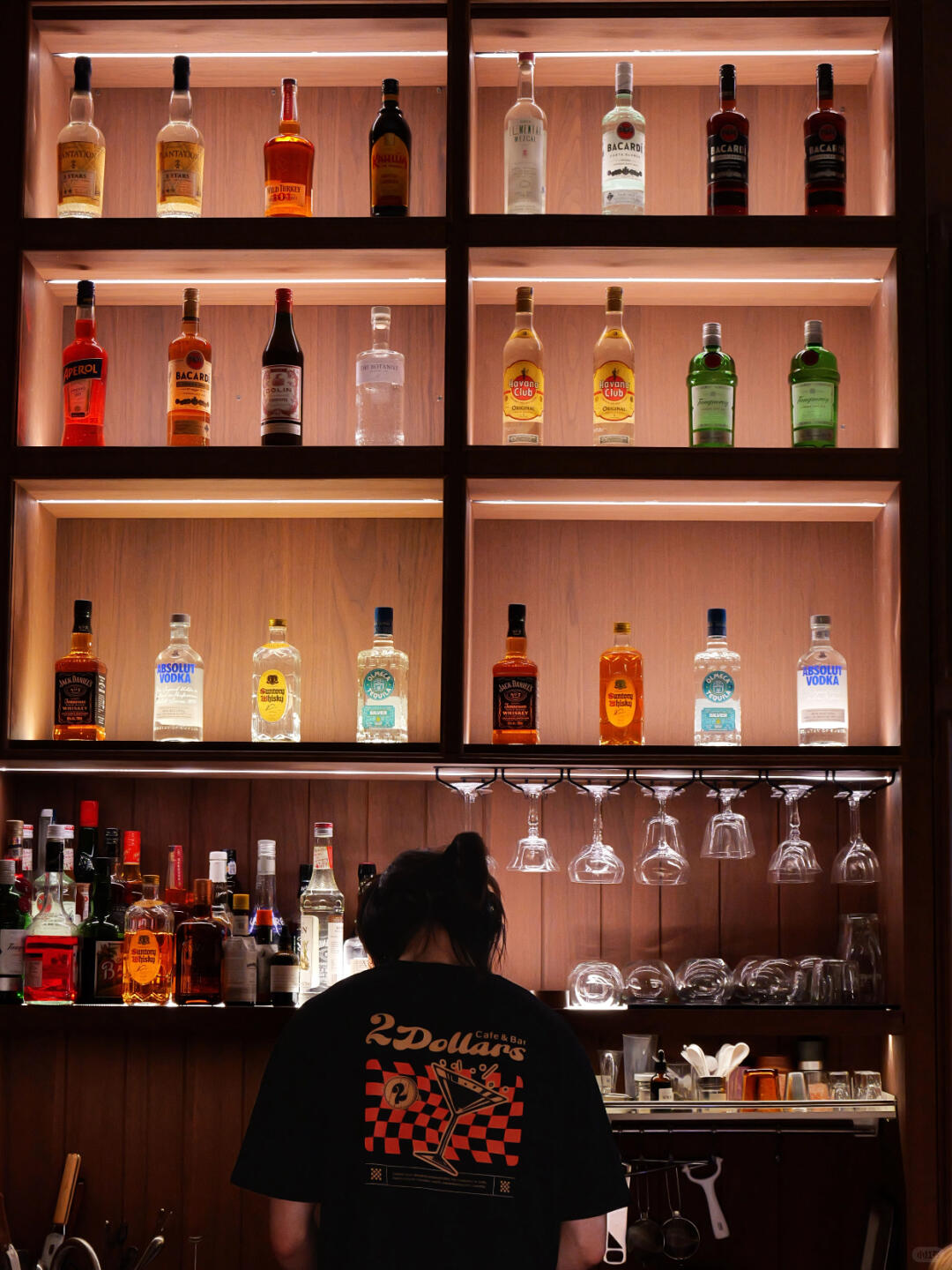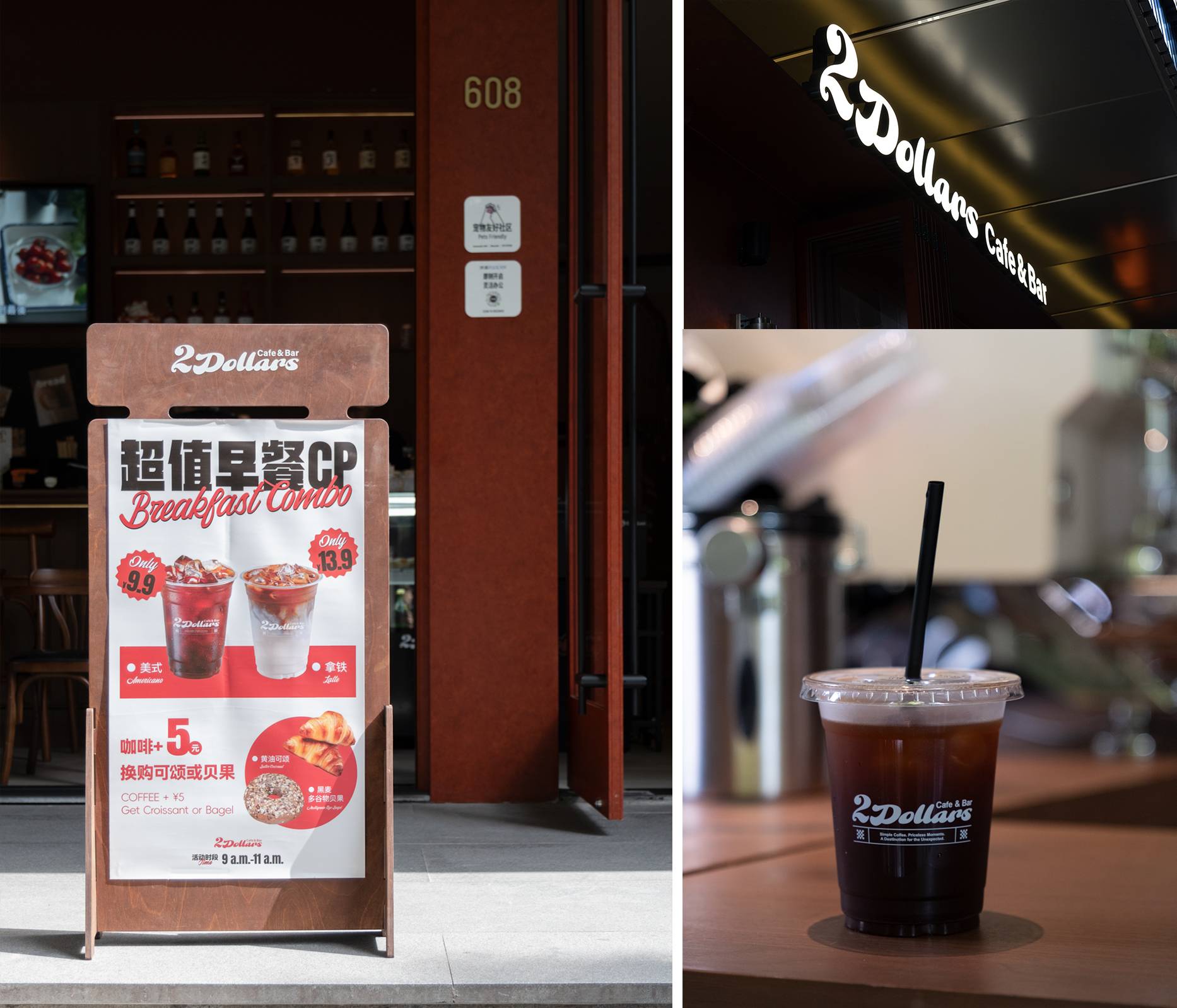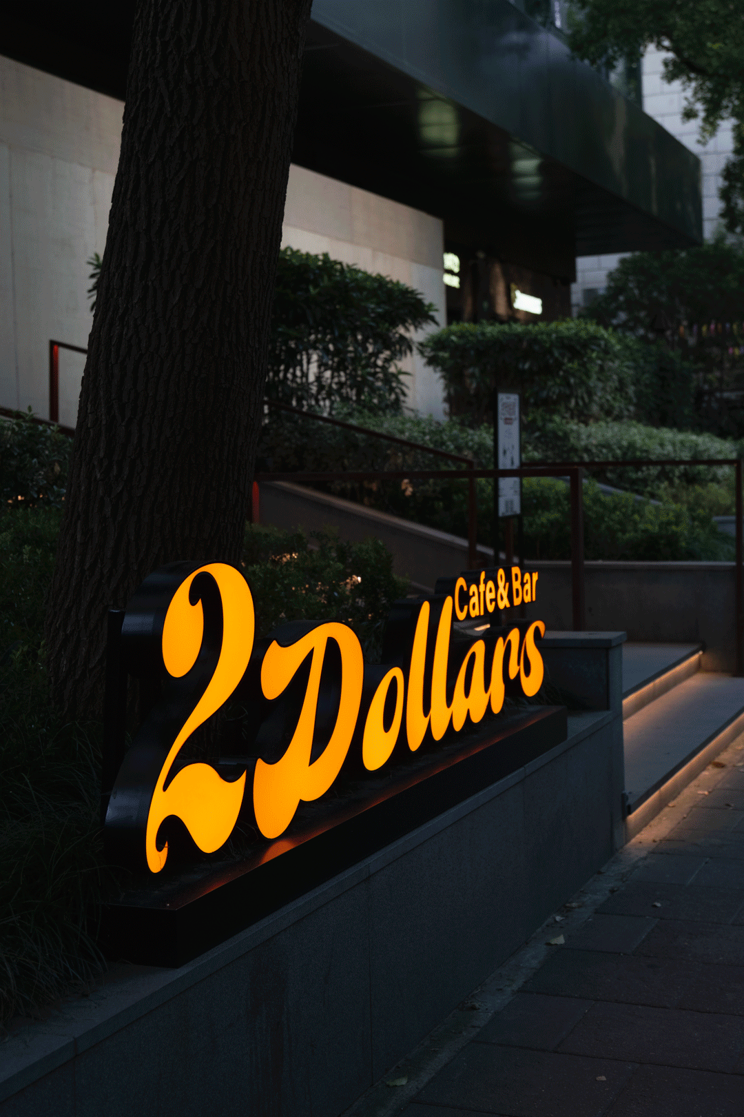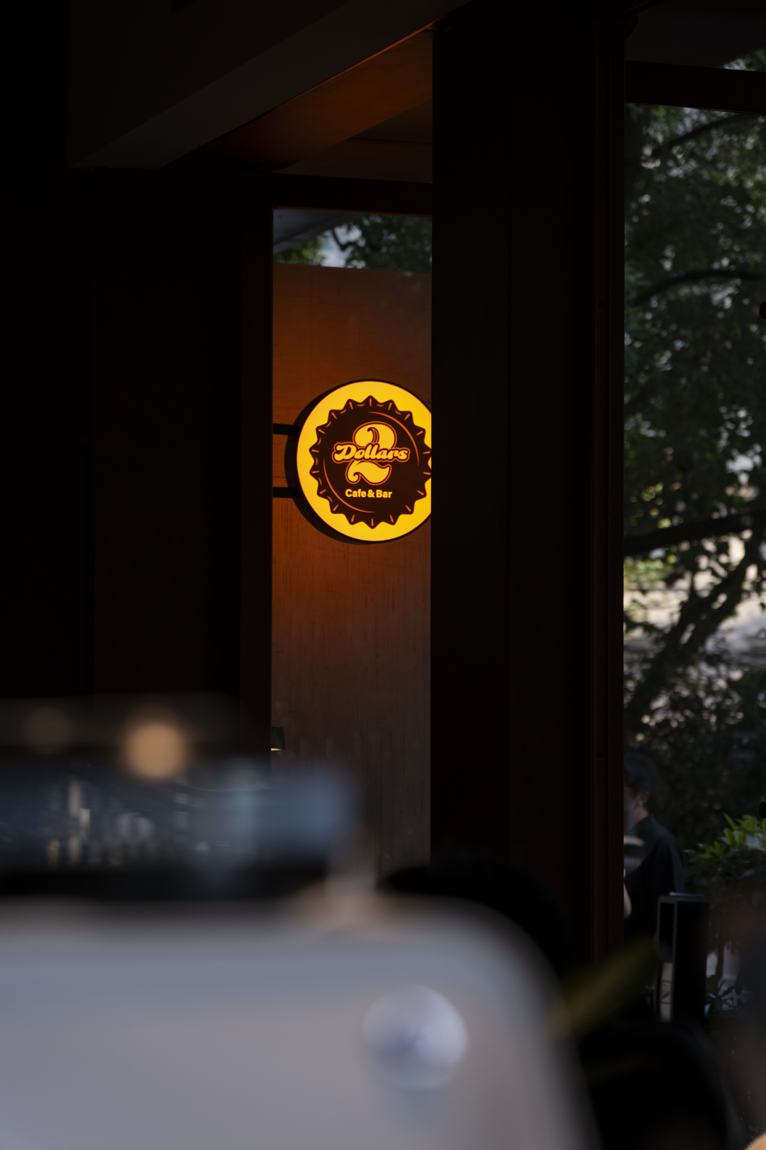 2Dollars —— 一枚流通于日与夜、咖啡因与酒精之间的超值社交货币。入夜后,灯箱标识透出暖黄色灯光,像一枚被点亮的金色硬币,在冷峻的工业基调中散发出温暖诱惑