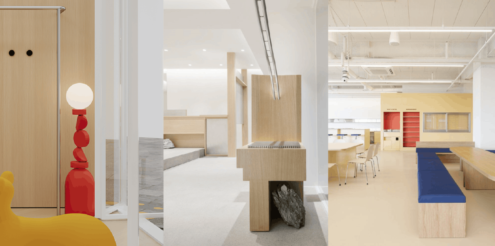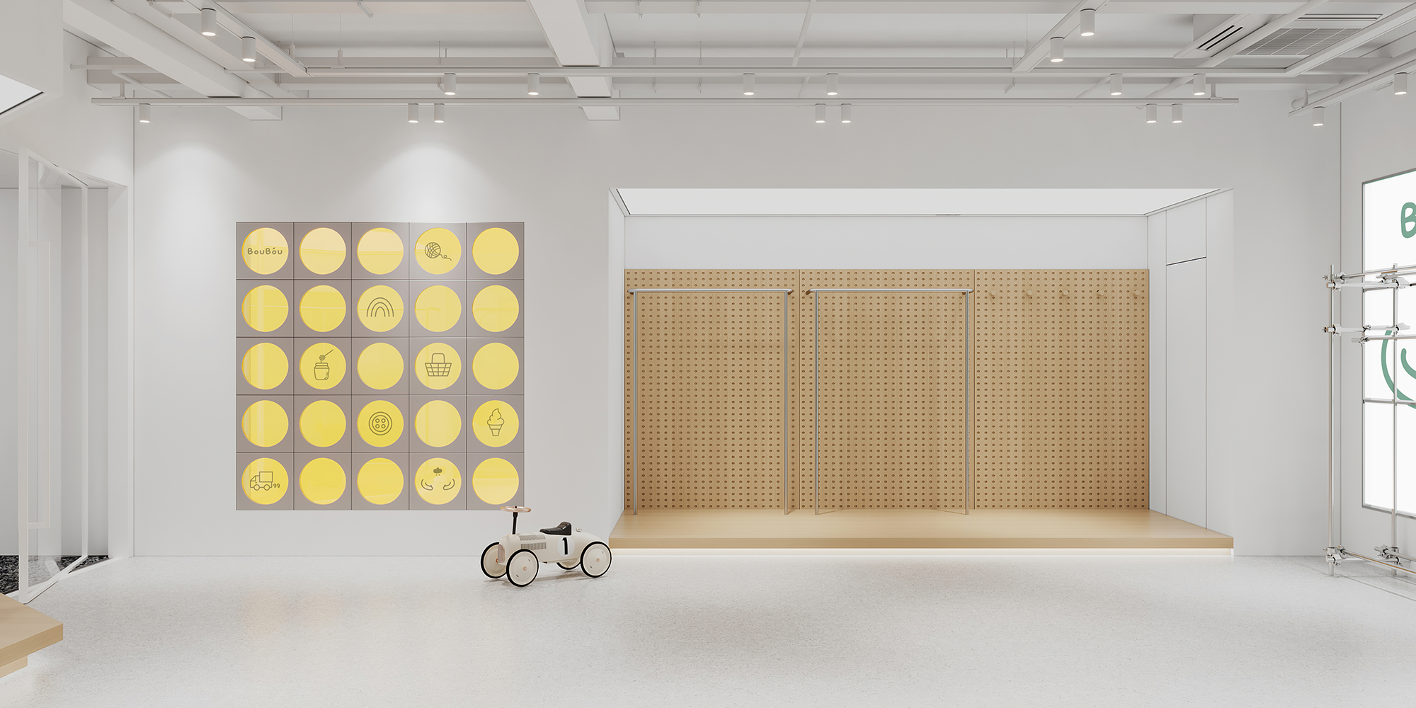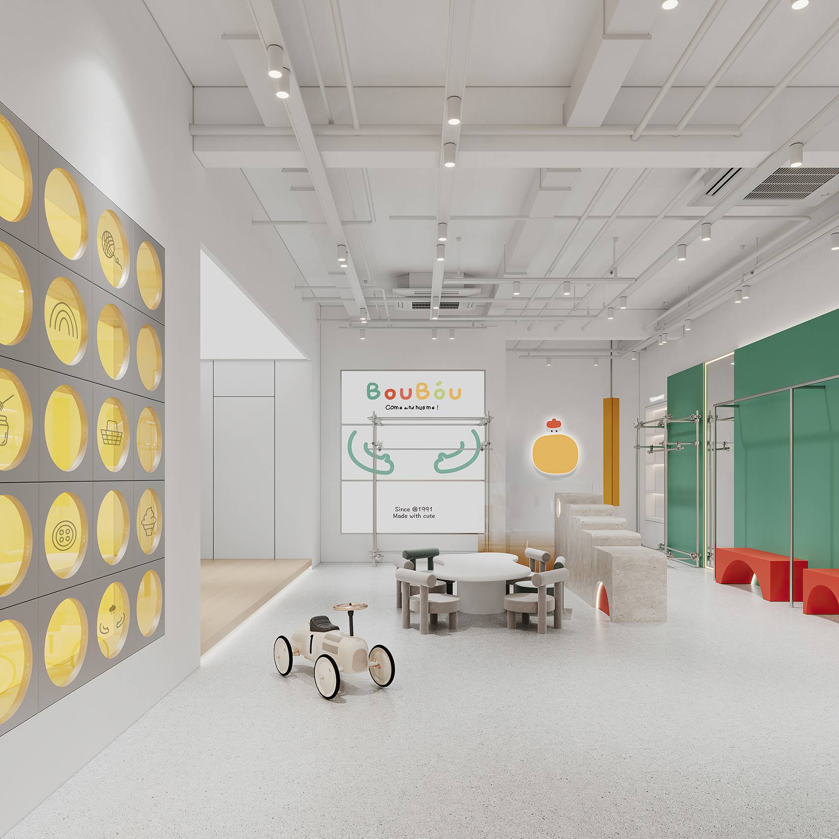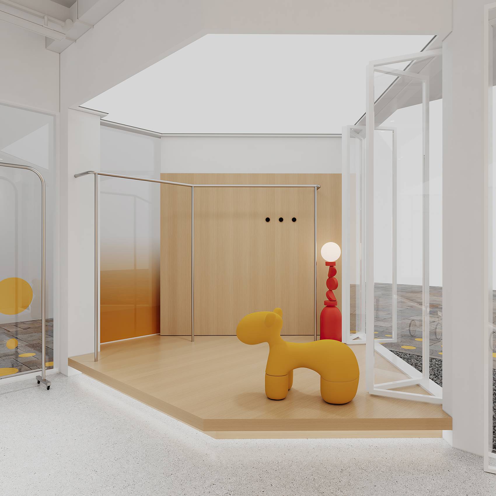 店内是一个有着丰富质感的空间。整体氛围轻松愉悦,通过材质与色彩划分区域,有着变化且清晰的层次感。简约的设计风格融合跳动的色彩,产生了有趣的空间体验,仿佛讲述着孩童时光的美好,尽显活力而纯真。同时置入艺术陈列台、创意摆件、趣味挂饰,借由它们,提升空间的趣味性与品质感,彰显灵动且高级的买手店环境。