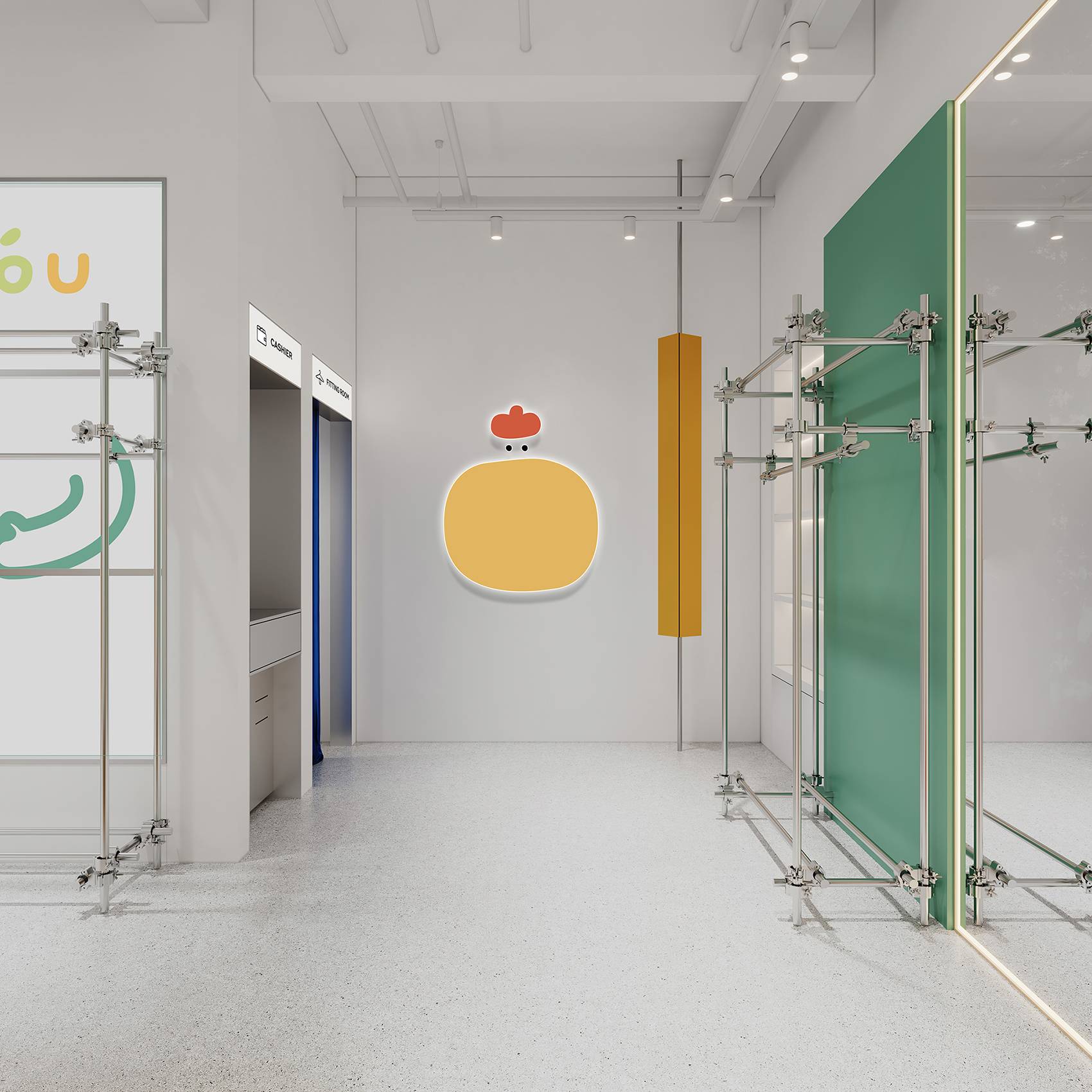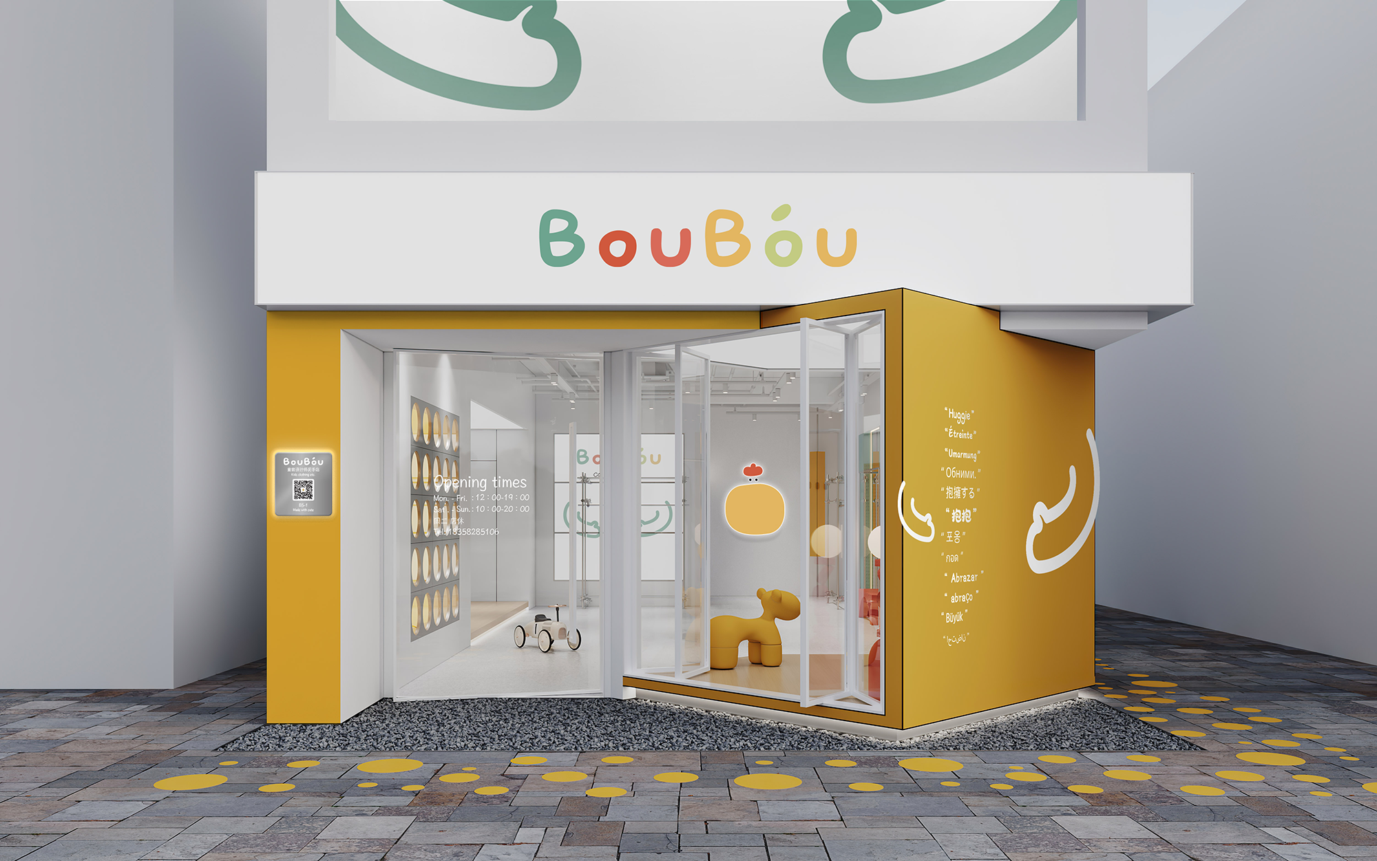 BouBóu位于一个创意园内,对比成熟高级的周遭店招,我们希望能够更活力、更趣味一些。我们试着改变方正的规则空间,采用独特的入口设计,向左展示店内的一角,向右是写有12国语言的“抱抱墙”,沿街进入还有一段治愈的抱抱故事。我们用这种有情感互动的方式,建立人与品牌之间的对话,探索治愈、温暖、有趣的社交体验。