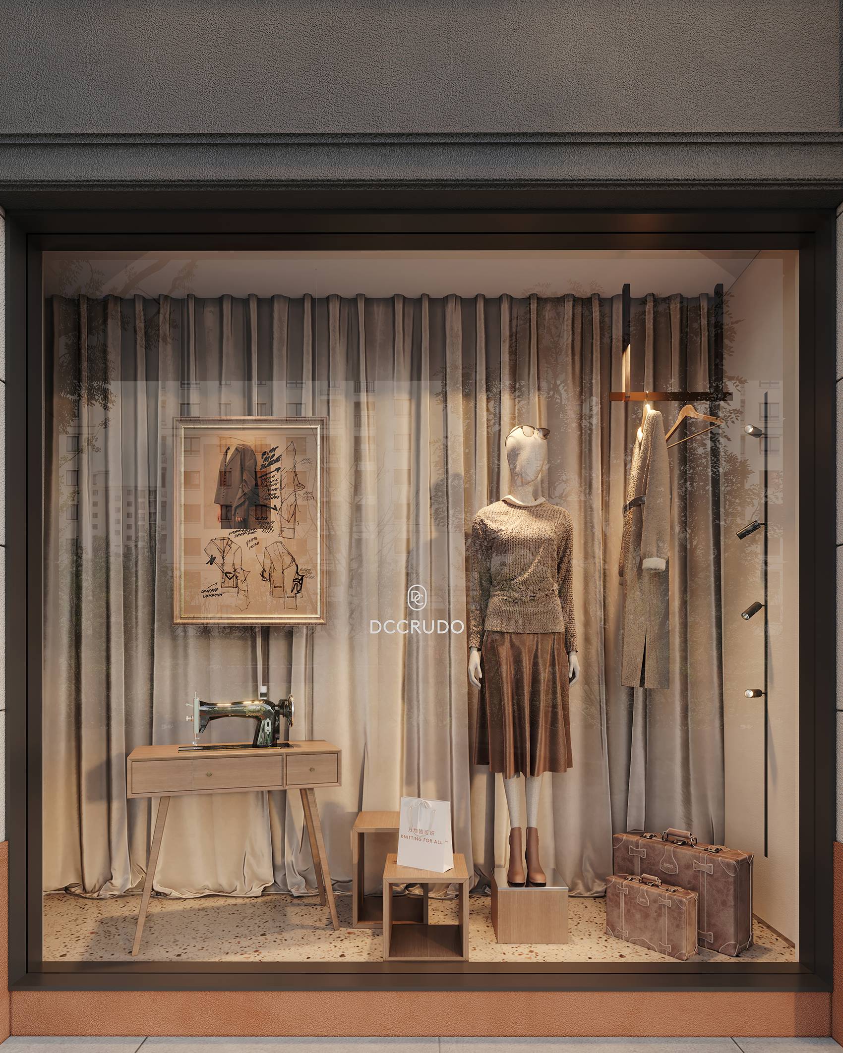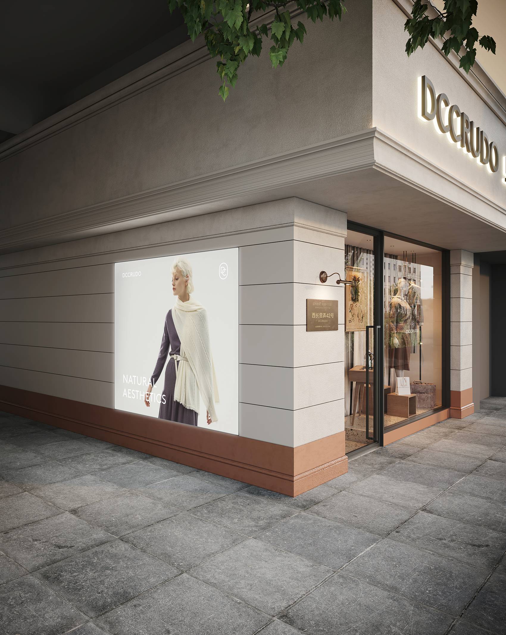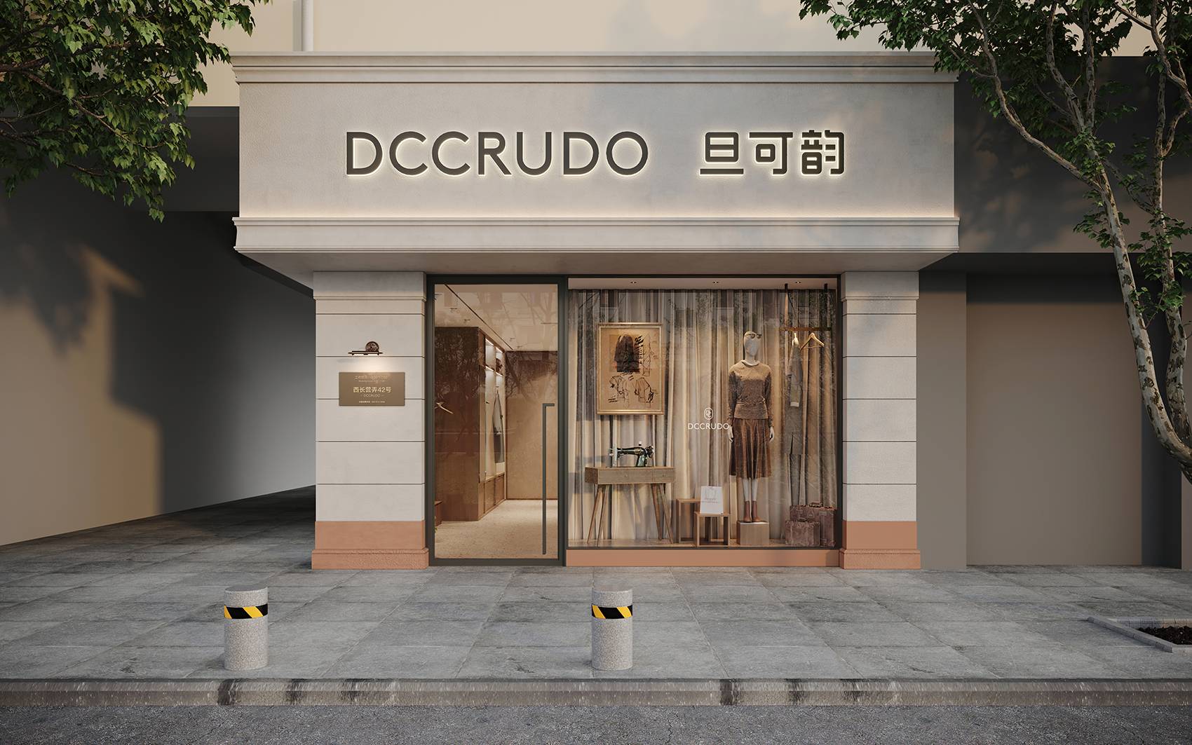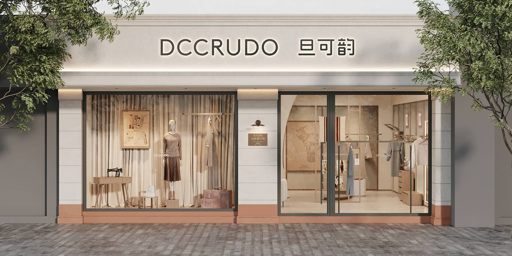 门头区域的设计保持着与品牌一致的格调感,采用大面积玻璃打通室内外空间壁垒,让来往的路人更直观地感受店内的服饰以及布置,吸引入店。同时,利用橱窗营造时尚大片氛围感,给予顾客场景化联想,感受旦可韵的服饰魅力。
