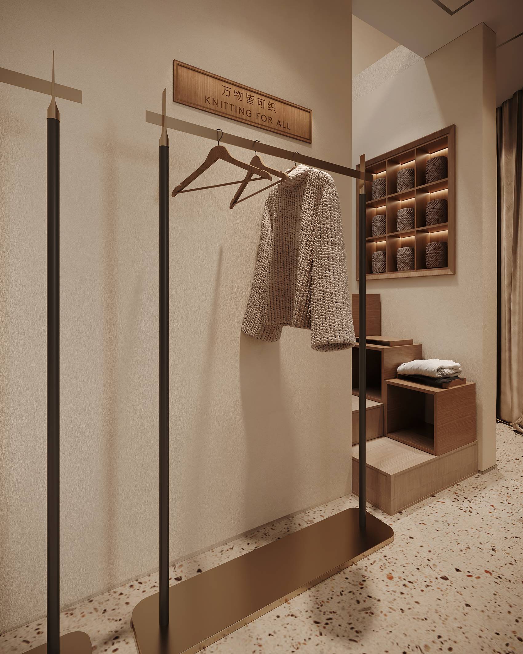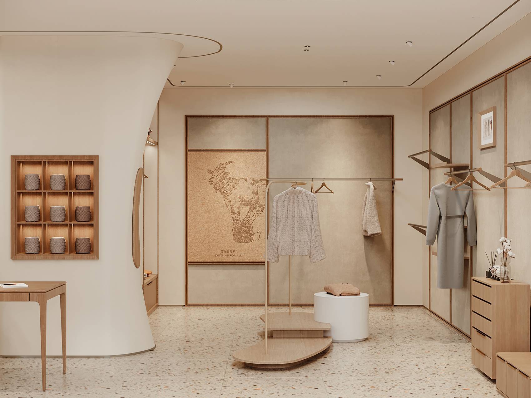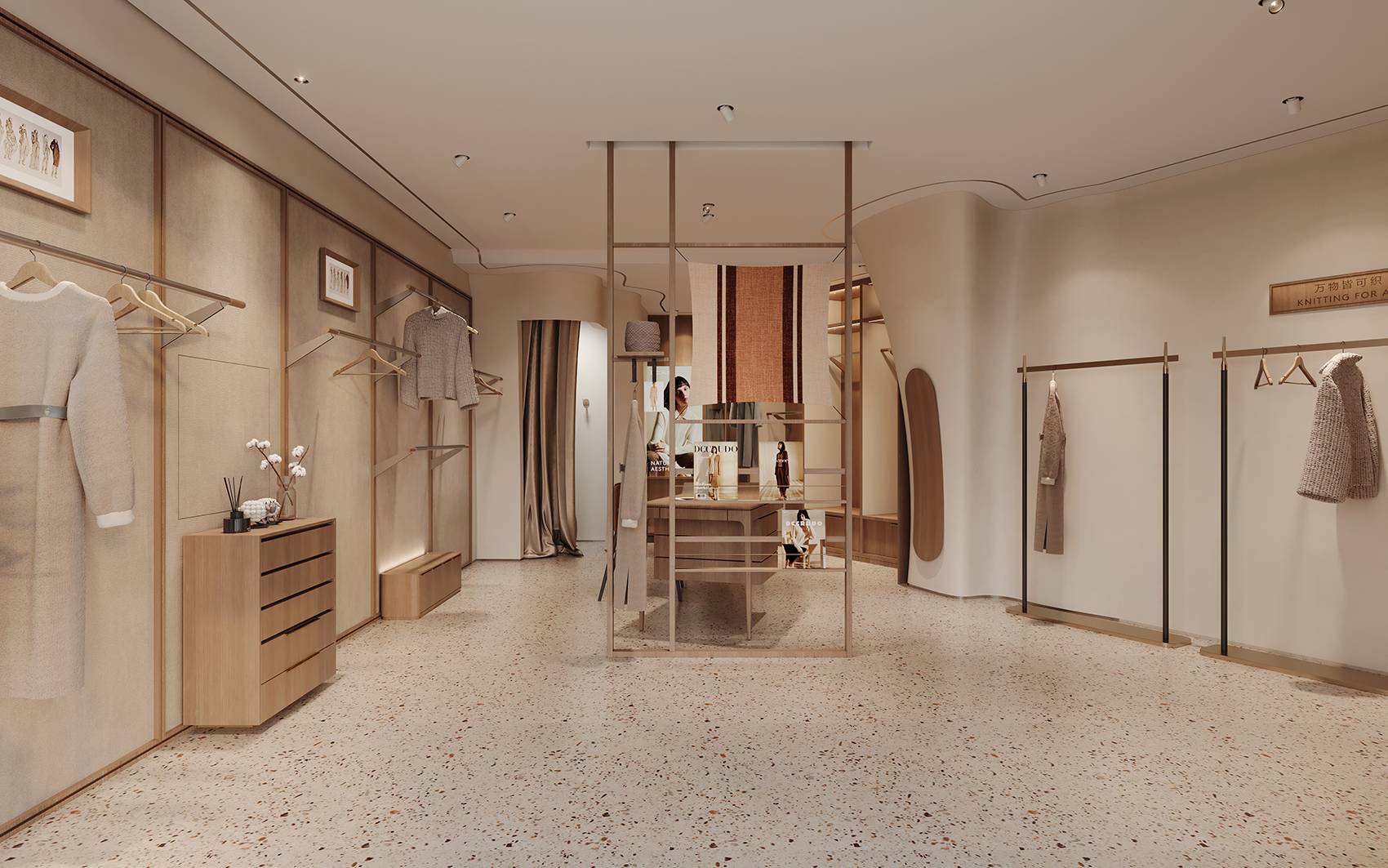 店内区域的设计没有强烈的视觉冲击力,拥有优雅的气质,以平缓温暖的氛围静静萦绕在空间内。木材以不同的形式链接着每一个角落,温润的质感以呼应羊毛织物“柔、软、暖、糯”的特点。同时,尝试通过布、金属与木质的组合来增加变化,从而创造丰富的空间层次,来表达经典与现代特性的时尚。