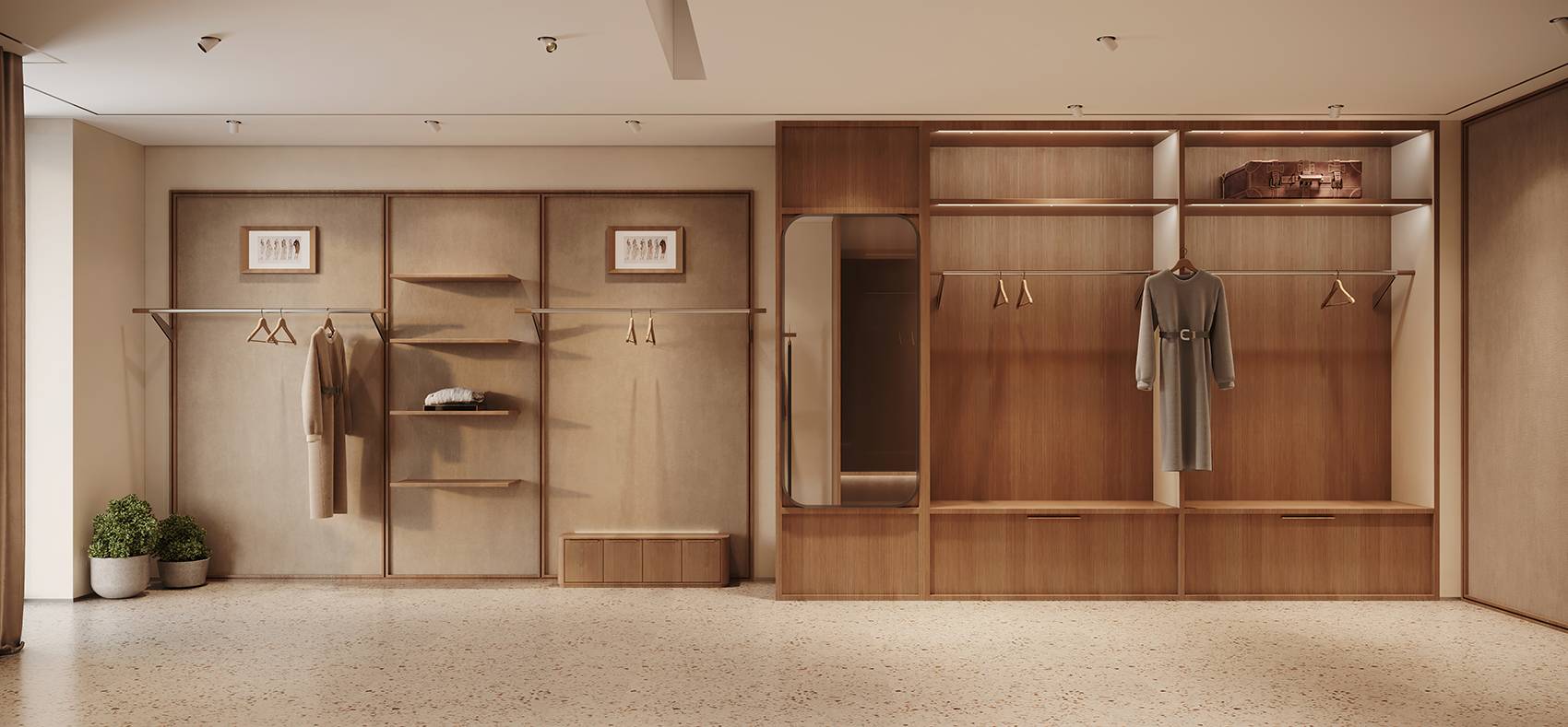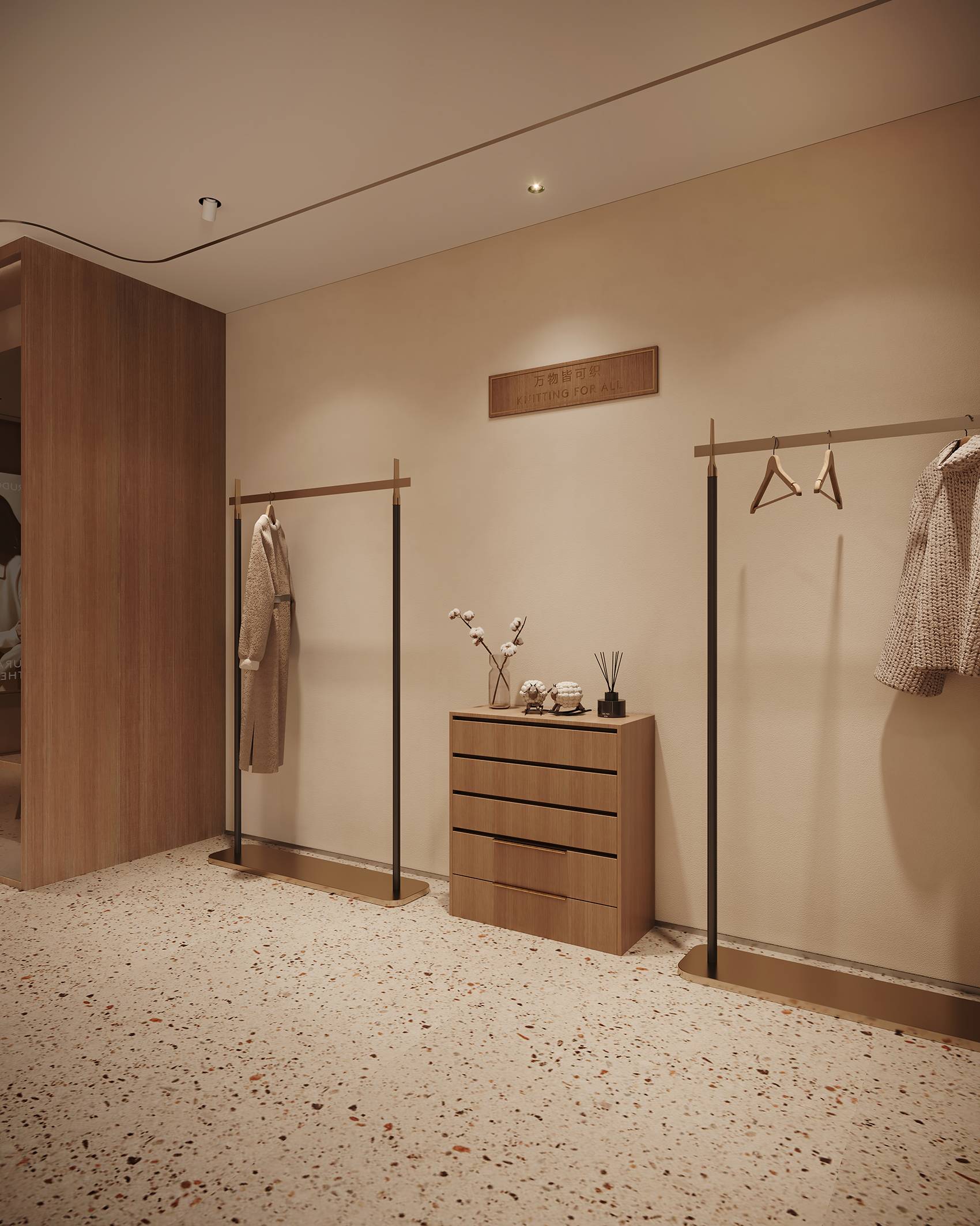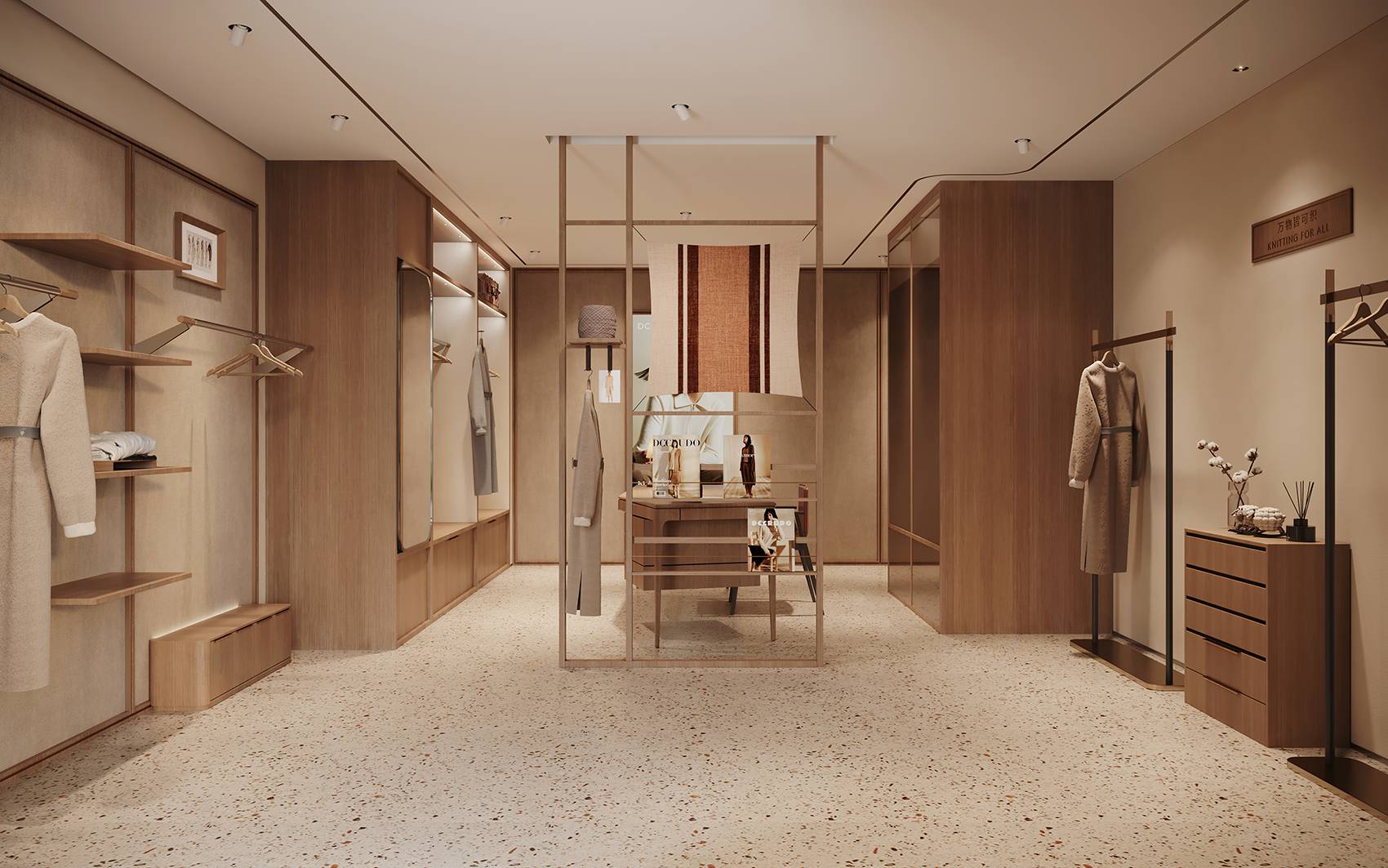 店内区域的设计没有强烈的视觉冲击力,拥有优雅的气质,以平缓温暖的氛围静静萦绕在空间内。木材以不同的形式链接着每一个角落,温润的质感以呼应羊毛织物“柔、软、暖、糯”的特点。同时,尝试通过布、金属与木质的组合来增加变化,从而创造丰富的空间层次,来表达经典与现代特性的时尚。