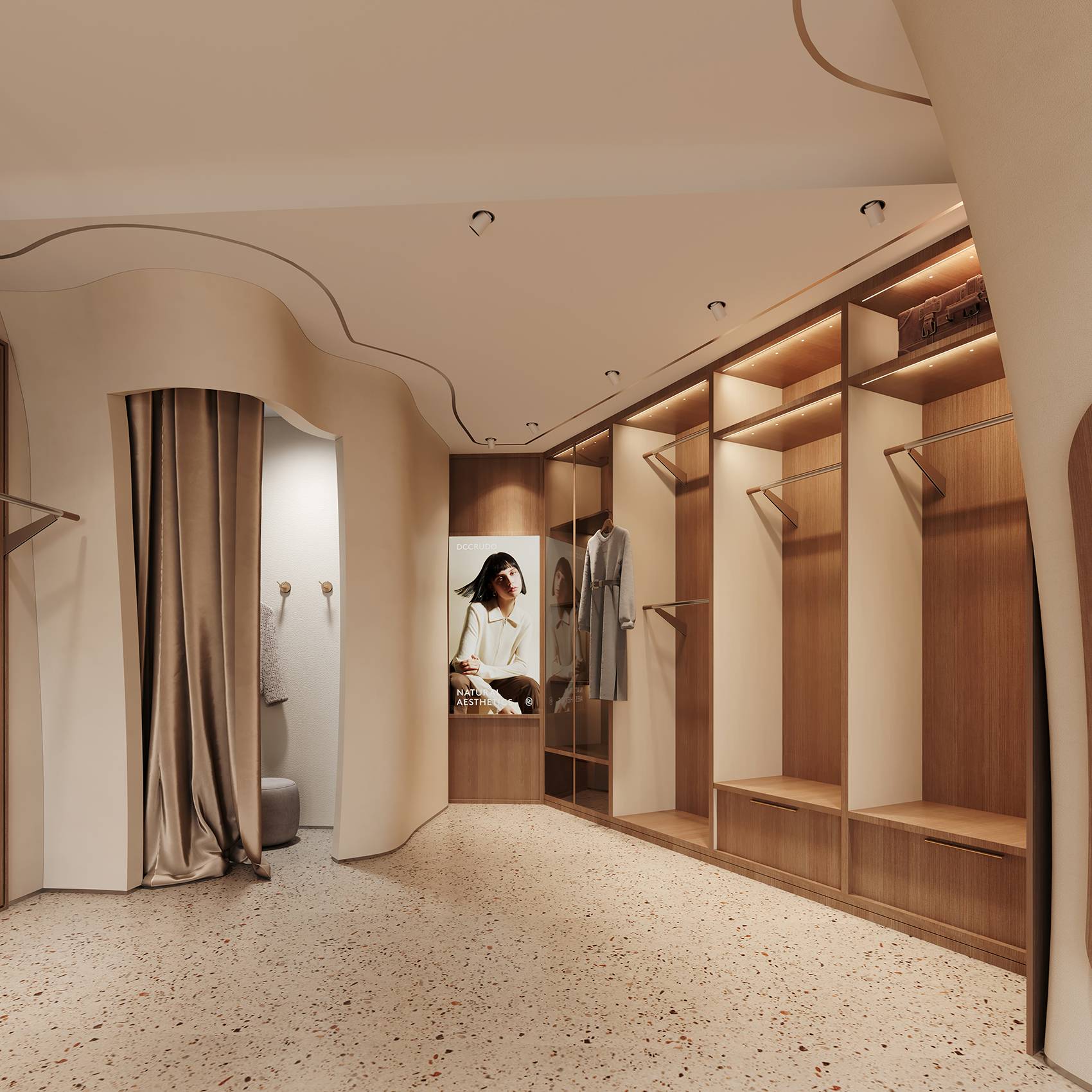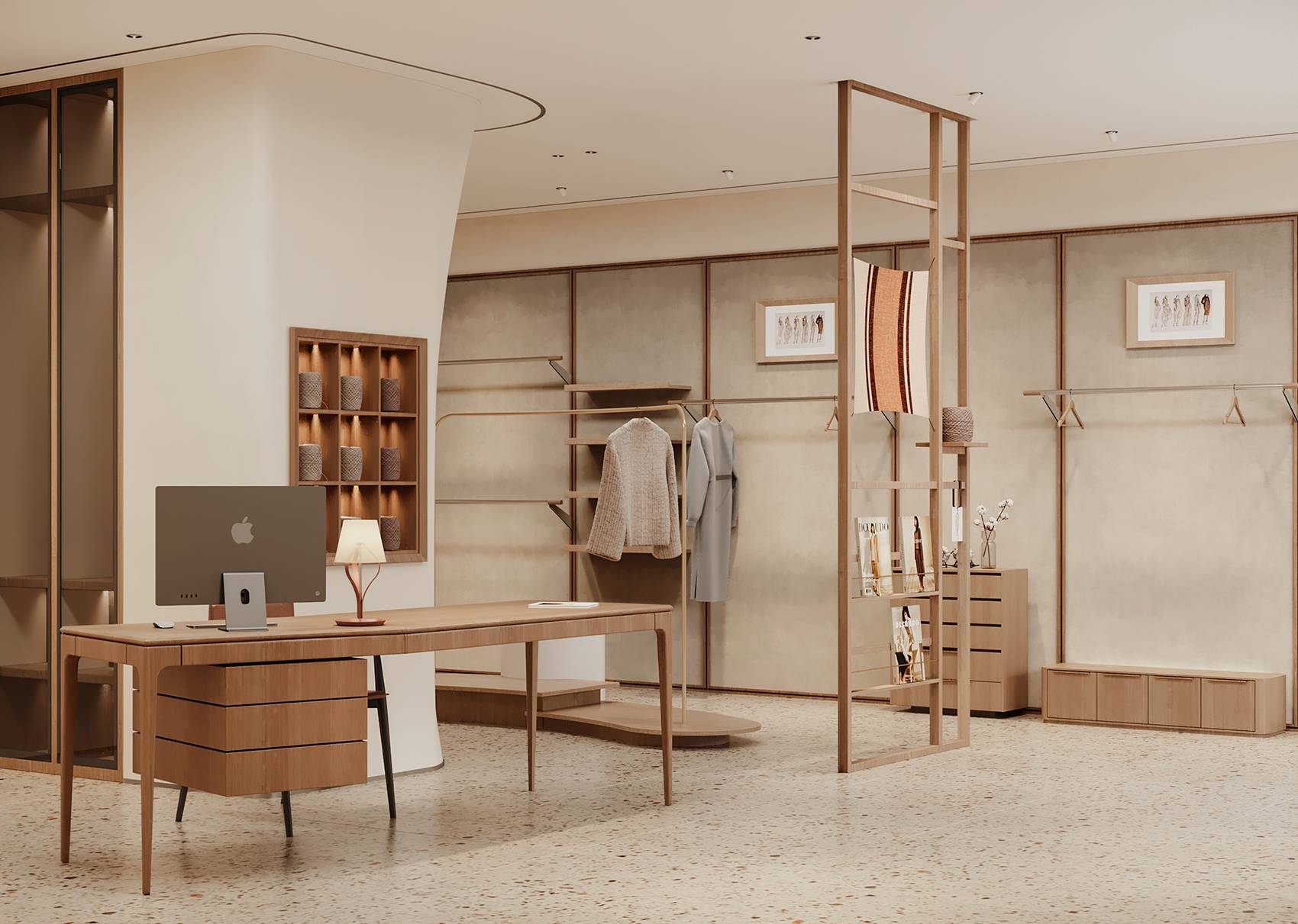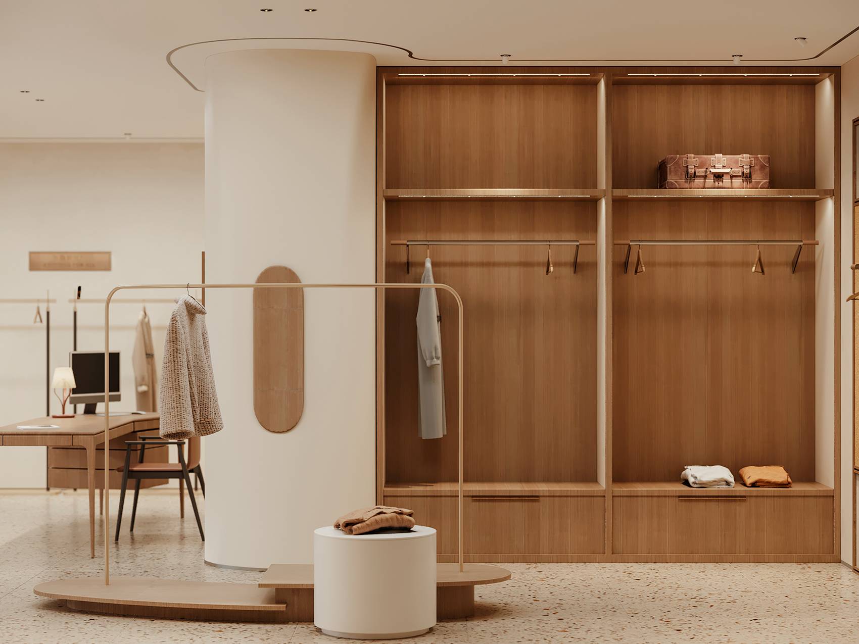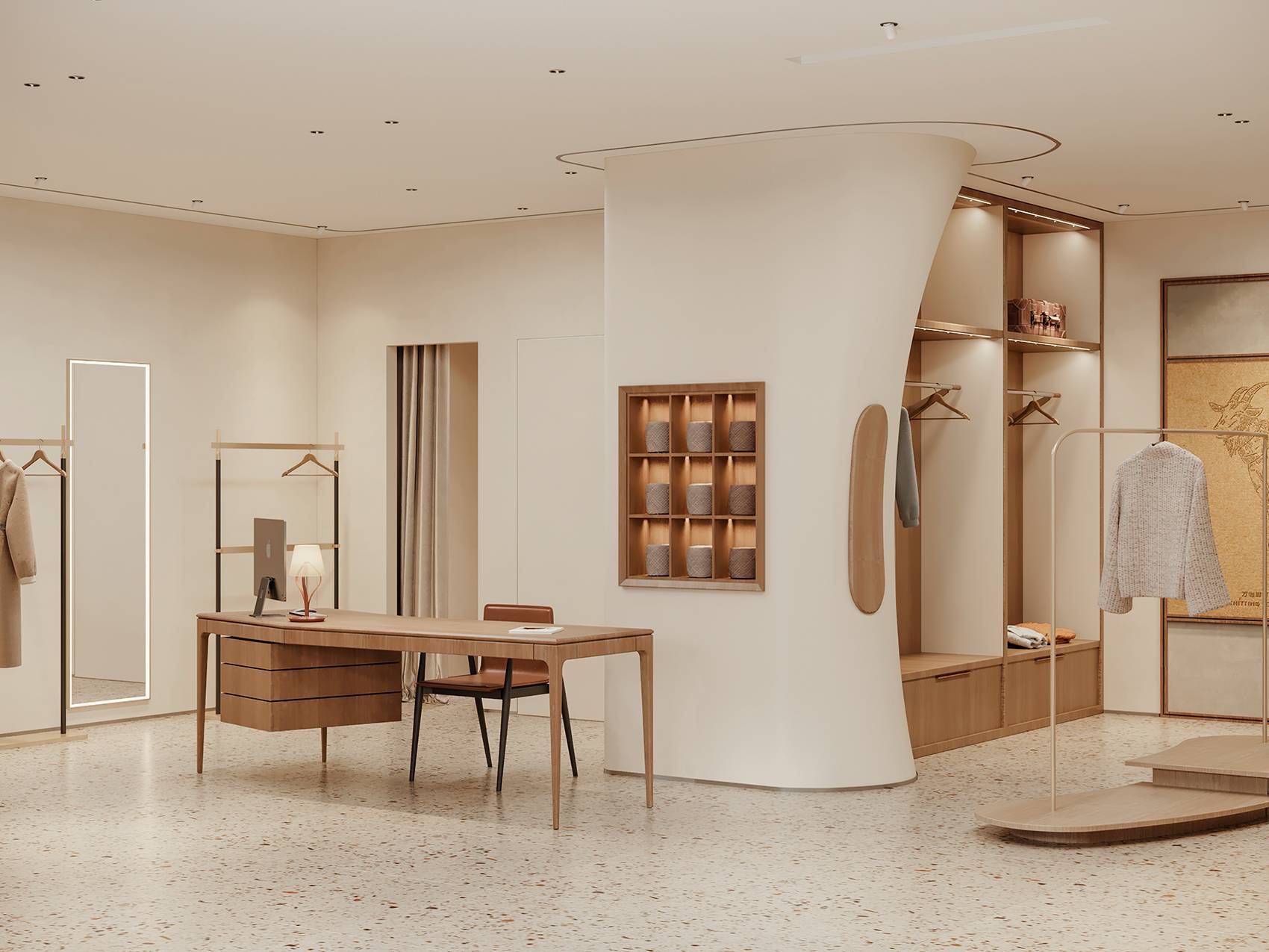 在连续的空间内,我们有意识地利用墙面分隔空间,增加服饰的陈列空间,优雅的弧面,朴素的材质,一切都安排的恰如其分。前台也与整体风格保持一致,温润的木质桌面,低调而稳重。