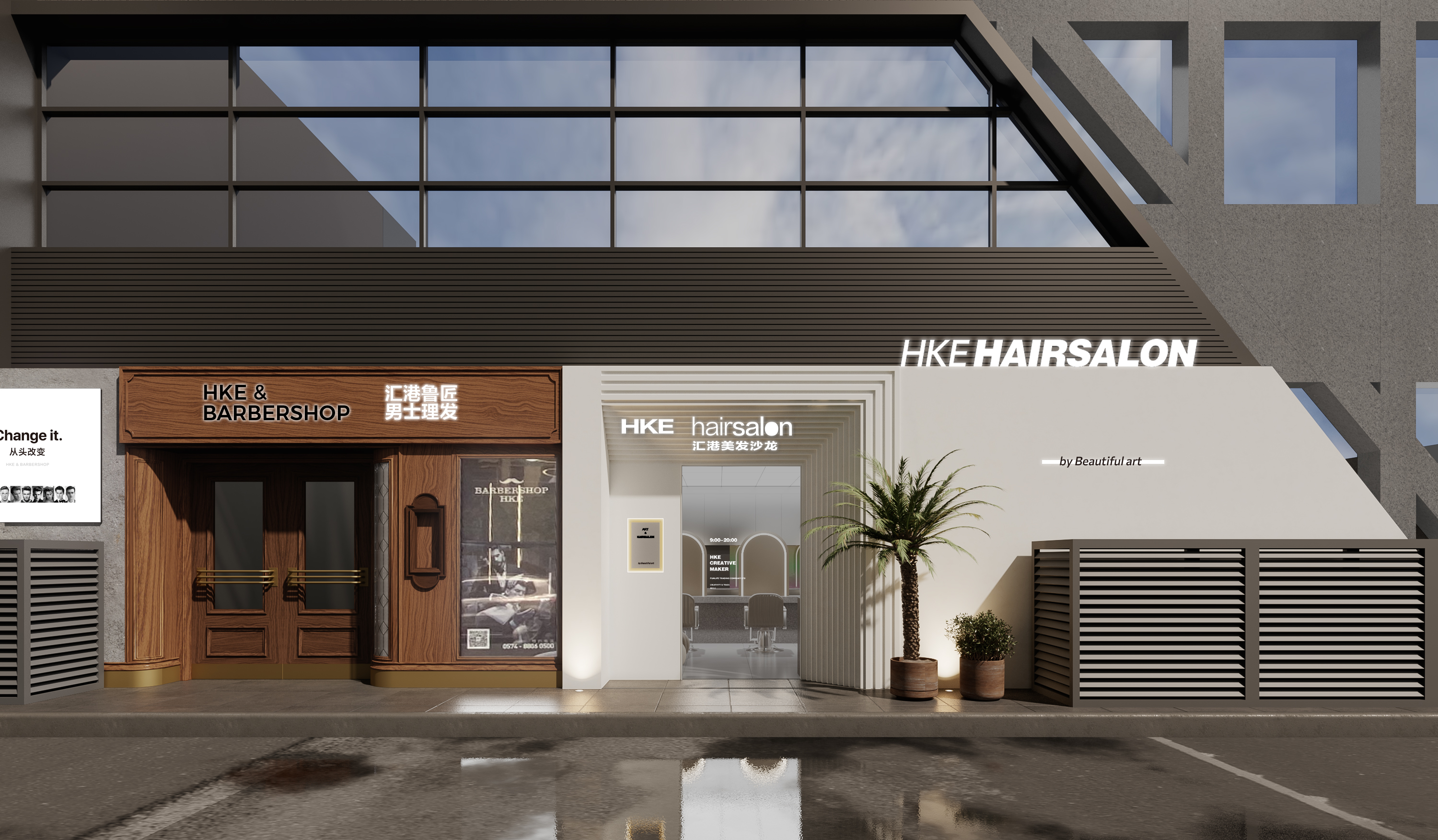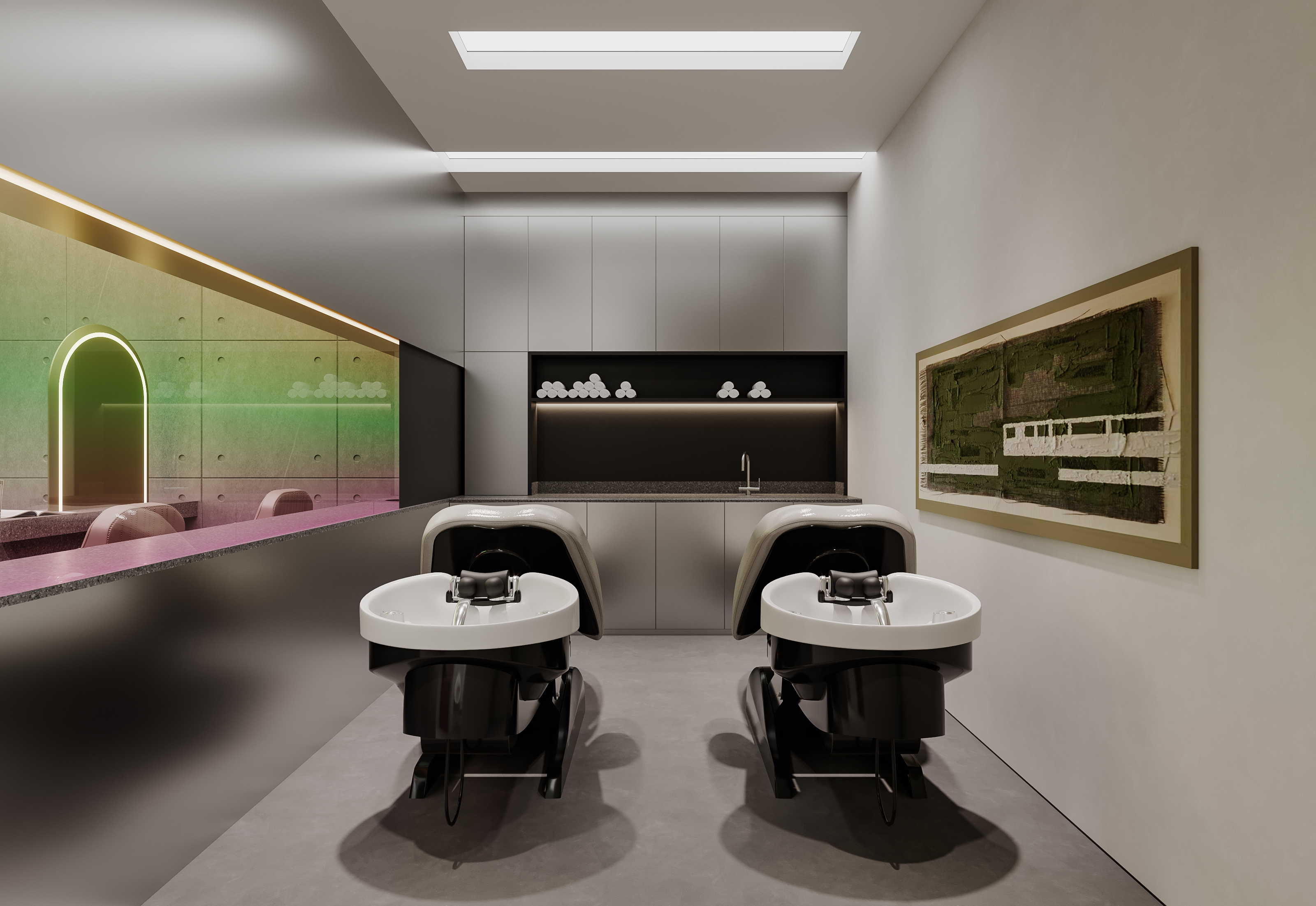 剪发区设有两处,以储藏室作为间隔,一处是半圆弧空间,艺术且现代的设计,让顾客瞬间感到惊艳,同时选用圆镜呼应空间,达成空间的统一性。一处则在入门右侧,以装饰画作为装点,丰富视觉层次,让空间不再单调无趣,反而多了几分观赏性。