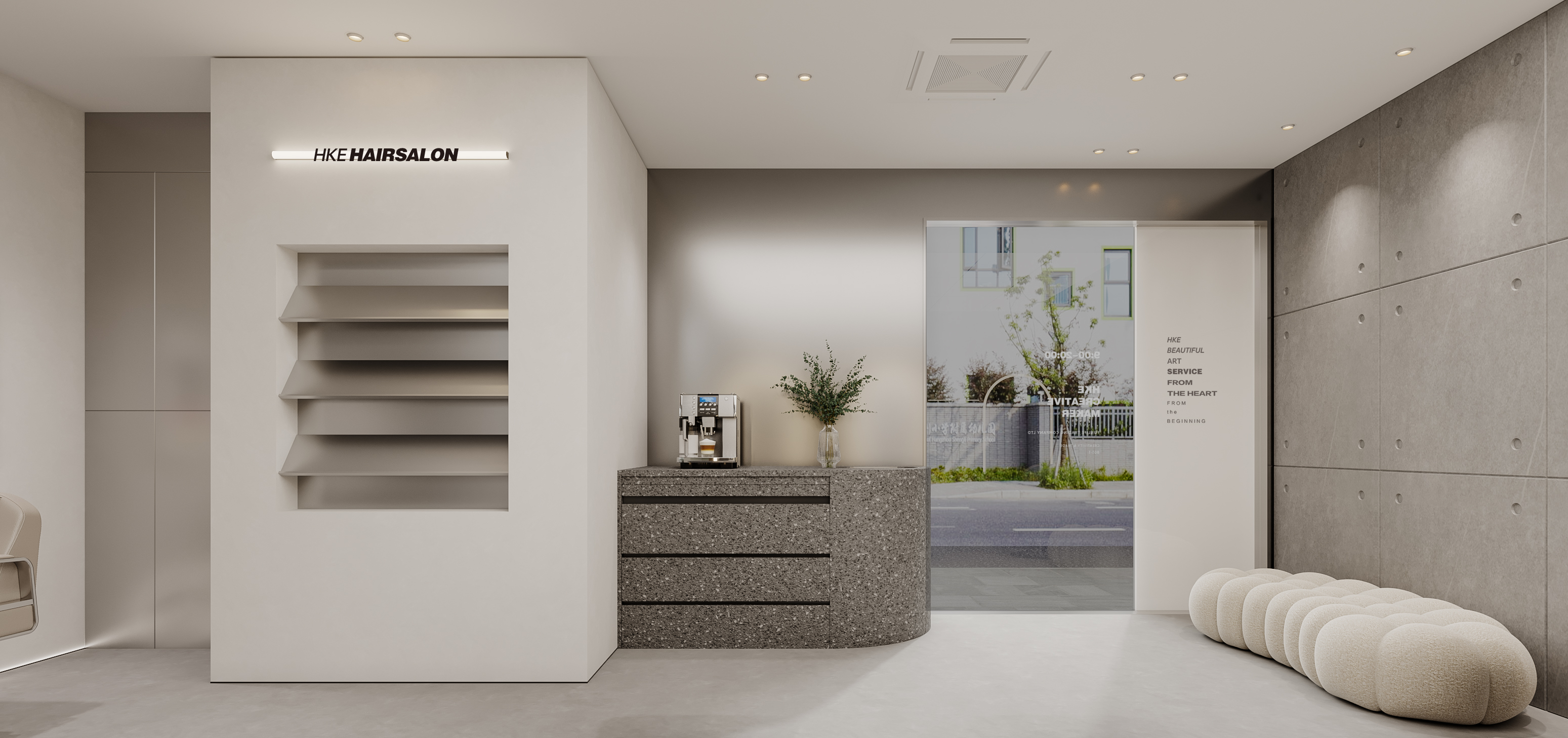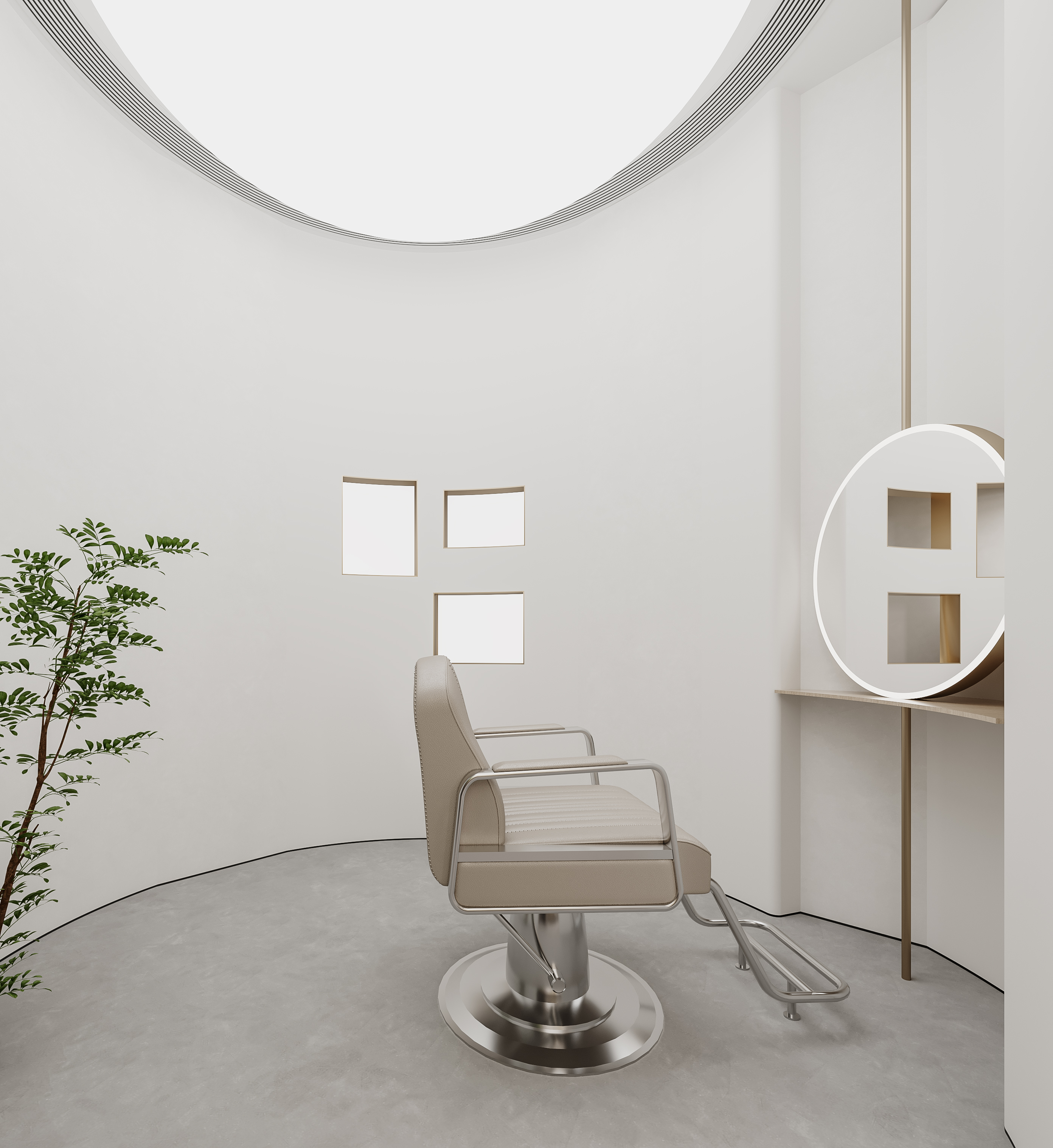 店内贯彻简约主义风格,运用简洁精致的材质与色调阐述整体空间。烫染区利用弧形镜面作为分隔,区别于方镜的棱角,更有女性的柔美感。再往里走去,洗发区利用玻璃隔离烫染区,既保证了室内空间的开放流动,又具有独特个性。